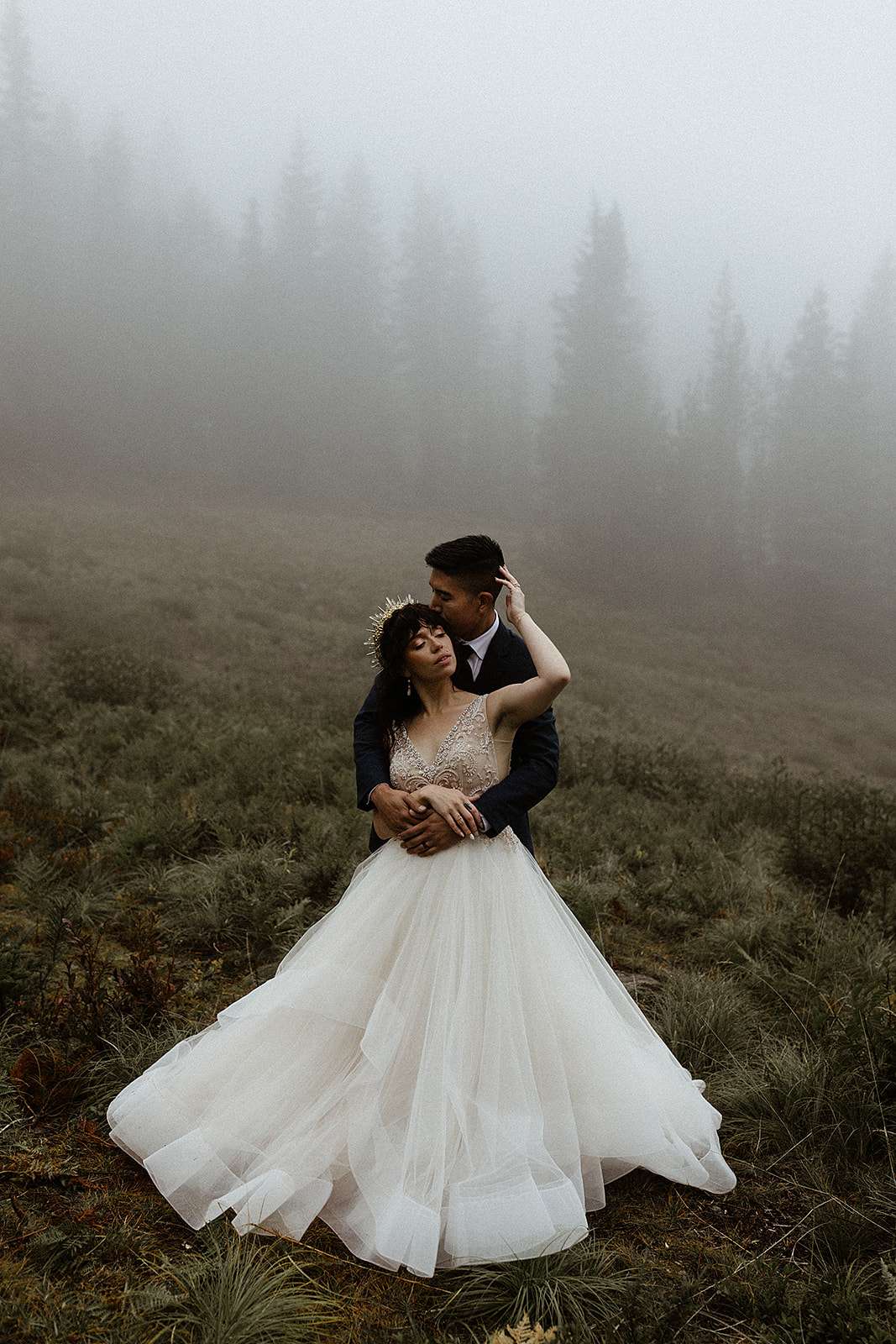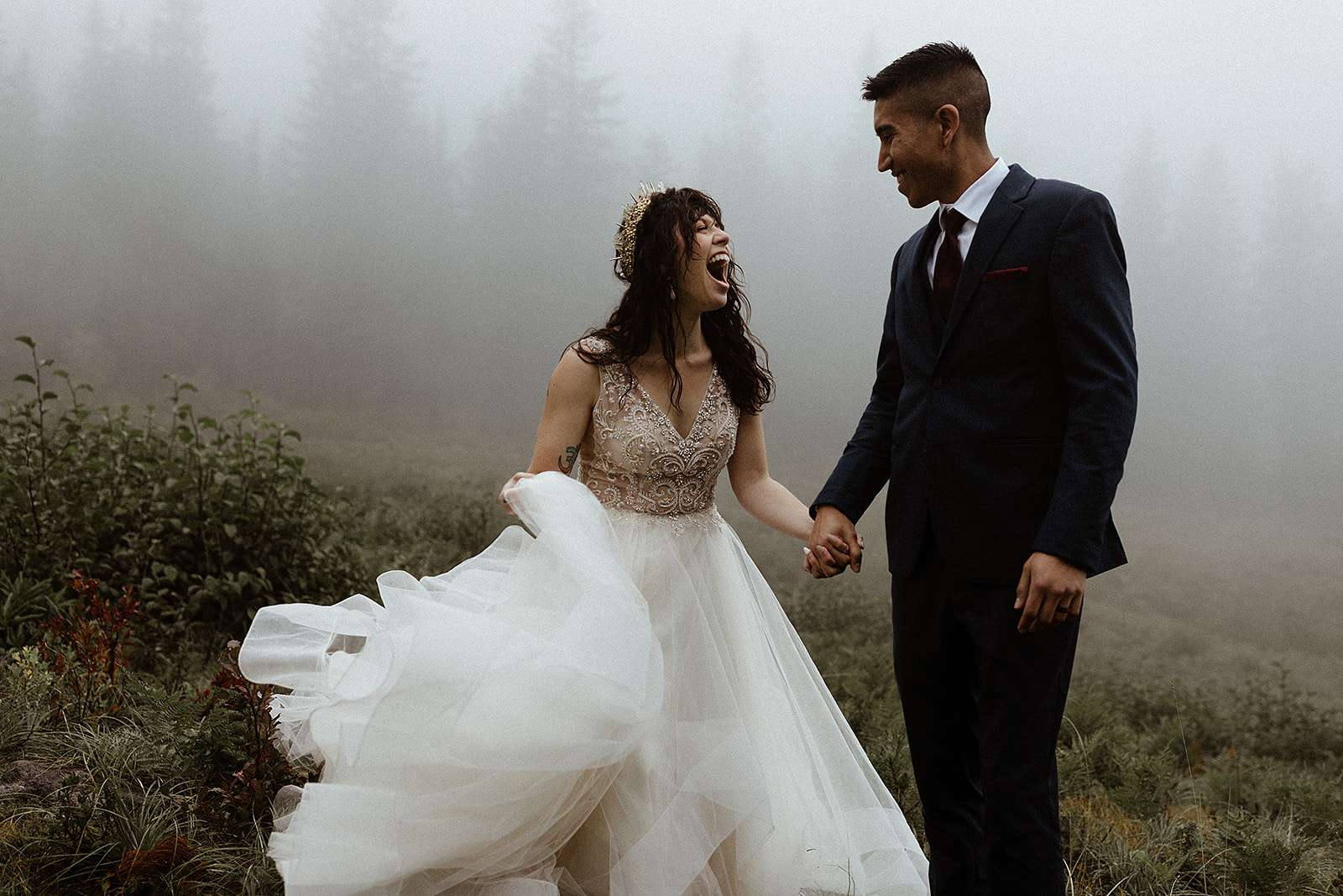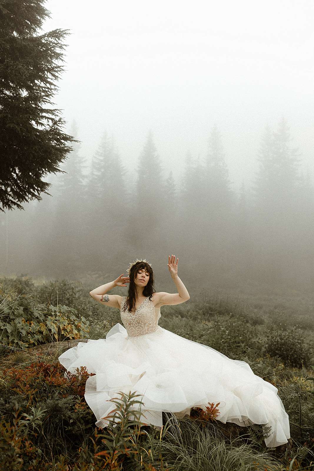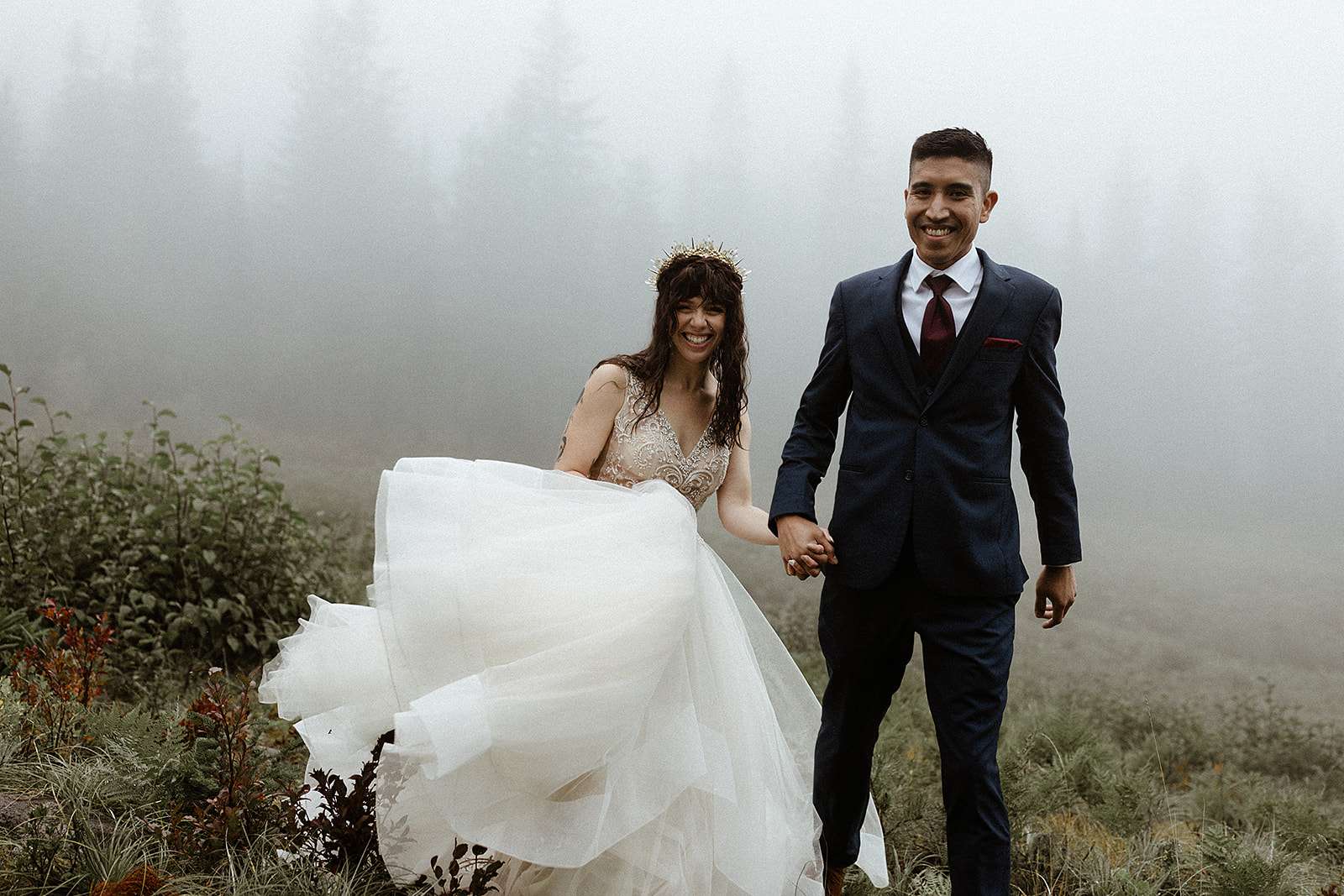 “I think there were a lot of things that made our wedding unique”, explained the bride. “We married a day before the equinox and the shift is season was extremely present (as I’m sure you could see by our foggy and rainy photos). We married on the side of a mountain overlooking a volcano (which unfortunately couldn’t be seen because of the fog). We were married on indigenous sacred land and when we arrived at the base of the mountain a Native tribe was having a ceremony asking for blessings from the earth for rain and protection for salmon during their travel in winter months.”