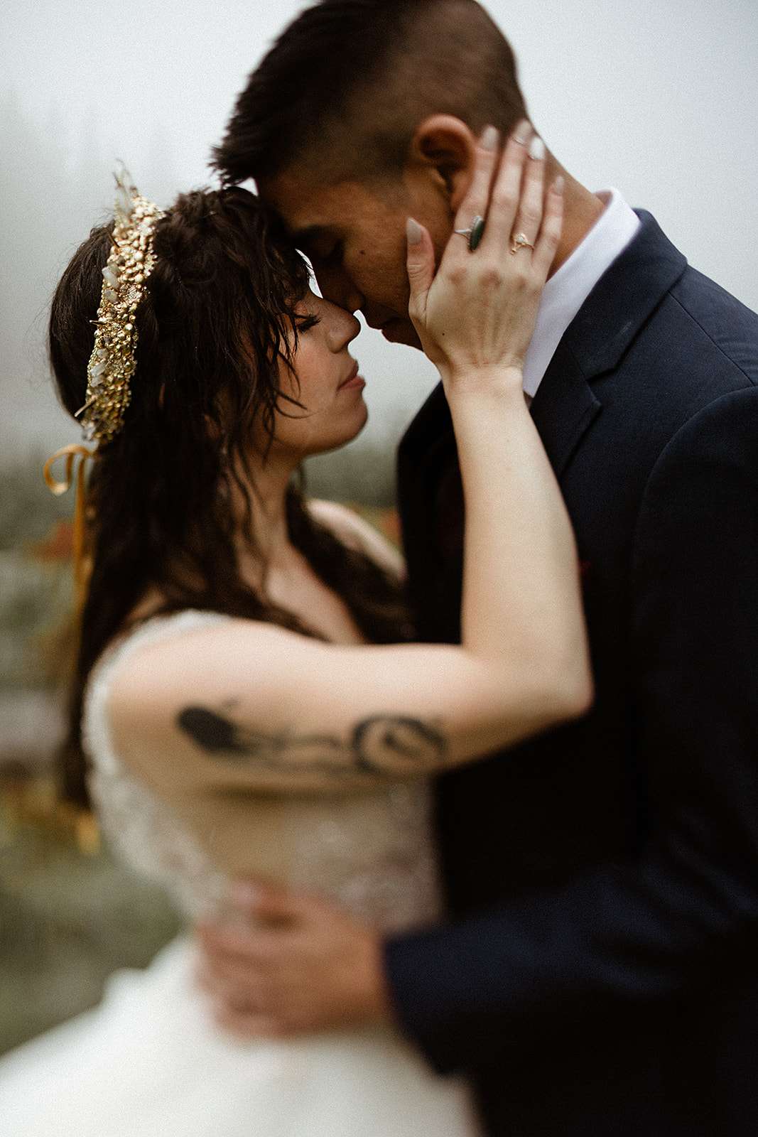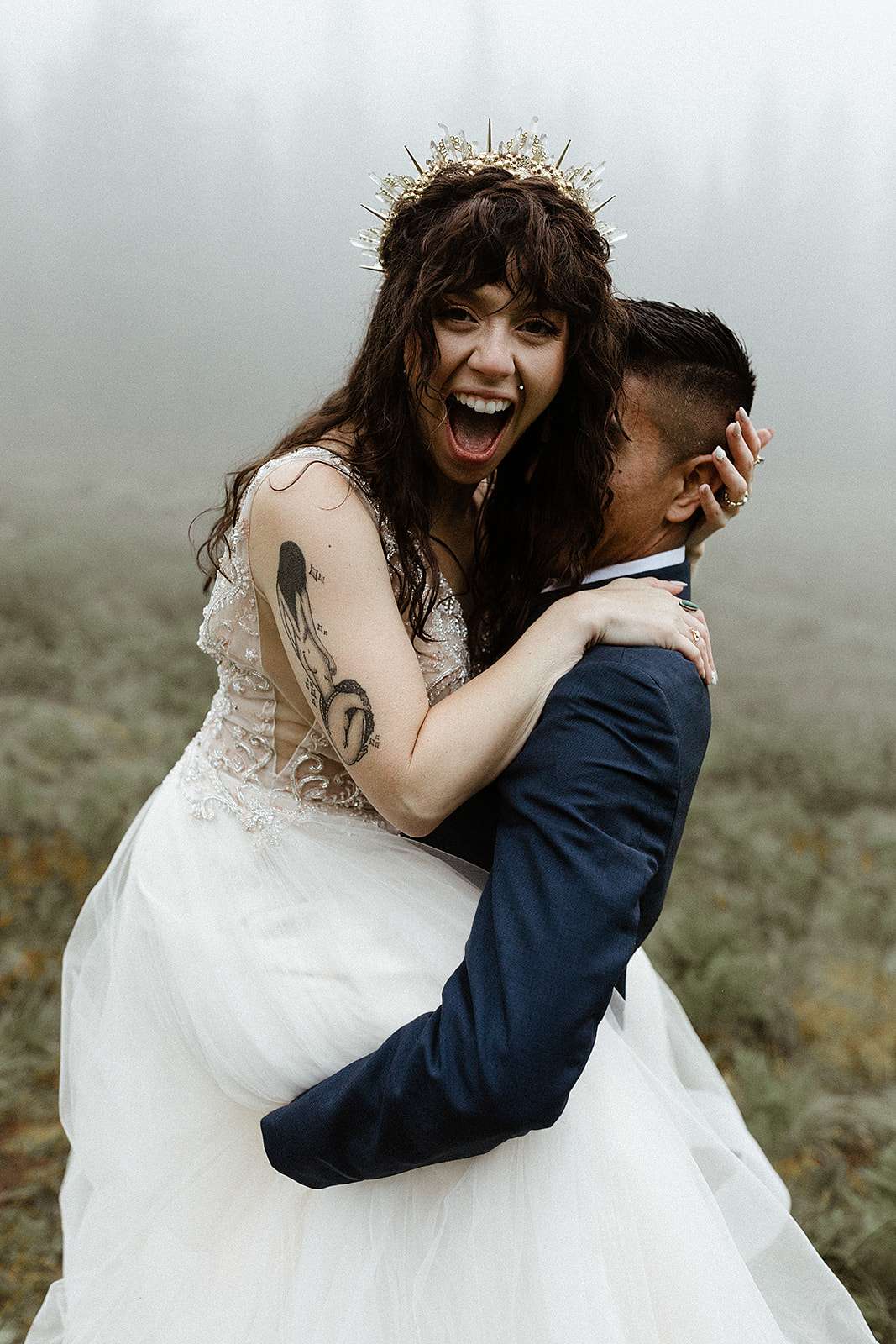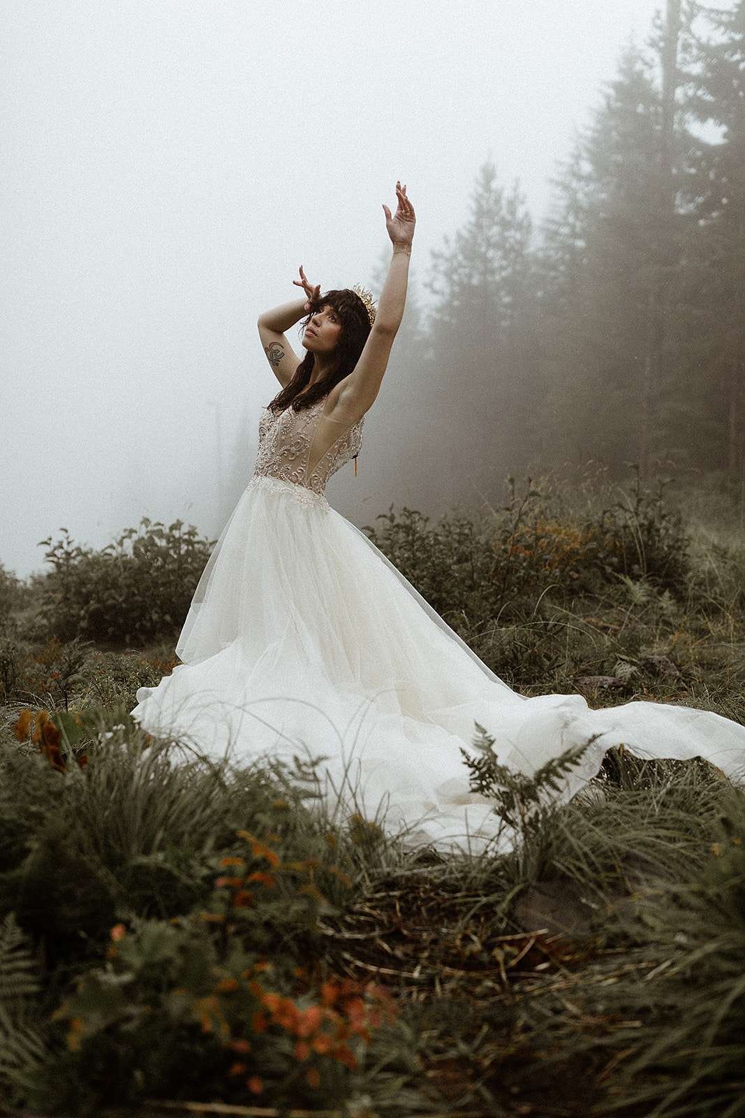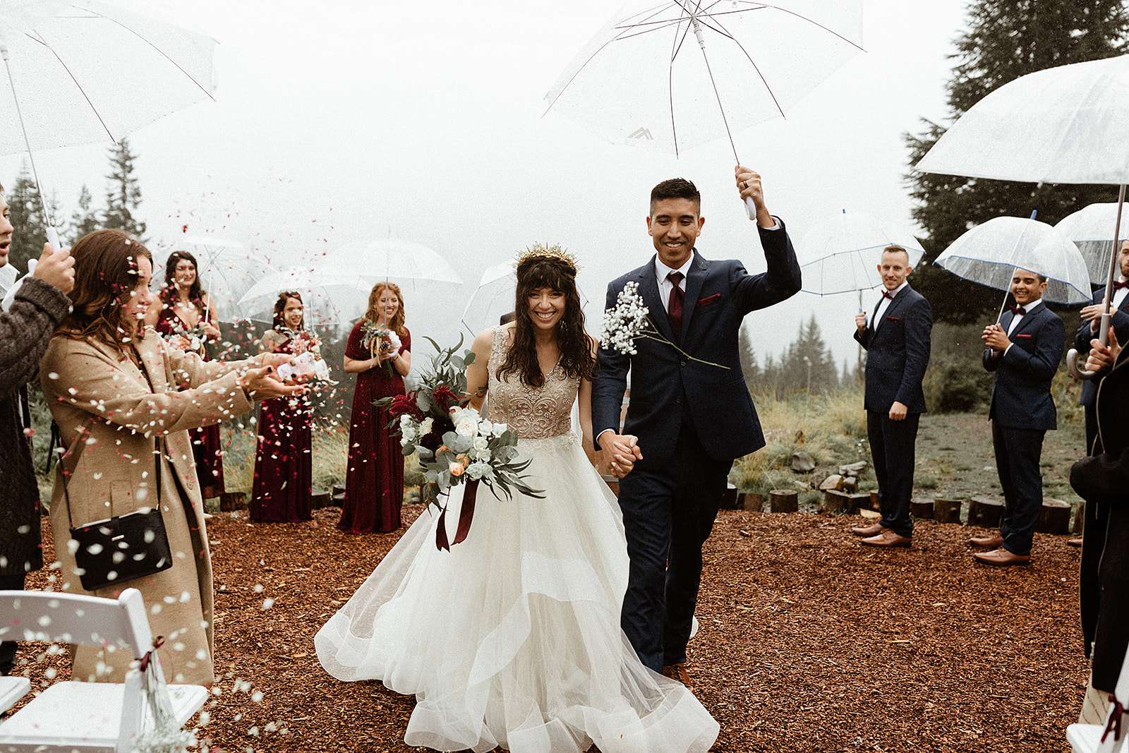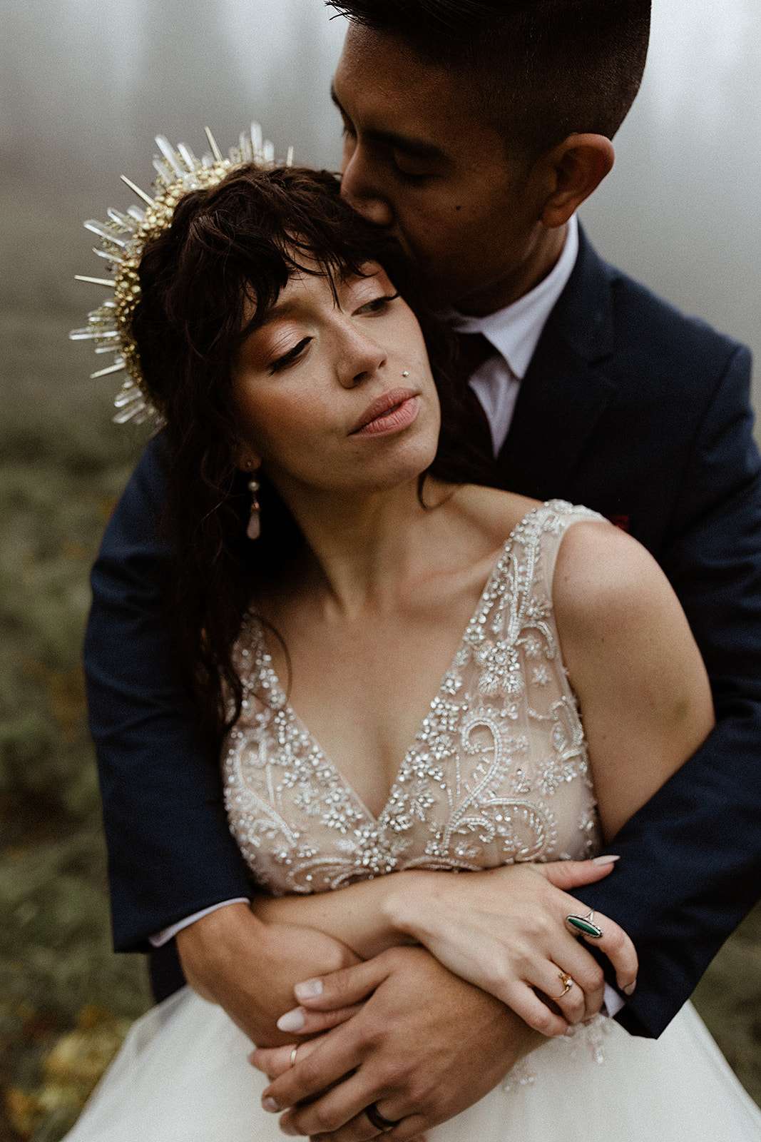 “I think there were a lot of things that made our wedding unique”, explained the bride. “We married a day before the equinox and the shift is season was extremely present (as I’m sure you could see by our foggy and rainy photos). We married on the side of a mountain overlooking a volcano (which unfortunately couldn’t be seen because of the fog). We were married on indigenous sacred land and when we arrived at the base of the mountain a Native tribe was having a ceremony asking for blessings from the earth for rain and protection for salmon during their travel in winter months.”