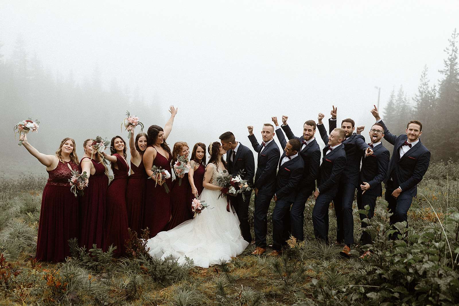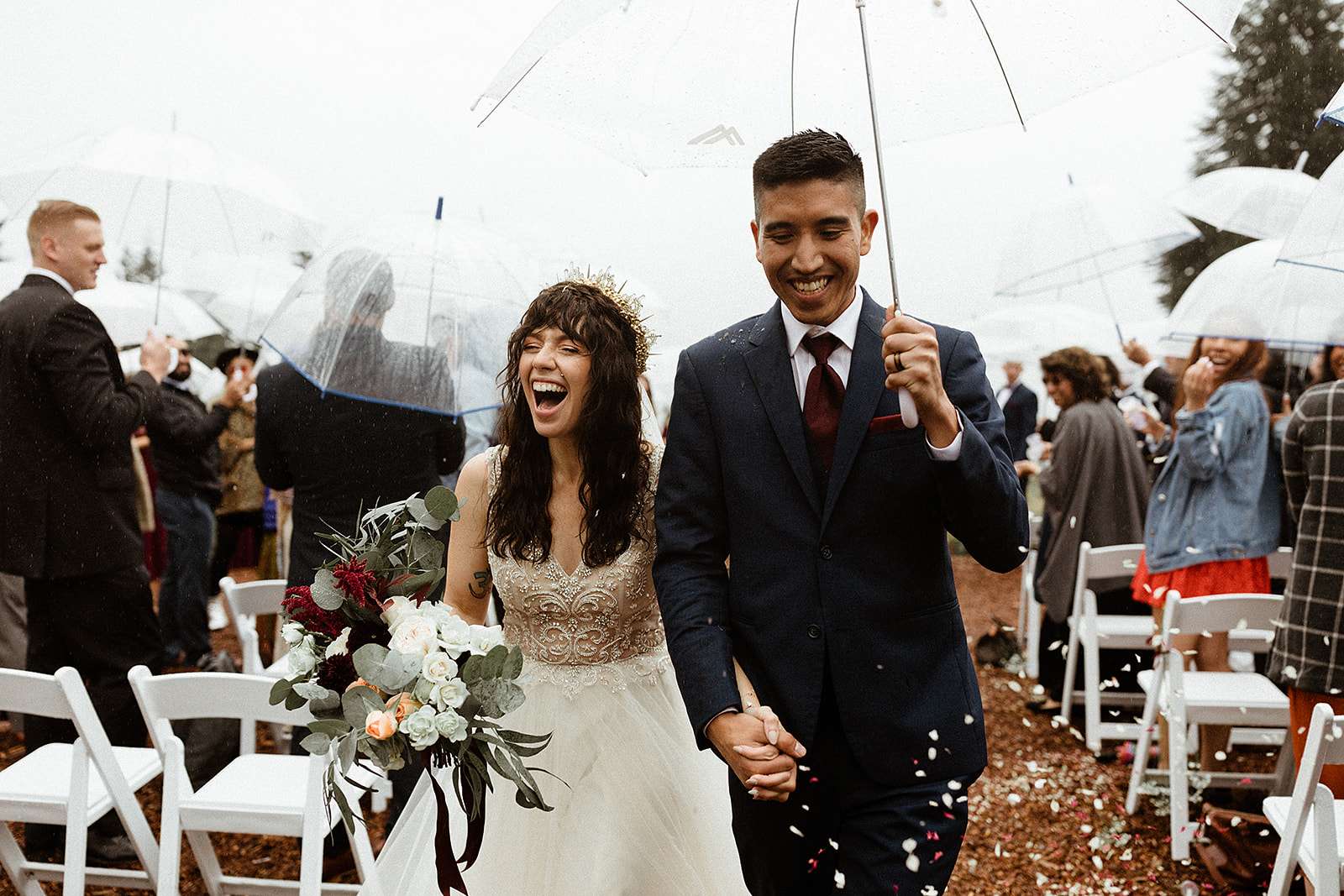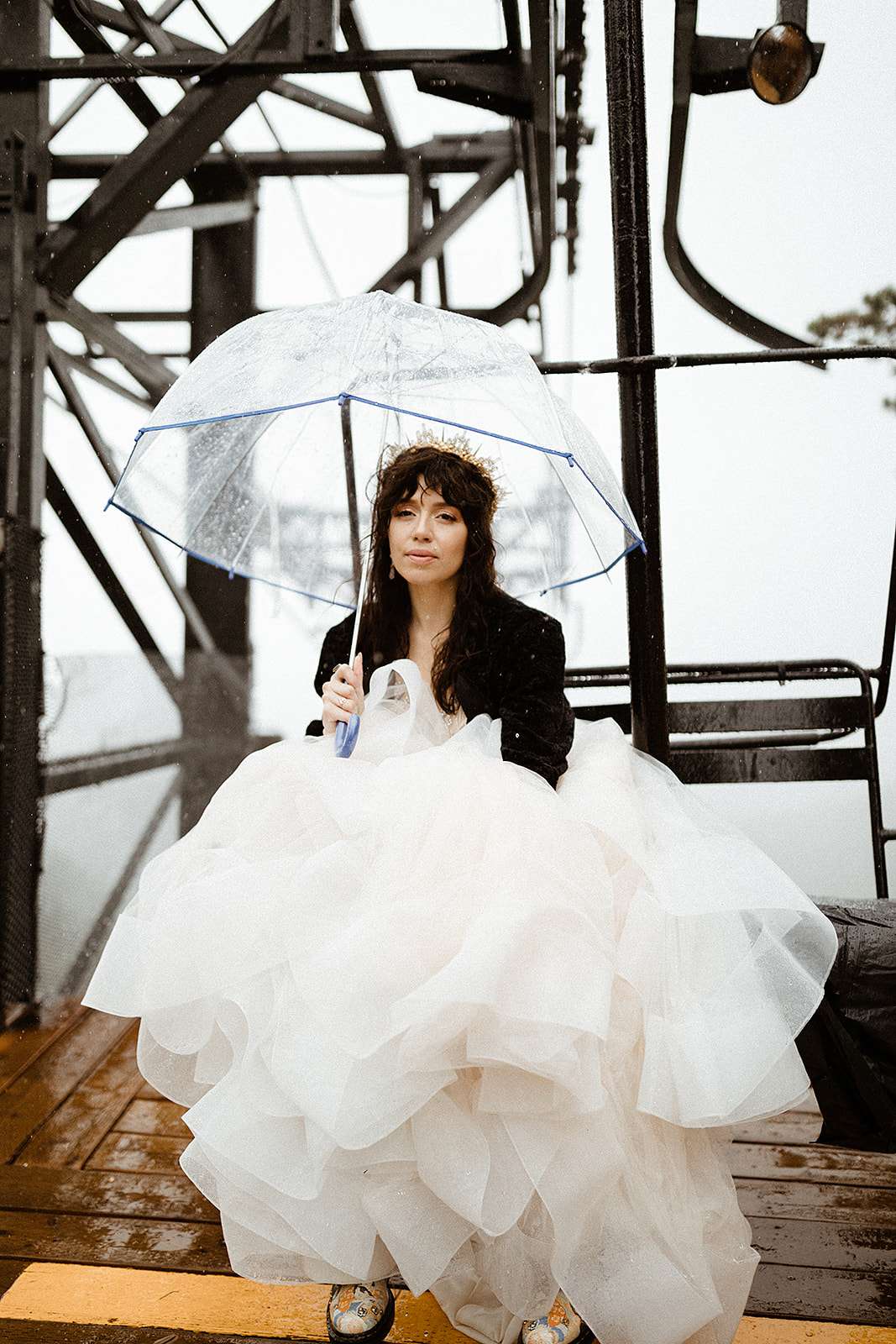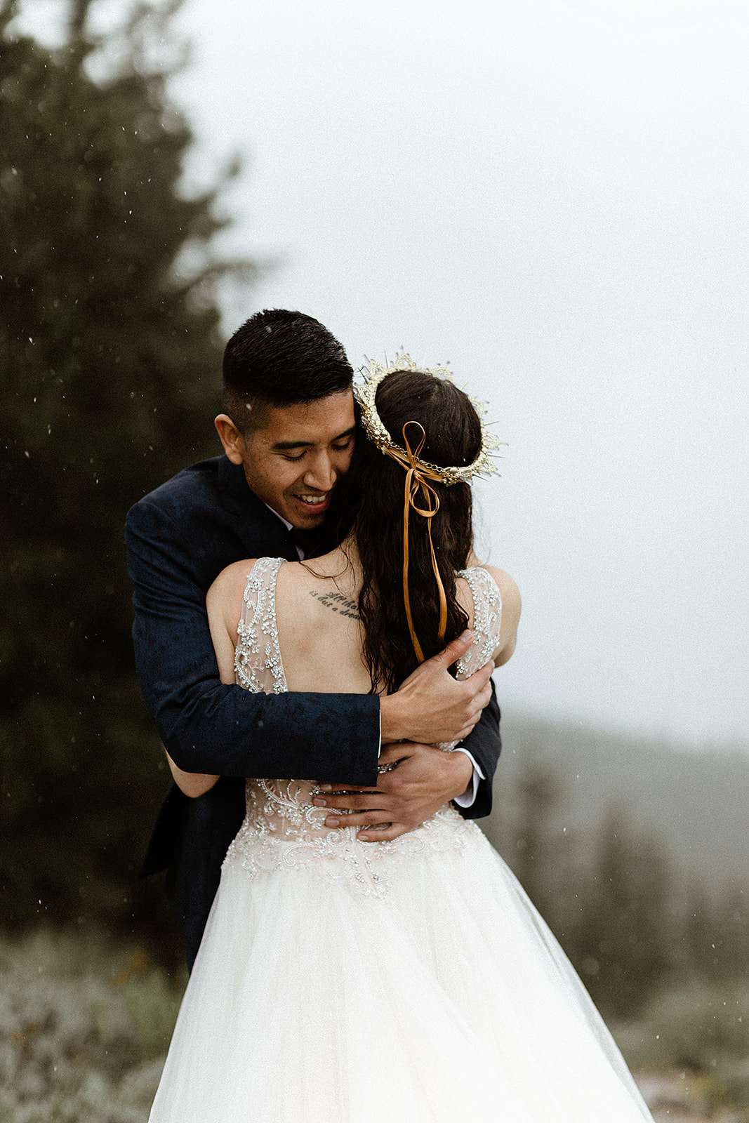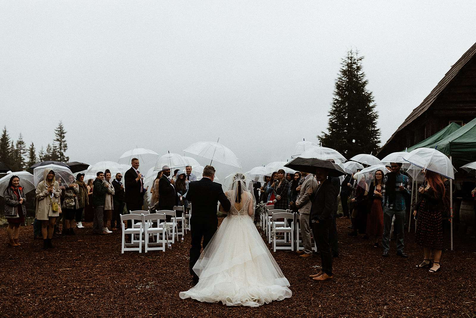 “I think there were a lot of things that made our wedding unique”, explained the bride. “We married a day before the equinox and the shift is season was extremely present (as I’m sure you could see by our foggy and rainy photos). We married on the side of a mountain overlooking a volcano (which unfortunately couldn’t be seen because of the fog). We were married on indigenous sacred land and when we arrived at the base of the mountain a Native tribe was having a ceremony asking for blessings from the earth for rain and protection for salmon during their travel in winter months.”