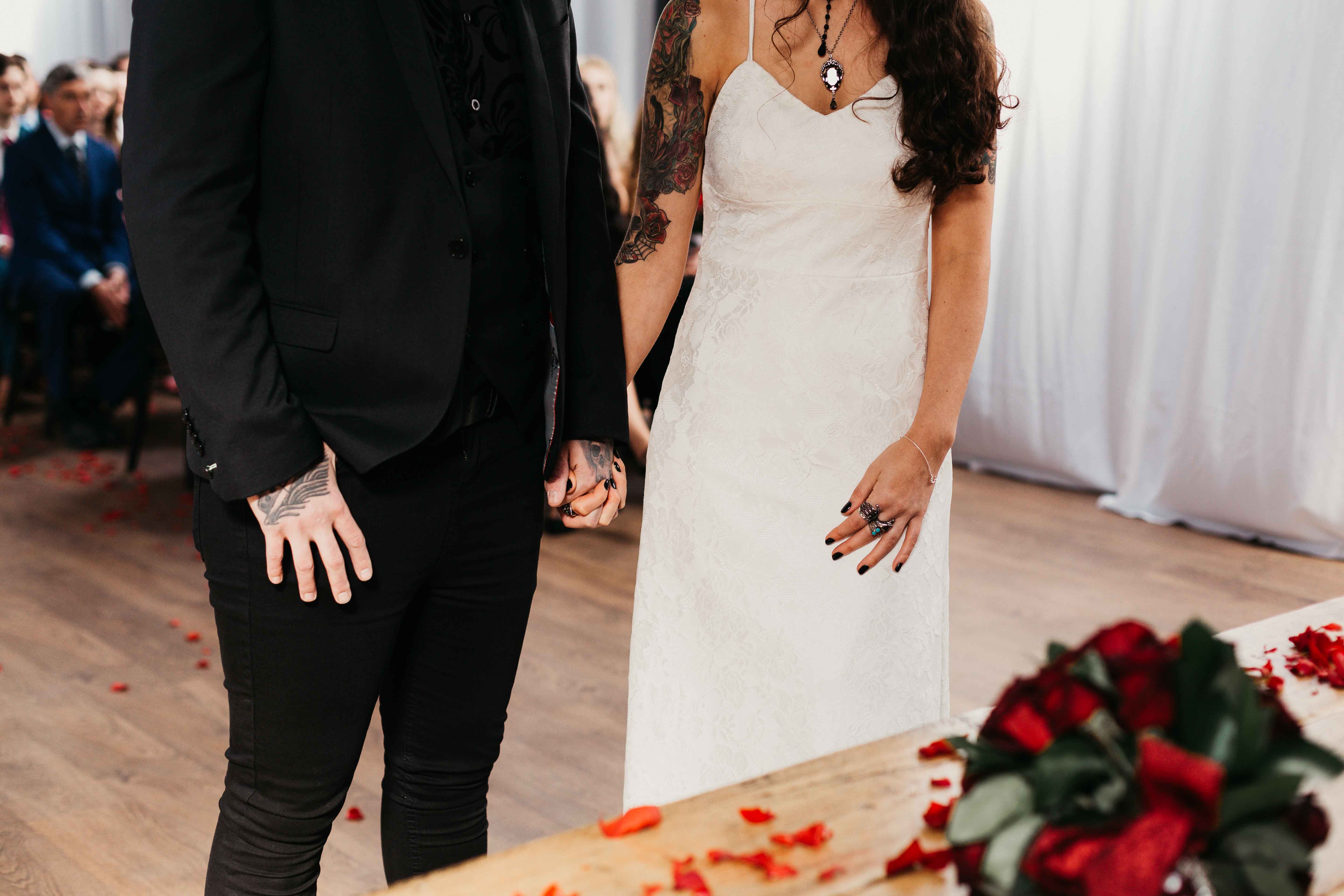 With a budget of £14,000, the couple were married at Deighton Lodge, a glam, bespoke barn wedding venue near York. With a relatively blank canvas to work with, they were able to bring in elements they love to bring their heavy metal day to life. They focused on including lots of skulls, black and leather throughout their decor. Jen had a bespoke dress made especially to show off her tattoos. They bought mini bottles and filled them with their favourite rum as wedding favours, and the groom used these as everyone’s toast drink during his speech.