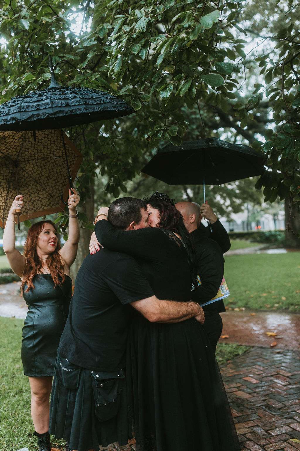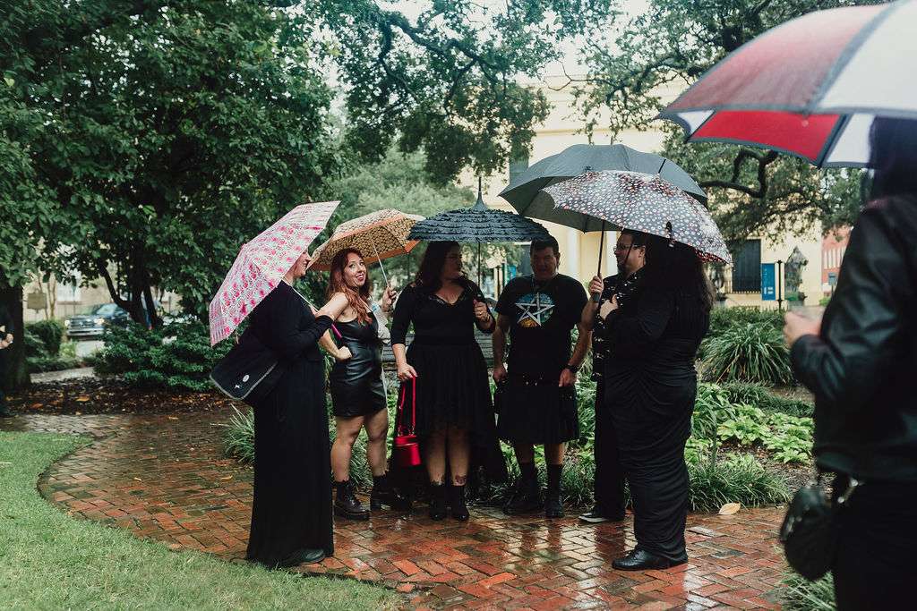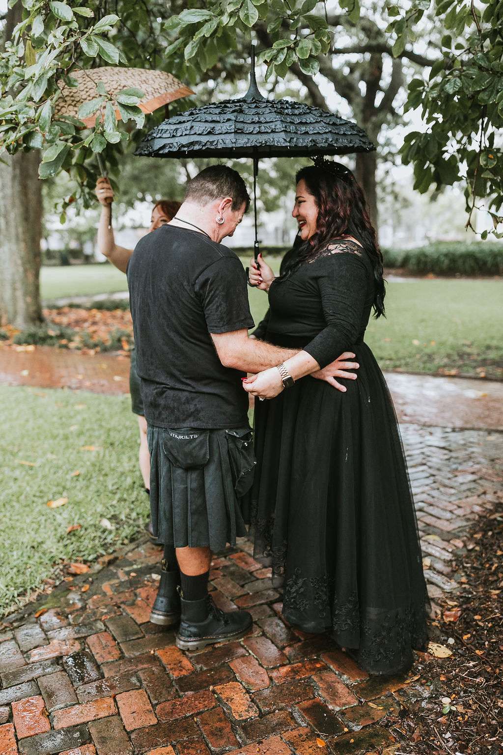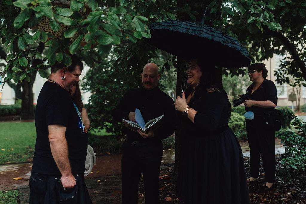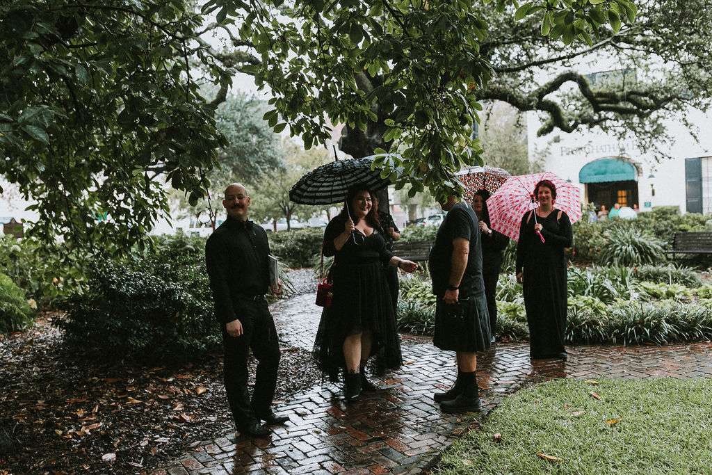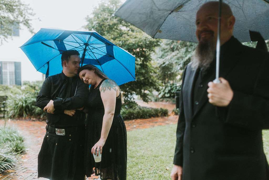 The ceremony itself also deviated from the traditional vows, and instead focused on a balanced partnership (“love, and honour, but let’s skip ‘obey’”), and reverence to nature. It was held outdoors in the pouring rain in one of Savannah’s many squares, and reflected their Pagan-Humanist beliefs. Natasha wrote the ceremony, inspired by various sources, and incorporated, among others, Scottish elements as a nod to Tm’s heritage. They were surrounded by their close friends who held umbrellas over them to shield them from the rain – their exchange of vows was quiet, intimate and accompanied by plenty of tears.