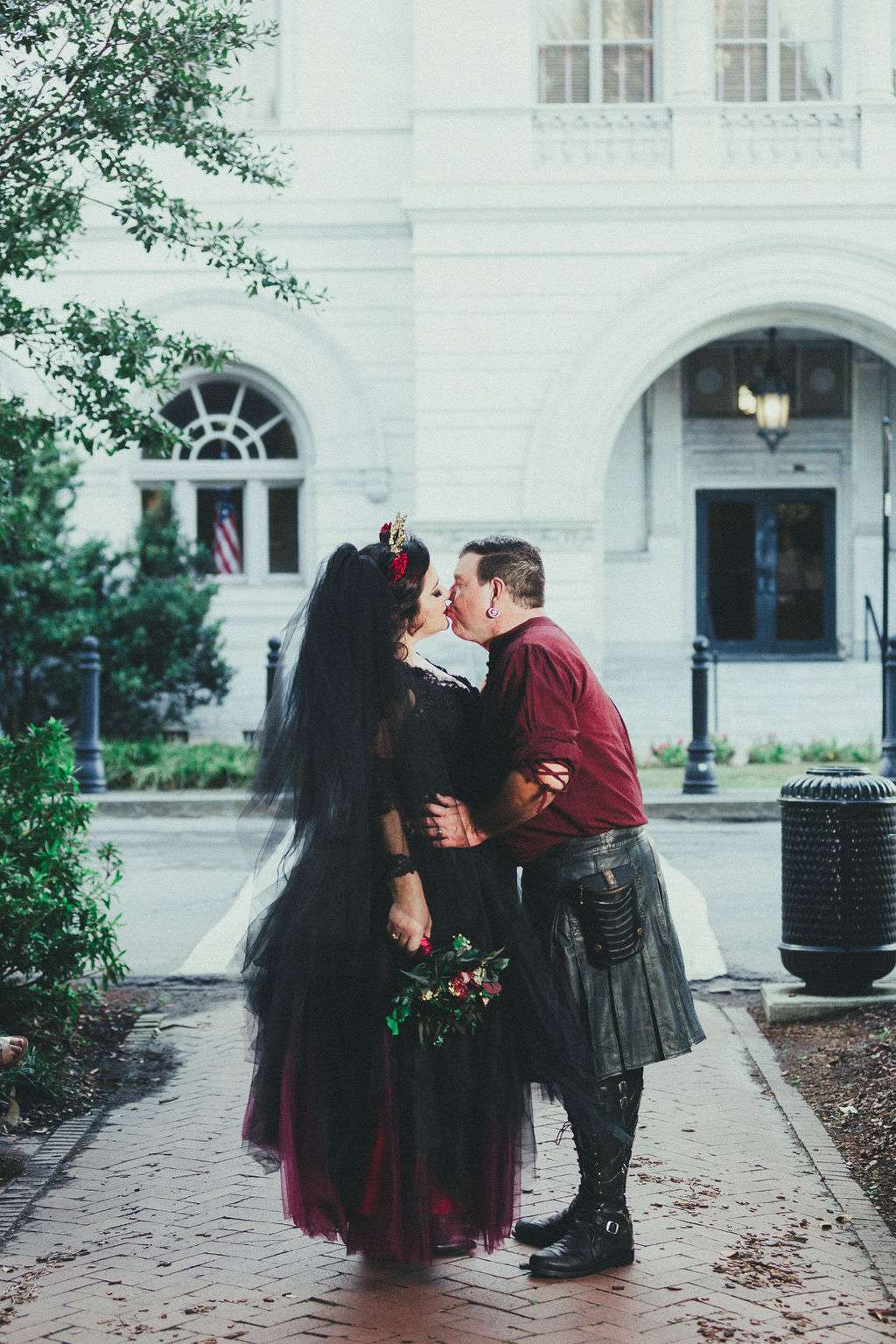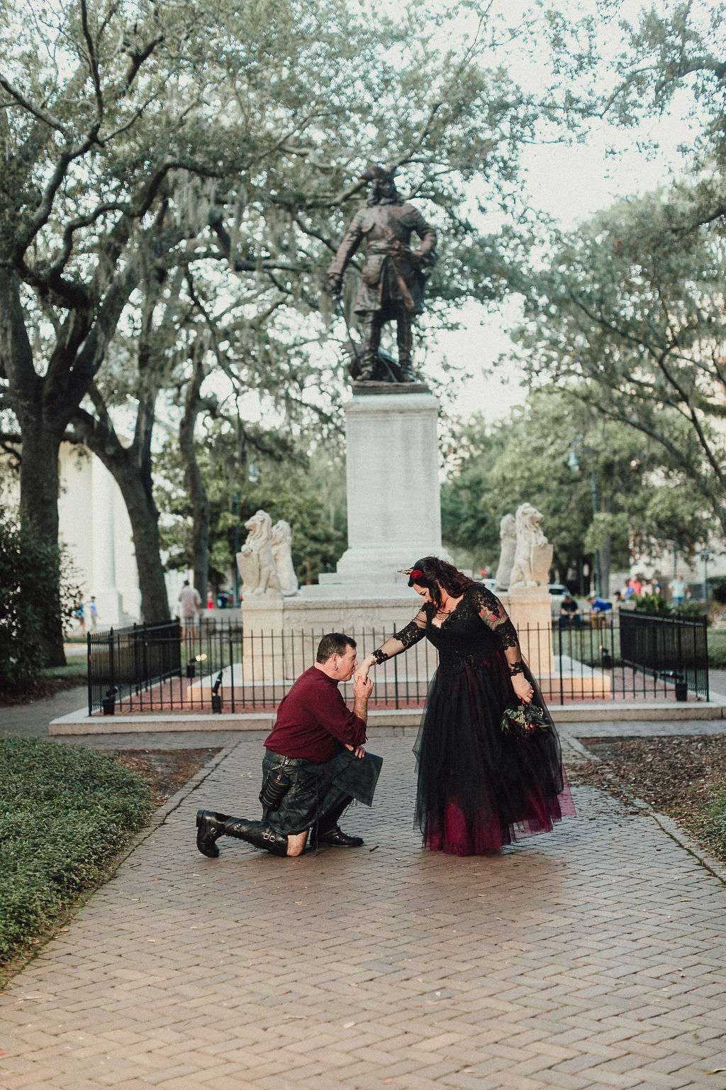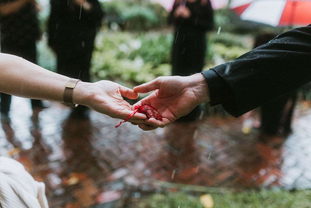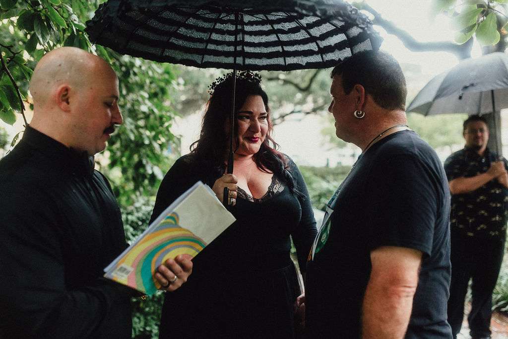 The ceremony itself also deviated from the traditional vows, and instead focused on a balanced partnership (“love, and honour, but let’s skip ‘obey’”), and reverence to nature. It was held outdoors in the pouring rain in one of Savannah’s many squares, and reflected their Pagan-Humanist beliefs. Natasha wrote the ceremony, inspired by various sources, and incorporated, among others, Scottish elements as a nod to Tm’s heritage. They were surrounded by their close friends who held umbrellas over them to shield them from the rain – their exchange of vows was quiet, intimate and accompanied by plenty of tears.