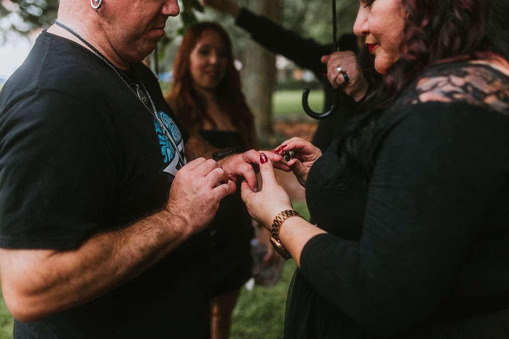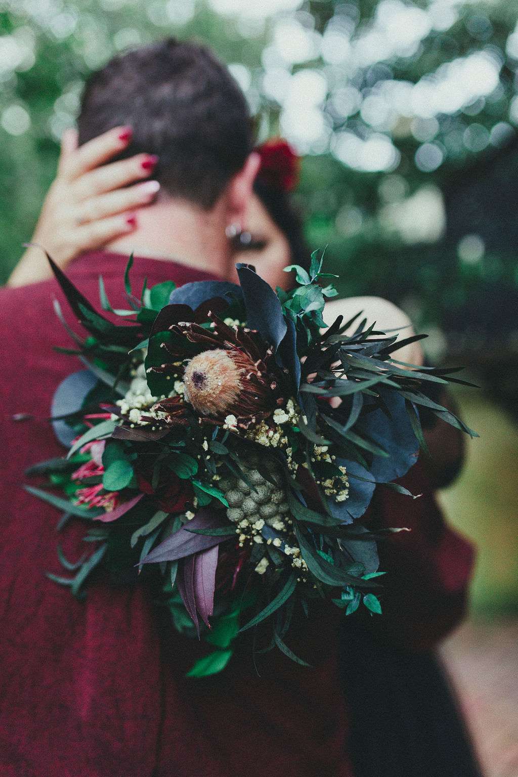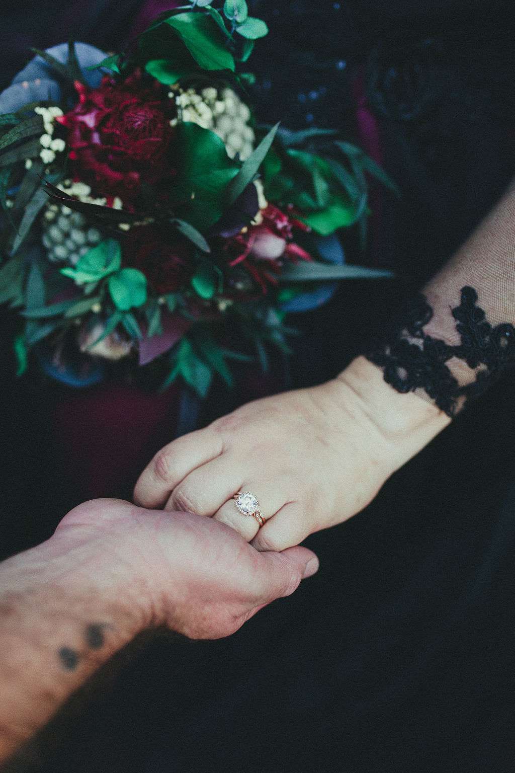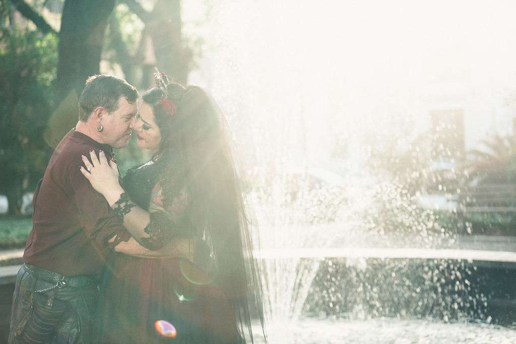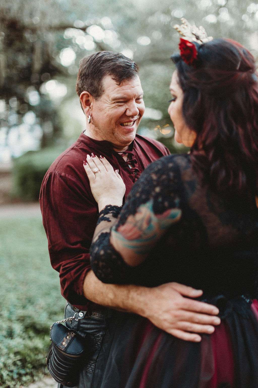 The ceremony itself also deviated from the traditional vows, and instead focused on a balanced partnership (“love, and honour, but let’s skip ‘obey’”), and reverence to nature. It was held outdoors in the pouring rain in one of Savannah’s many squares, and reflected their Pagan-Humanist beliefs. Natasha wrote the ceremony, inspired by various sources, and incorporated, among others, Scottish elements as a nod to Tm’s heritage. They were surrounded by their close friends who held umbrellas over them to shield them from the rain – their exchange of vows was quiet, intimate and accompanied by plenty of tears.