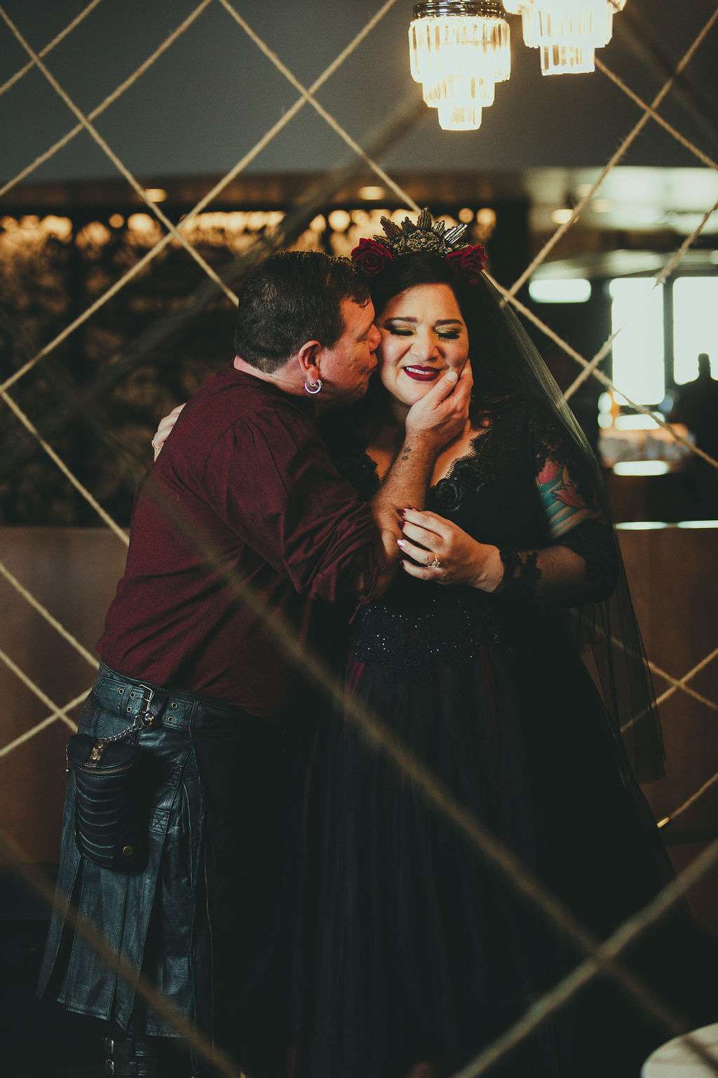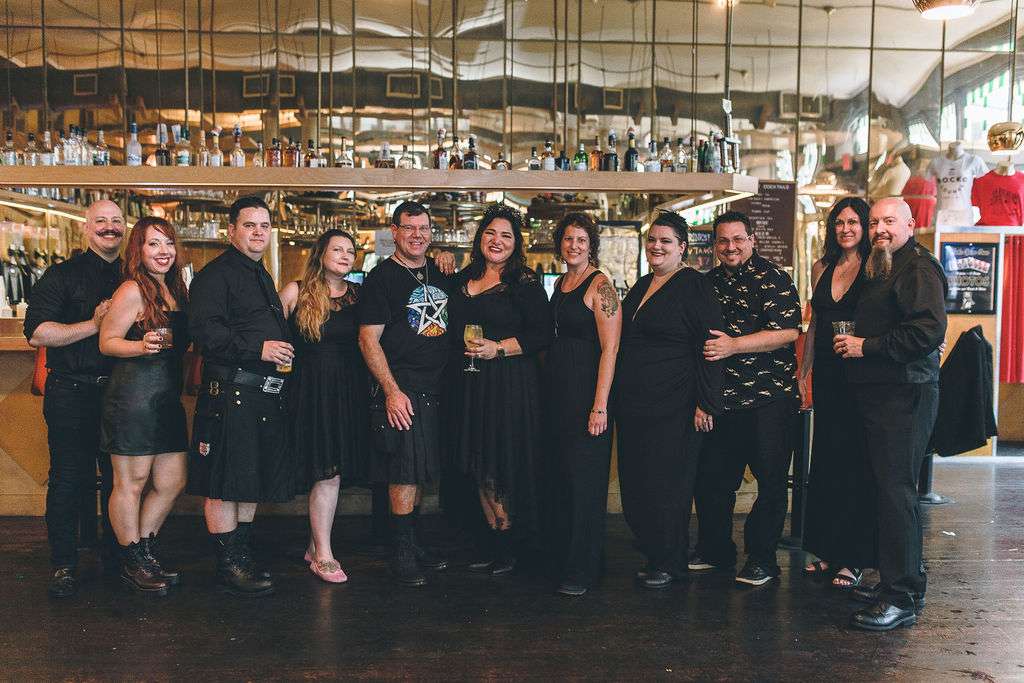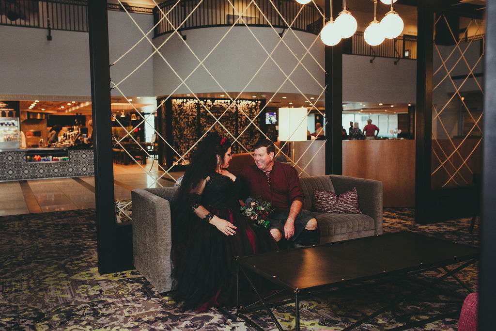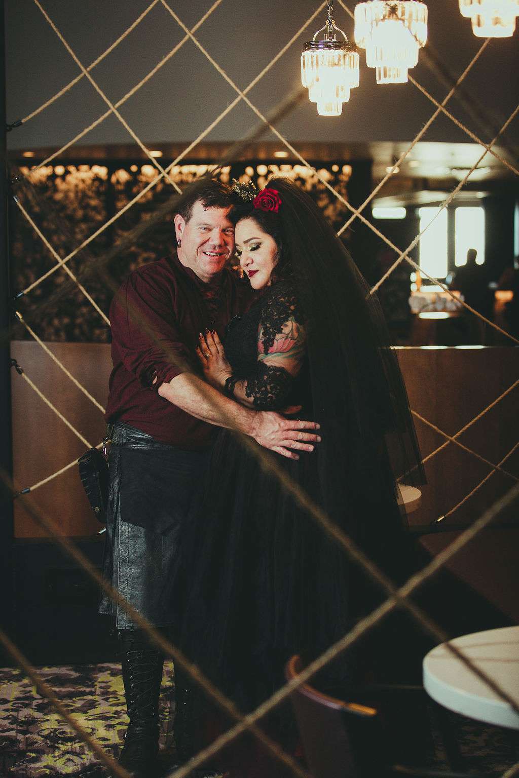 They skipped most traditional wedding elements like invitations, a cake and gifts, instead focusing on creating a memorable experience to enjoy with their friends. Rather than a formal reception, the ceremony was followed by drinks at a nearby lounge, then dinner and they wrapped up the evening with a haunted pub crawl.