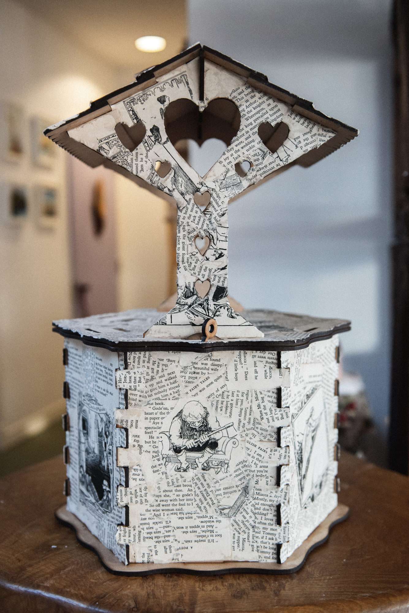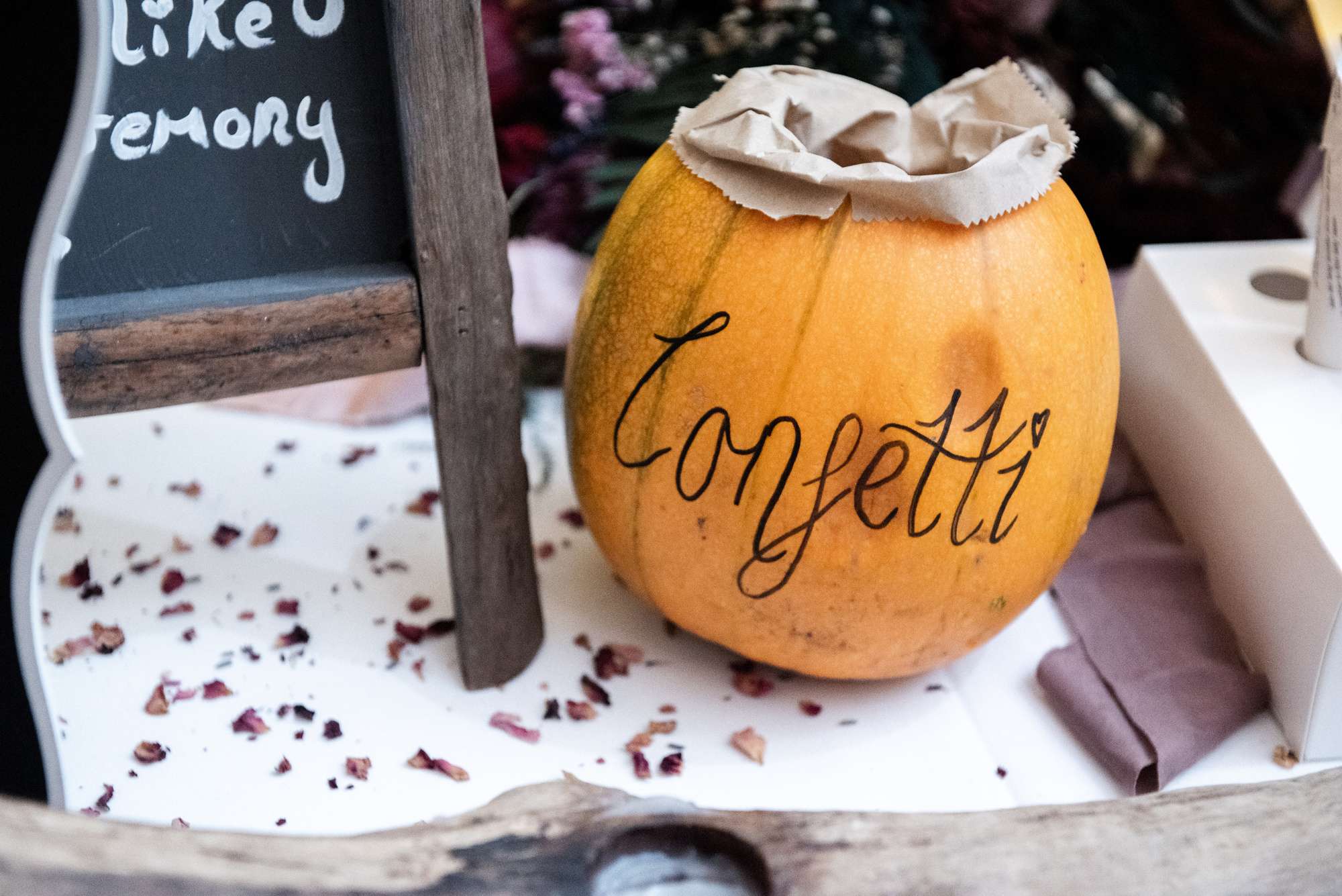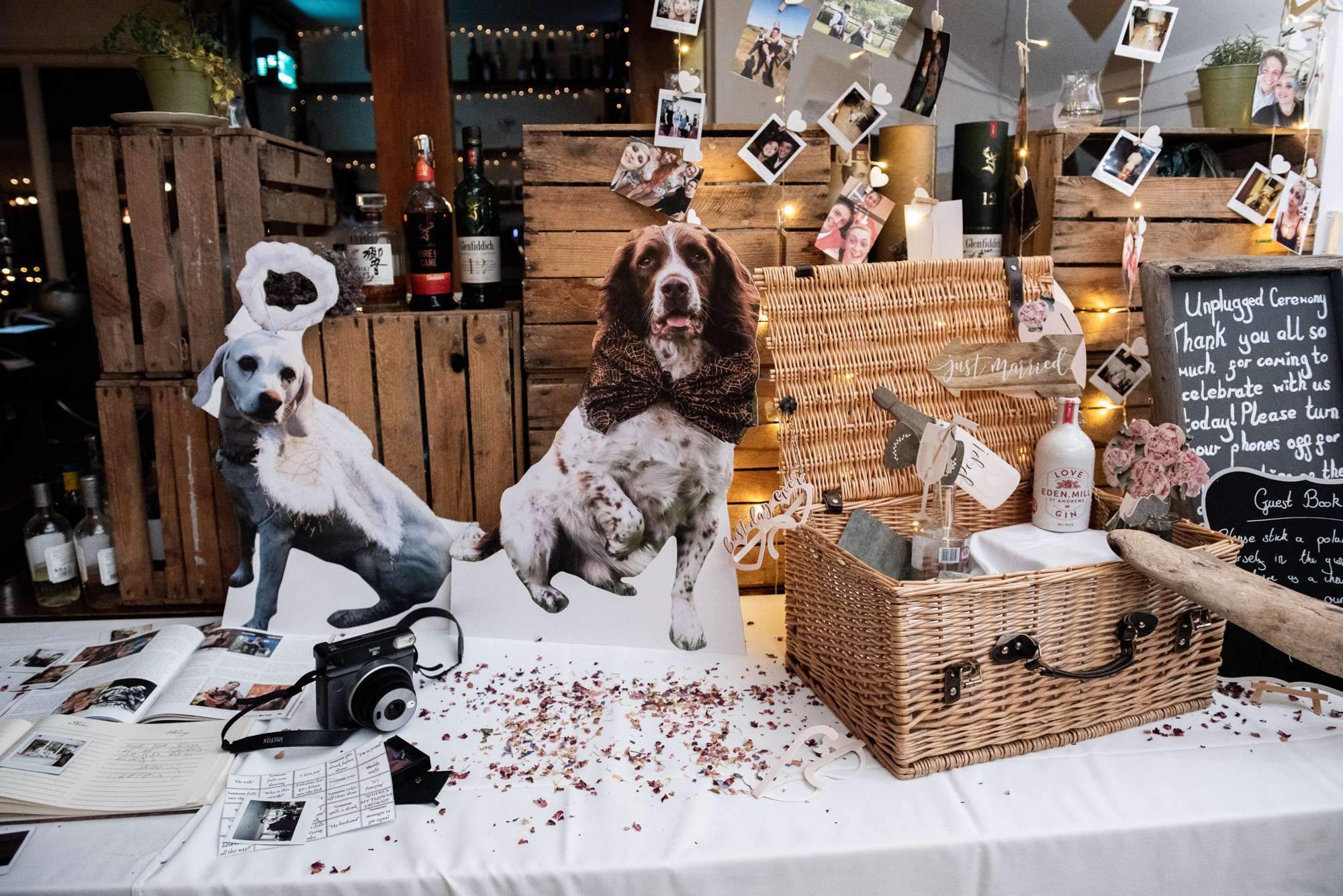 “My dress was a nice dusky rose colour with a pale blue top corset to combine the colours in our two family tartans”, she explained. “I also LOVE fairies and fairytales, and my favourite story in the whole world is Peter Pan, so I painted an amended Peter Pan quote on my shoes, and asked Rosie to sew a crescent moon with some stars, and the second star to the right to be bigger than the rest as a reference. We also decorated the wishing well with pages from a fairy story book we found in a charity shop when we went to give notice, and used the same book to make our confetti cones.”
