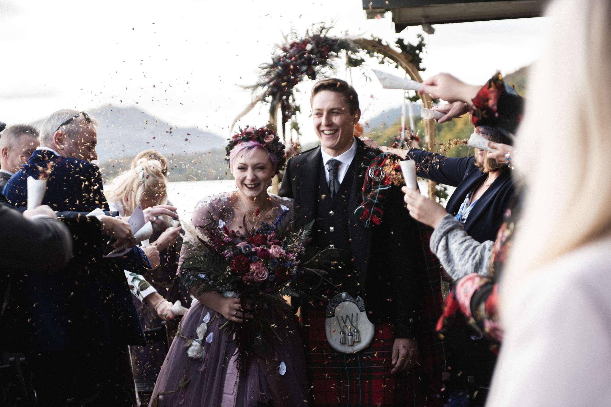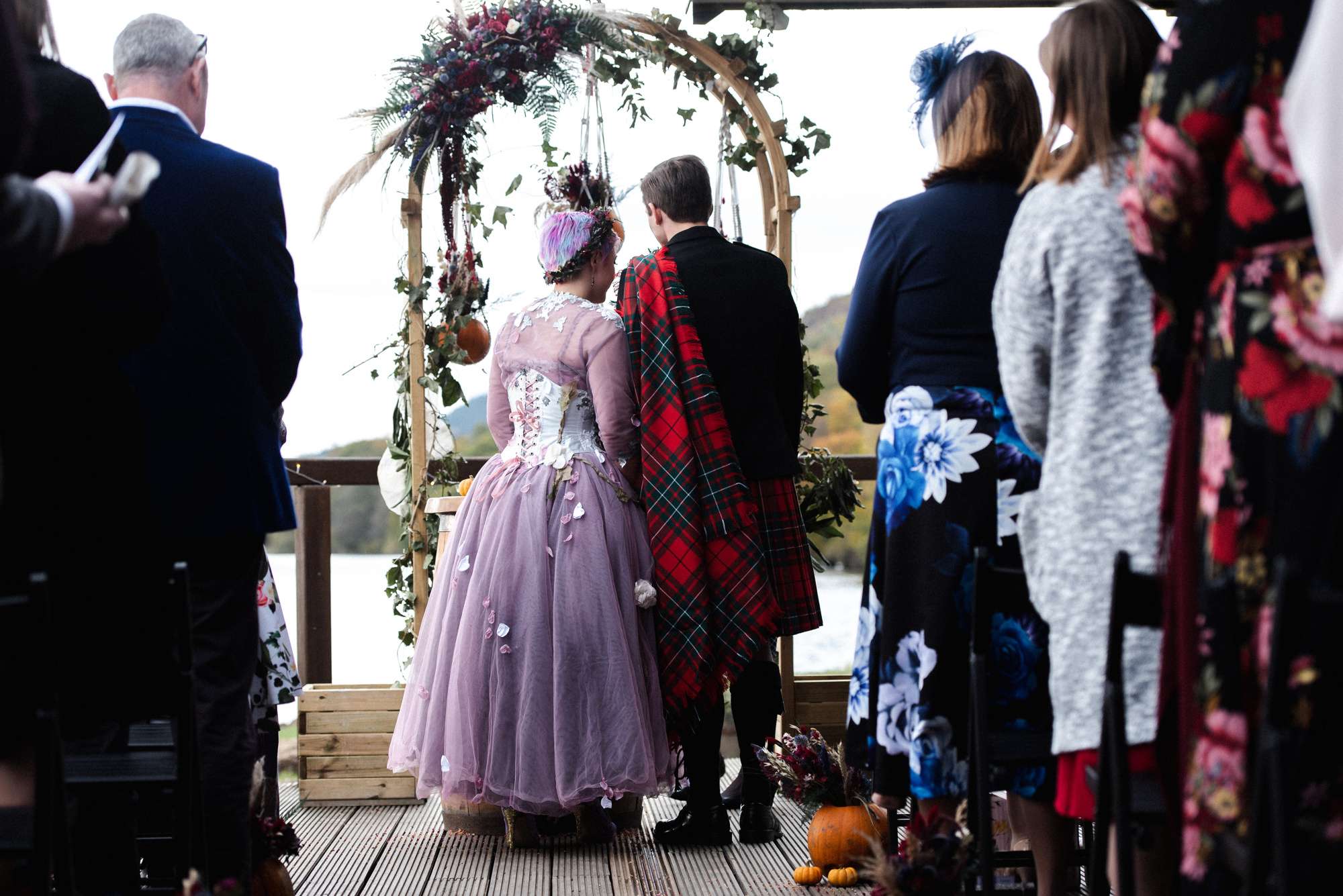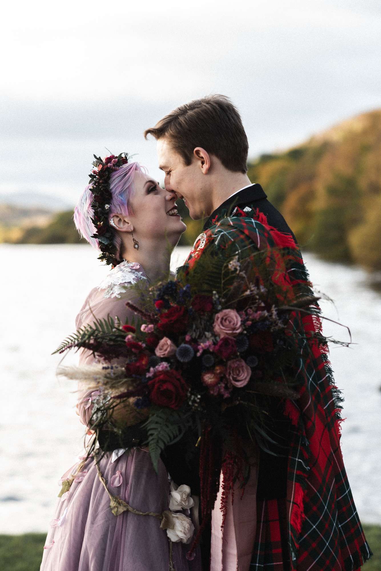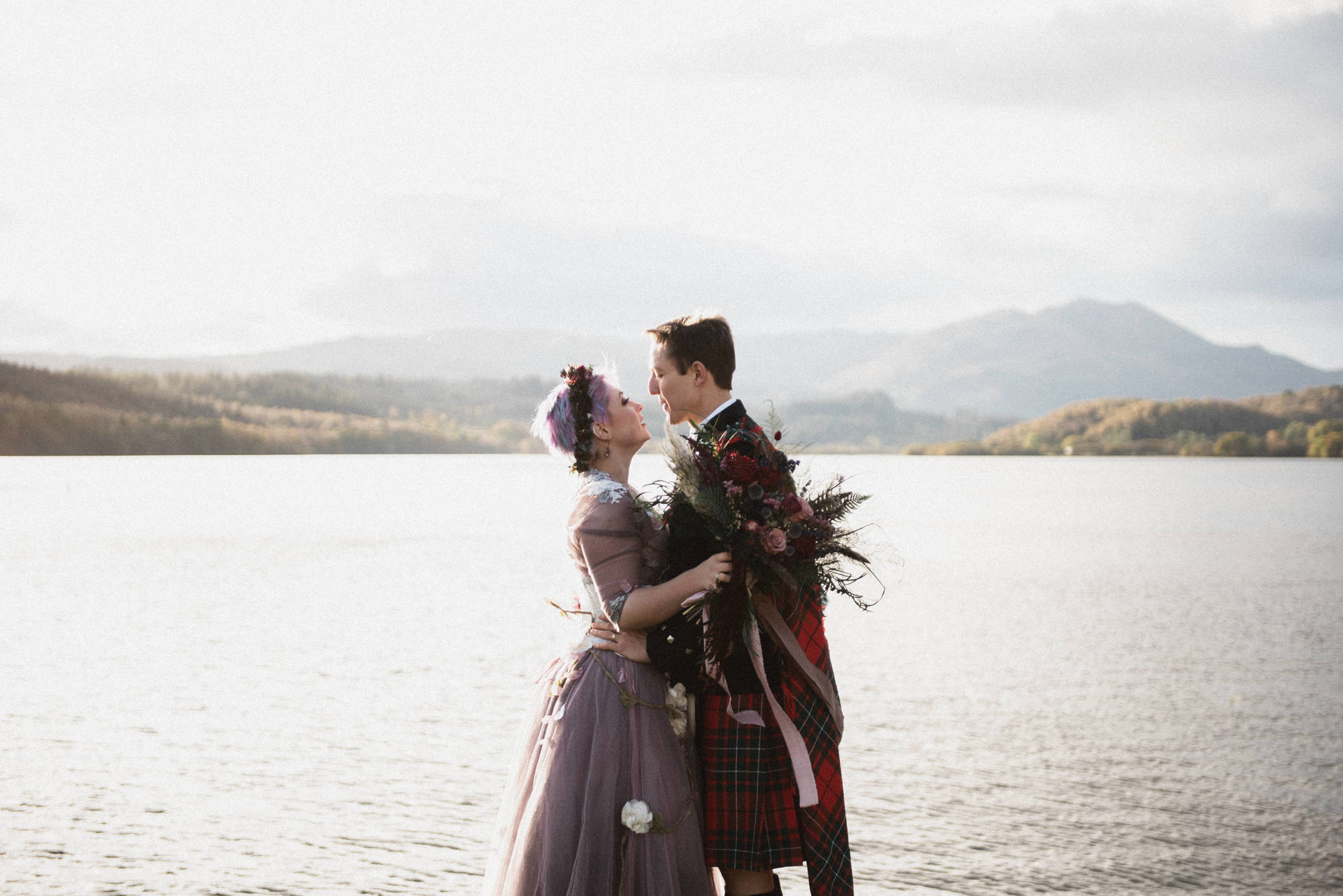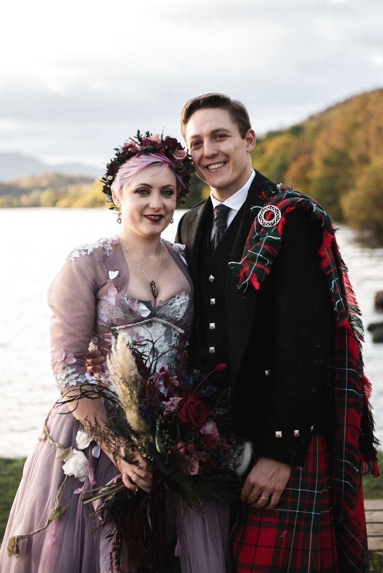 They chose Venachar Lochside as the location for their stunning October wedding and Mazz and Alex made all their decisions for the day based on what did or did not spark joy. The bride wore a full purple/ dusky rose ensemble – from her Rosie Red Corsetry dress, painted shoes (which she did herself!) and even her freshly dyed hair. The flowers were a mix of purple and red, to compliment Alex’ tartan, and they had pumpkins all over the place to reflect the season.