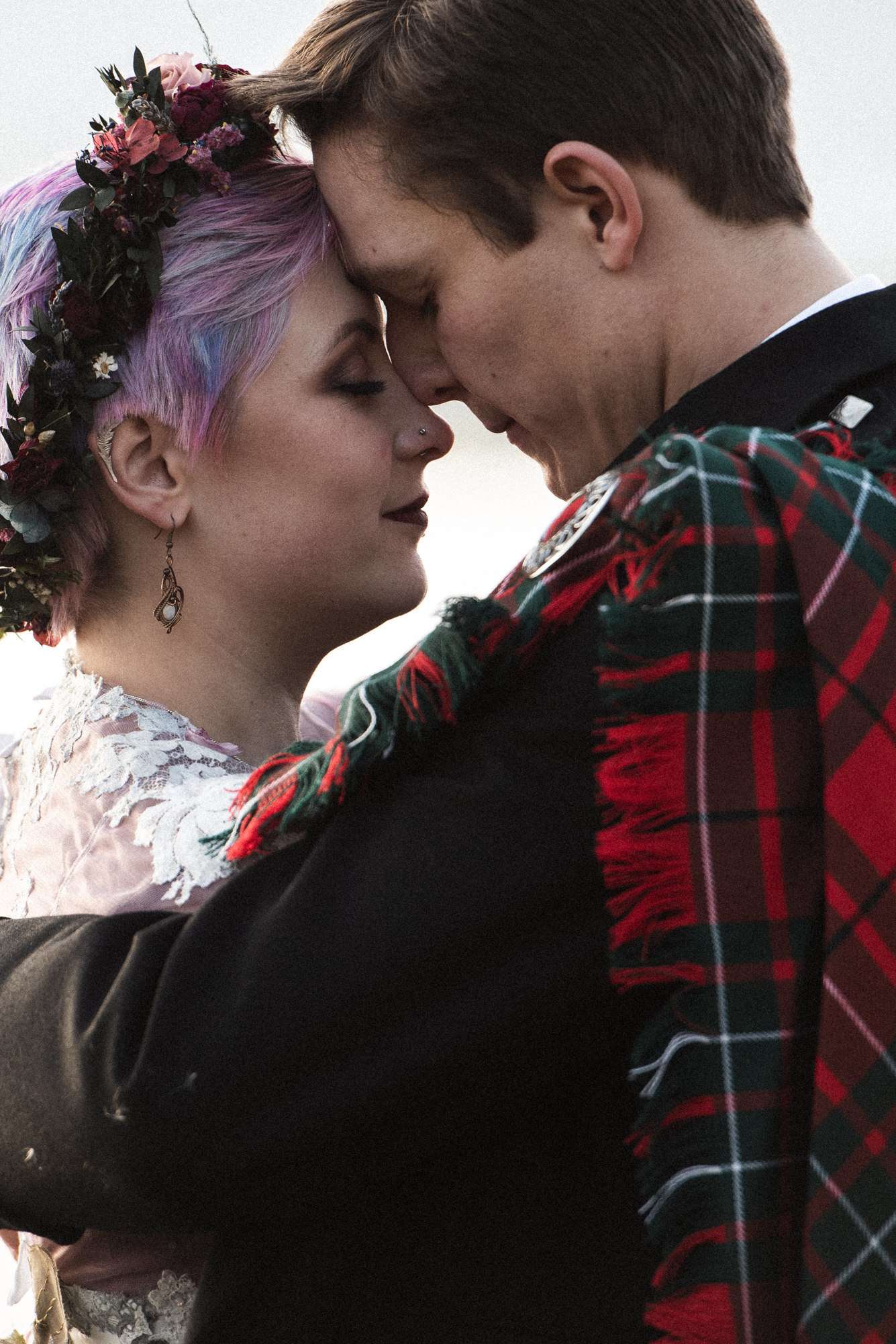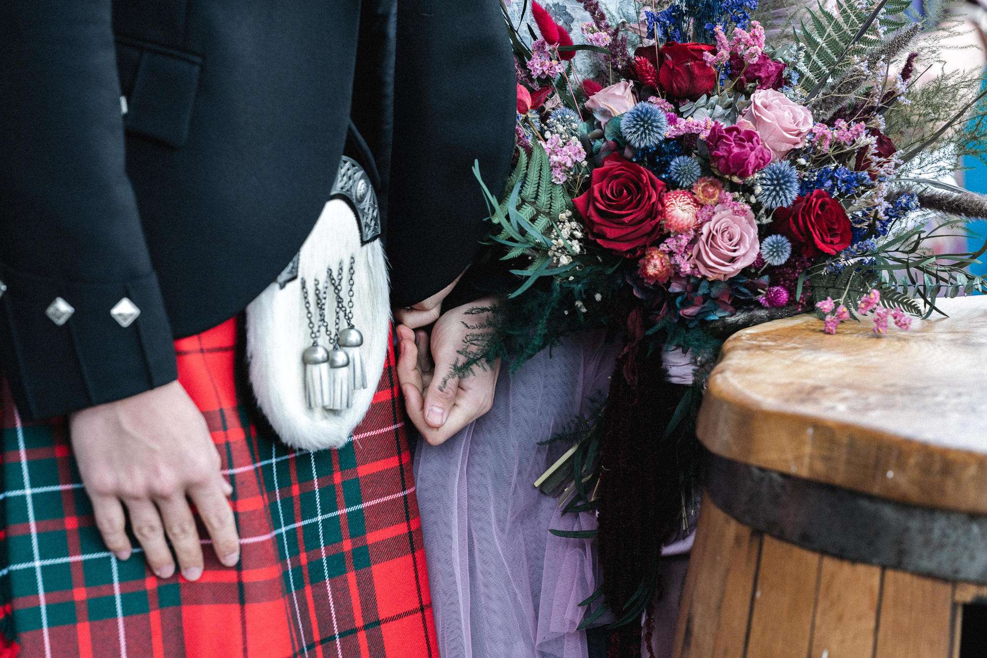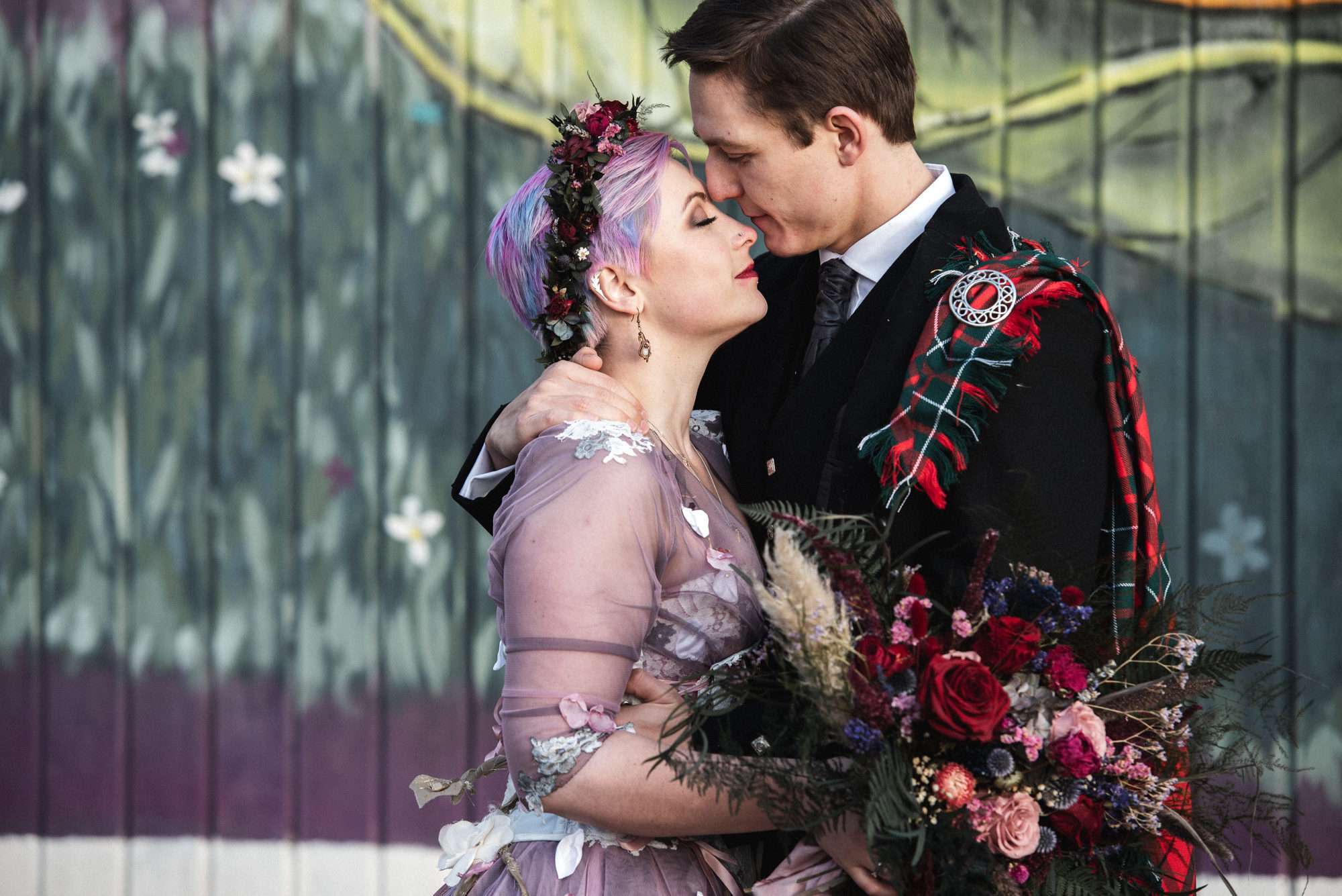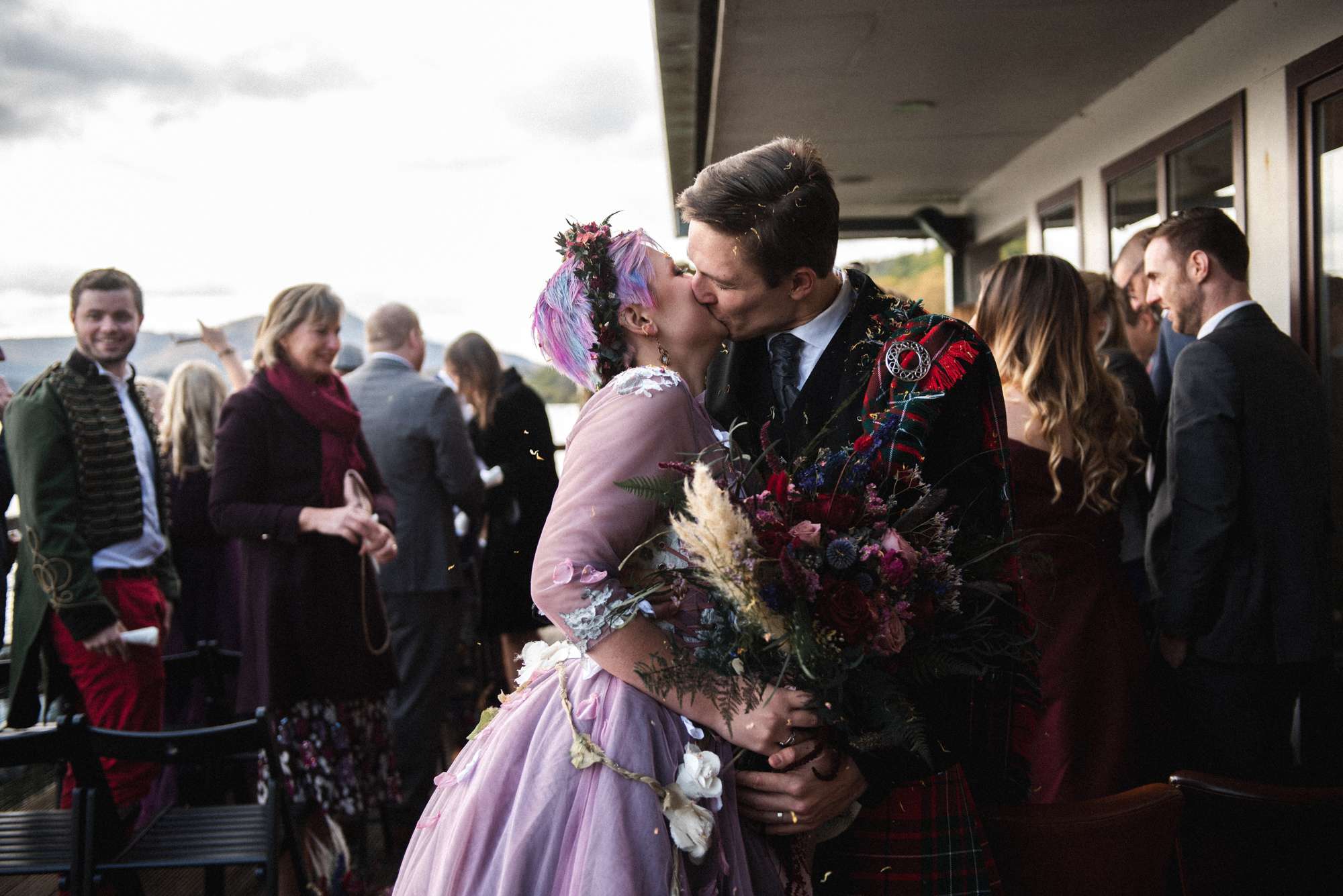 They chose Venachar Lochside as the location for their stunning October wedding and Mazz and Alex made all their decisions for the day based on what did or did not spark joy. The bride wore a full purple/ dusky rose ensemble – from her Rosie Red Corsetry dress, painted shoes (which she did herself!) and even her freshly dyed hair. The flowers were a mix of purple and red, to compliment Alex’ tartan, and they had pumpkins all over the place to reflect the season.