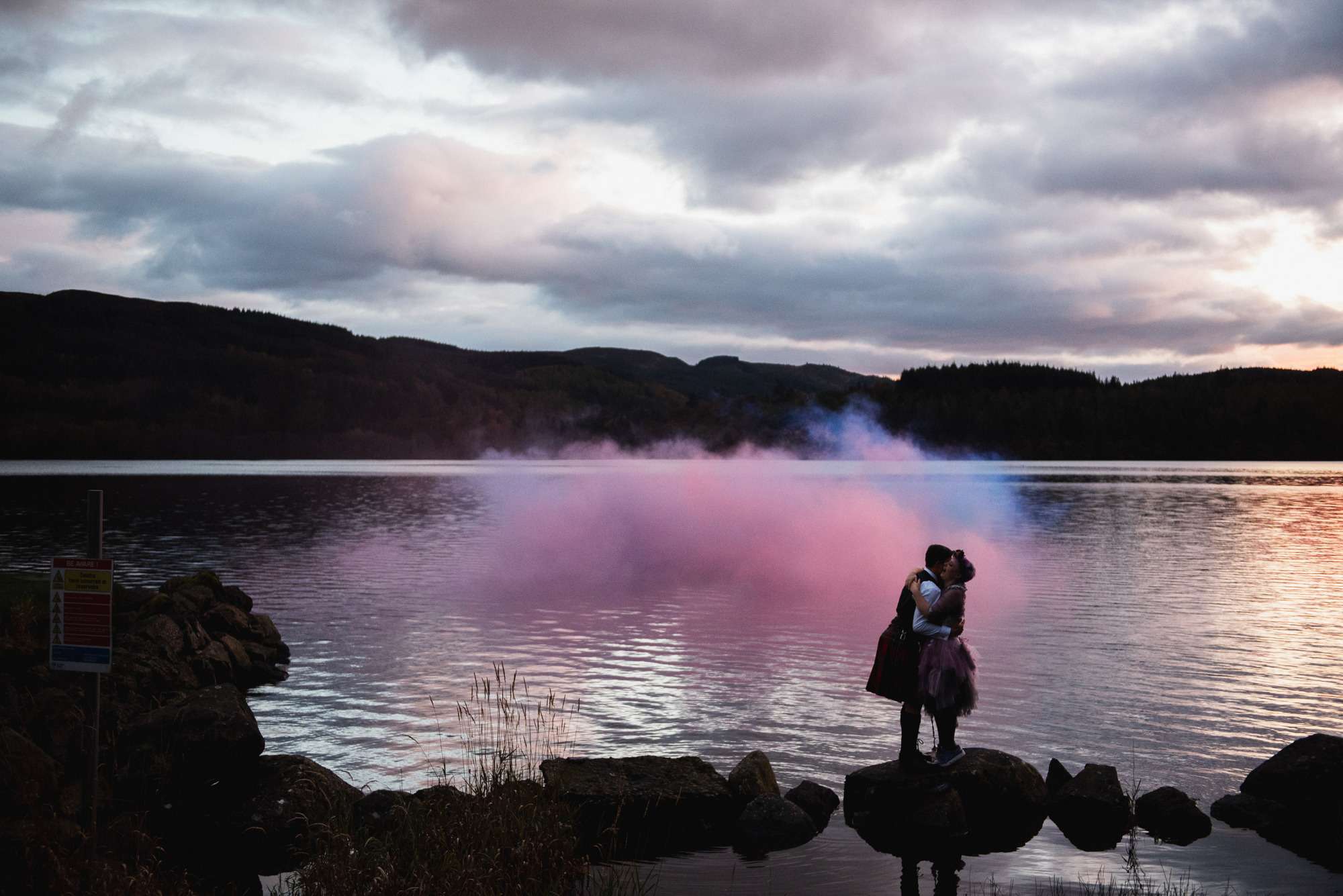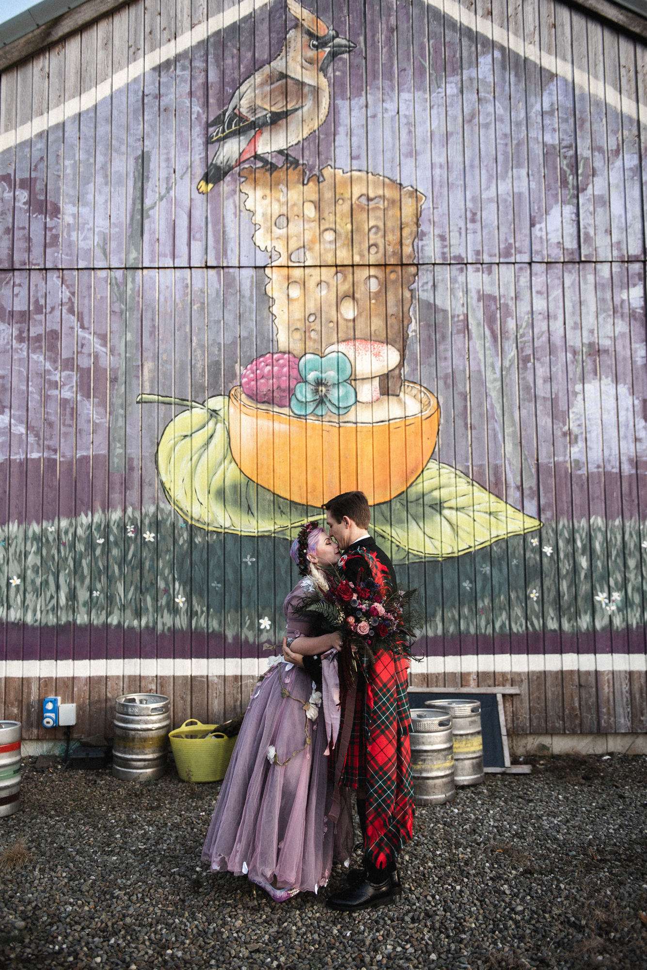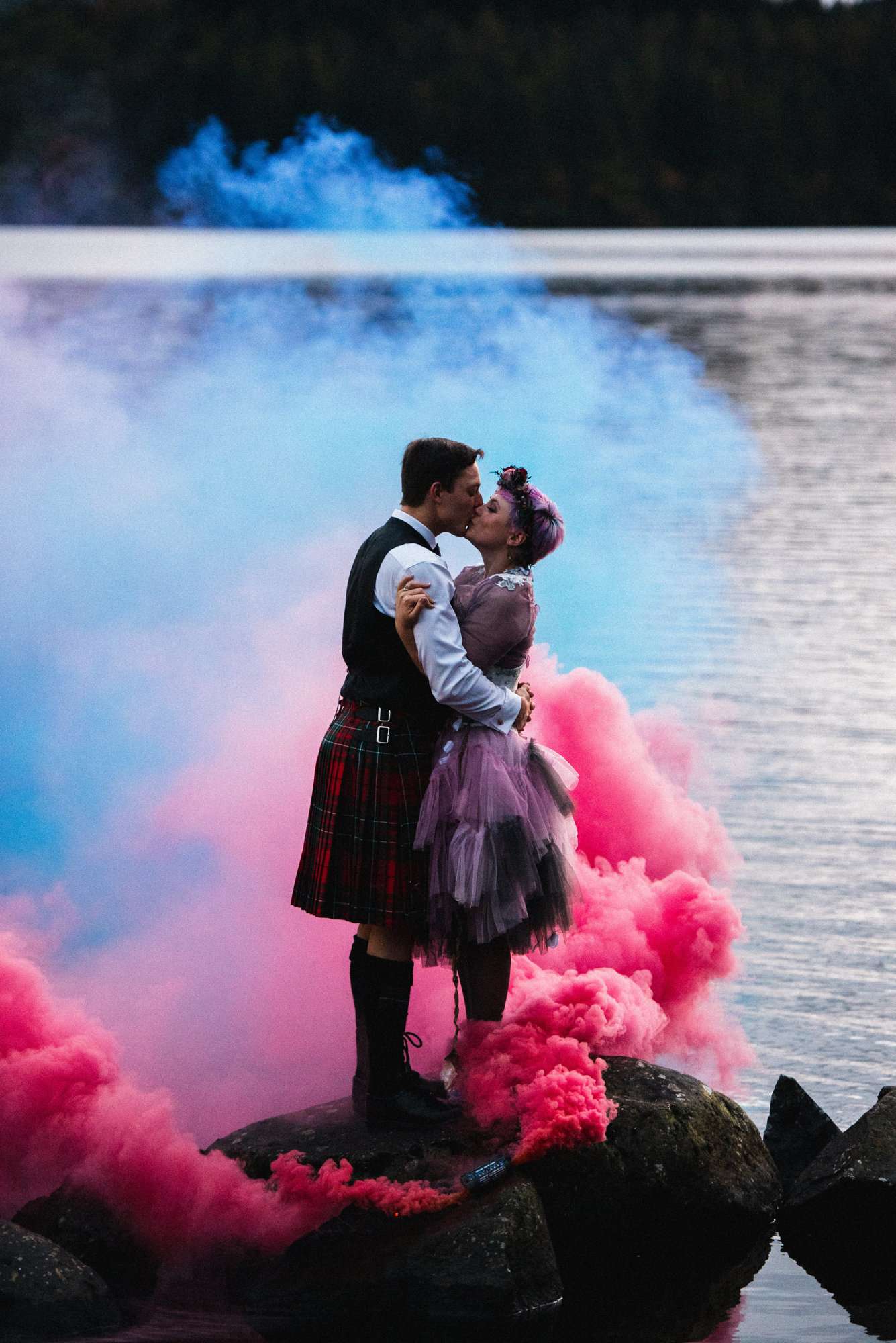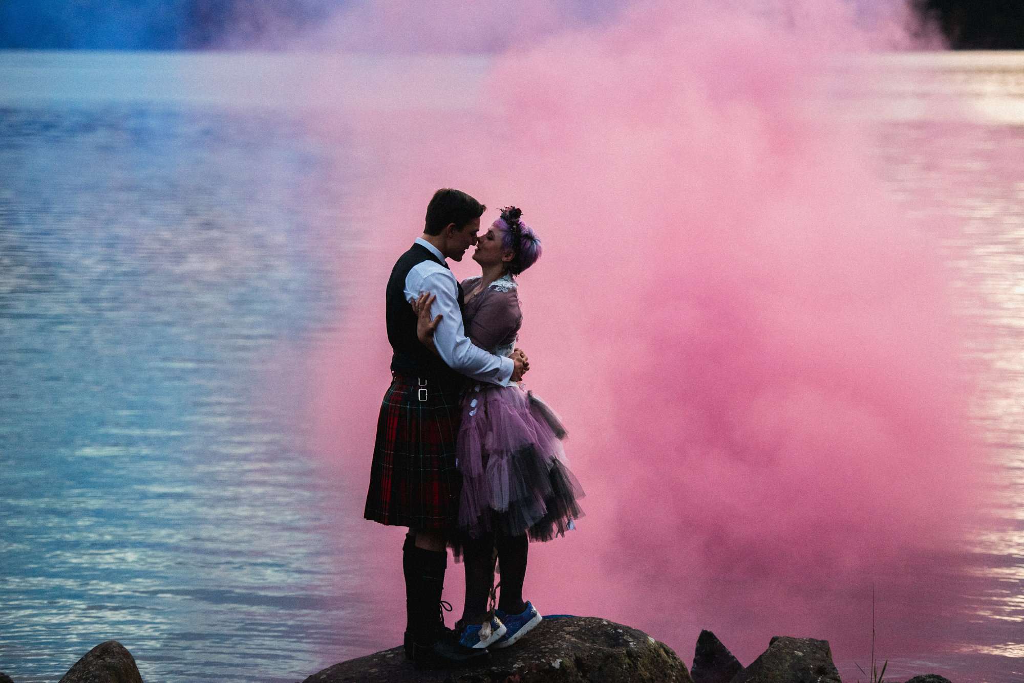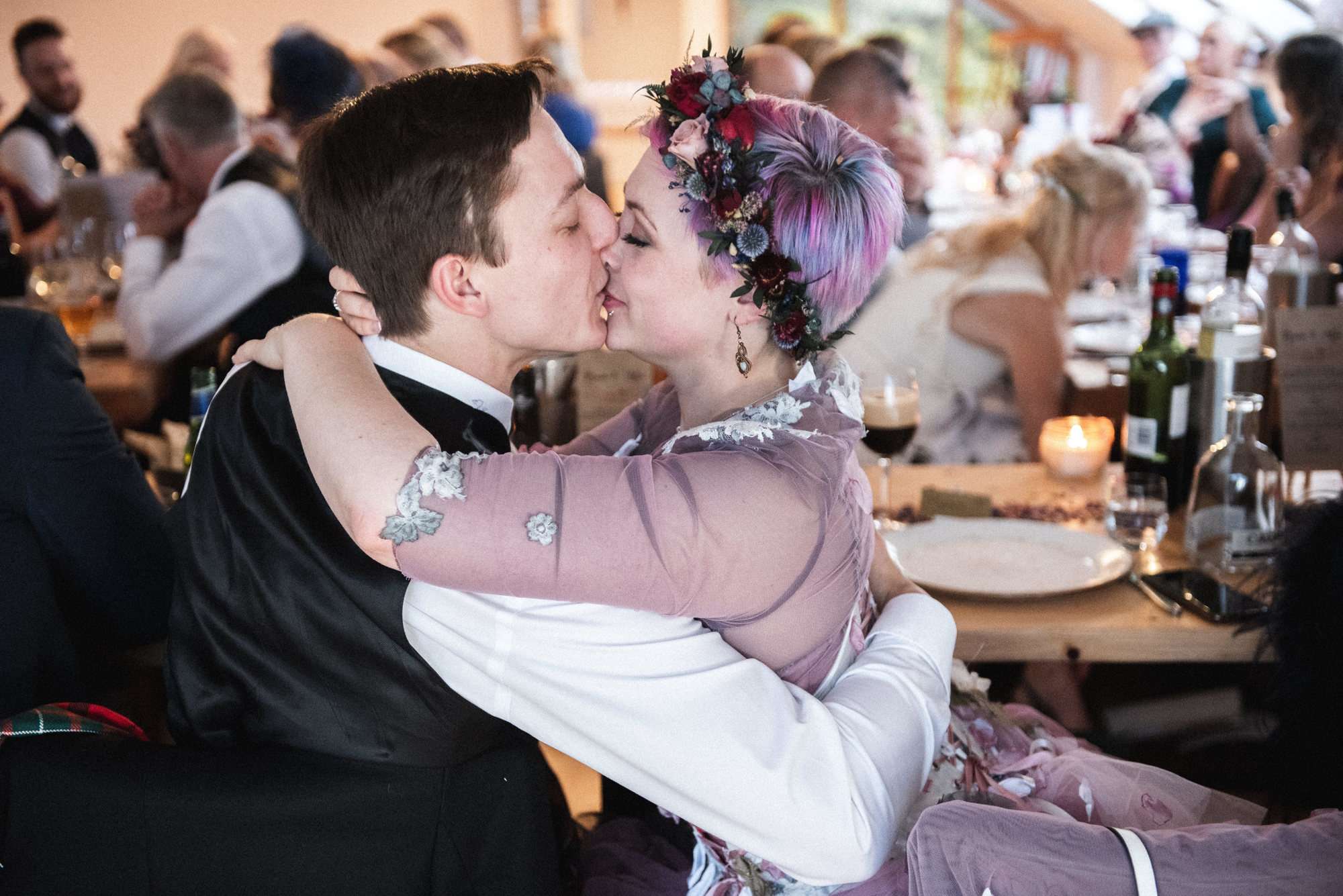 They chose Venachar Lochside as the location for their stunning October wedding and Mazz and Alex made all their decisions for the day based on what did or did not spark joy. The bride wore a full purple/ dusky rose ensemble – from her Rosie Red Corsetry dress, painted shoes (which she did herself!) and even her freshly dyed hair. The flowers were a mix of purple and red, to compliment Alex’ tartan, and they had pumpkins all over the place to reflect the season.
