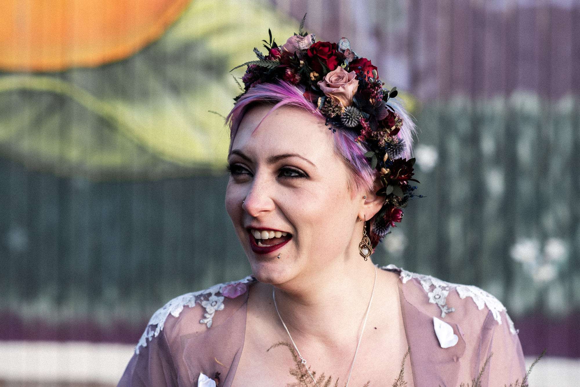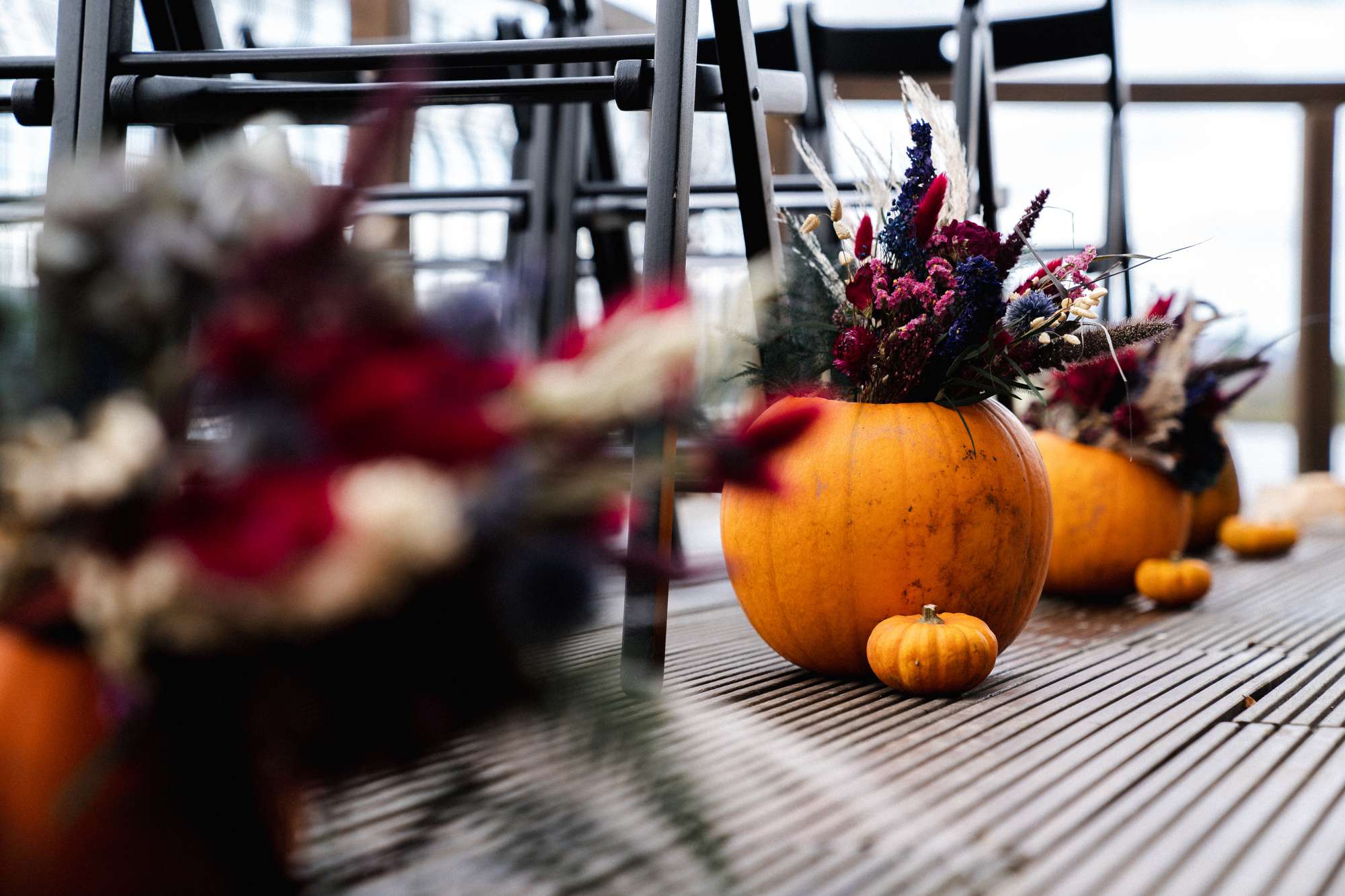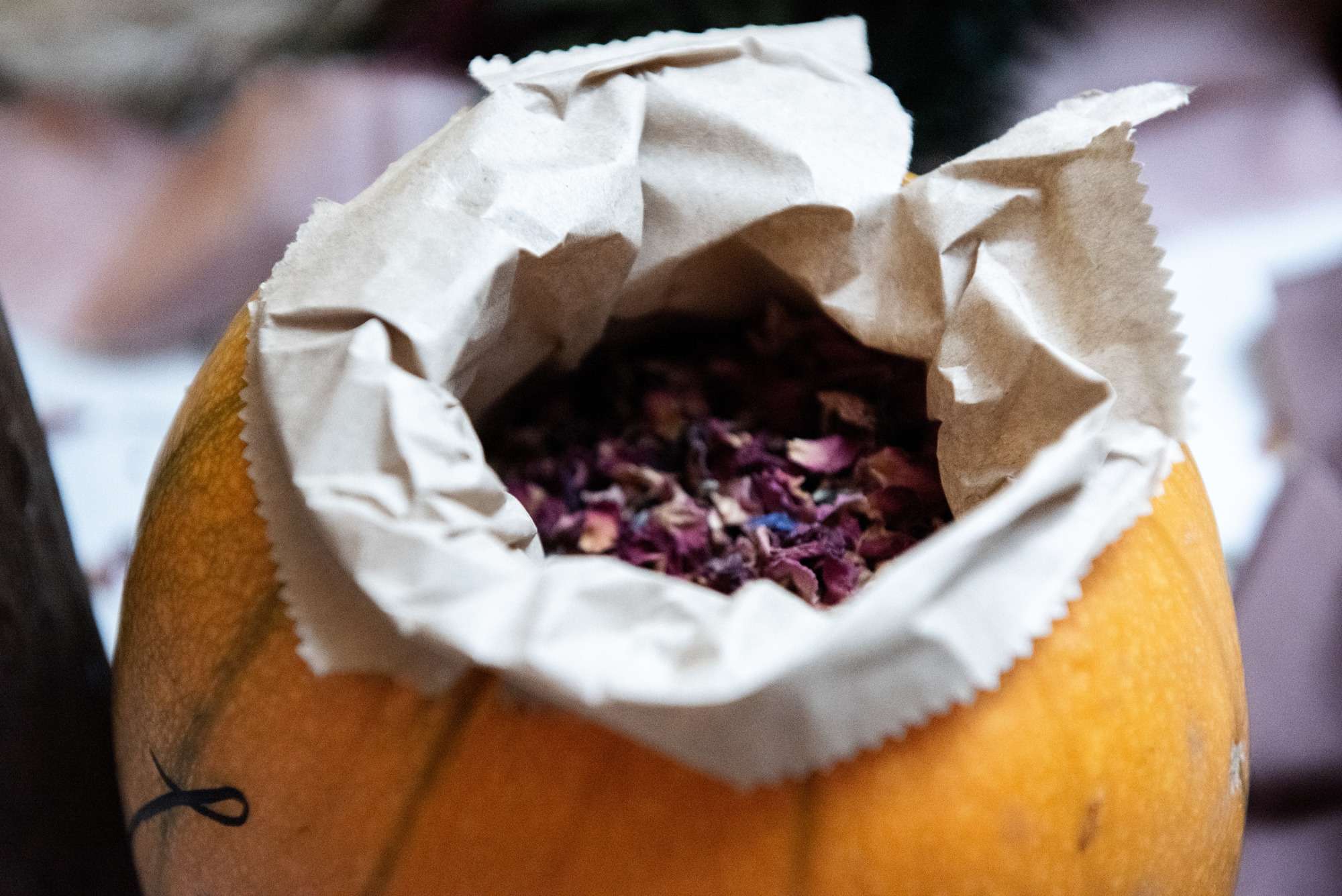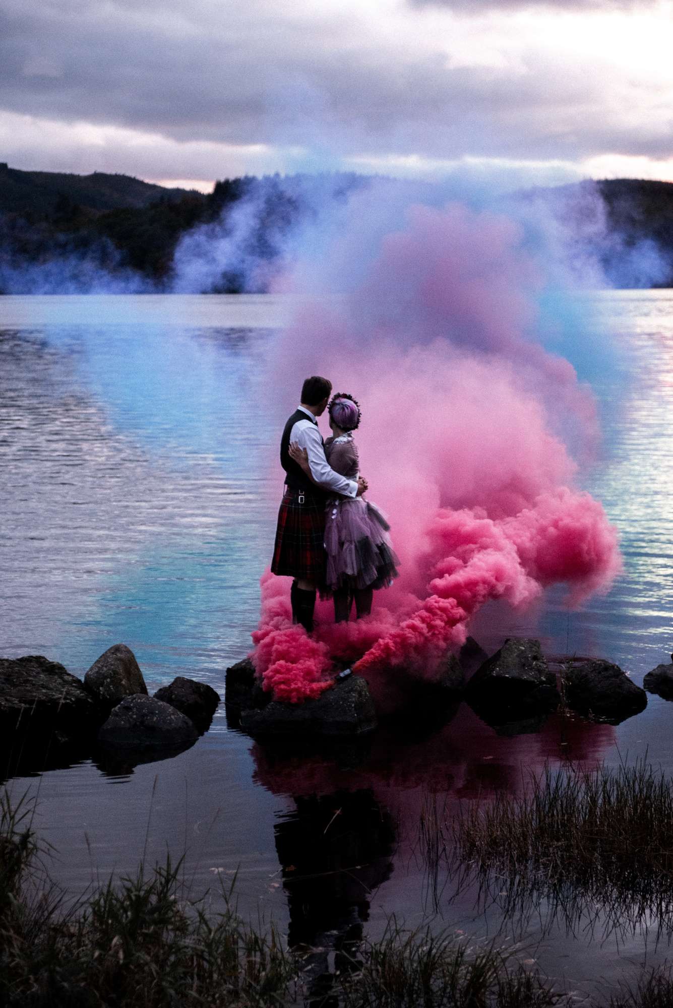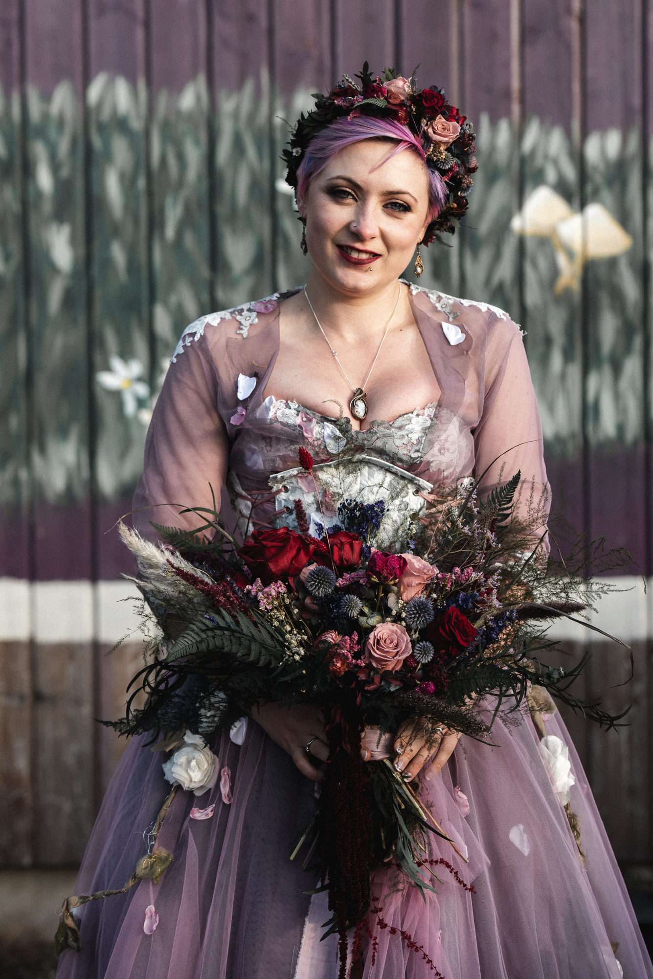 They chose Venachar Lochside as the location for their stunning October wedding and Mazz and Alex made all their decisions for the day based on what did or did not spark joy. The bride wore a full purple/ dusky rose ensemble – from her Rosie Red Corsetry dress, painted shoes (which she did herself!) and even her freshly dyed hair. The flowers were a mix of purple and red, to compliment Alex’ tartan, and they had pumpkins all over the place to reflect the season.