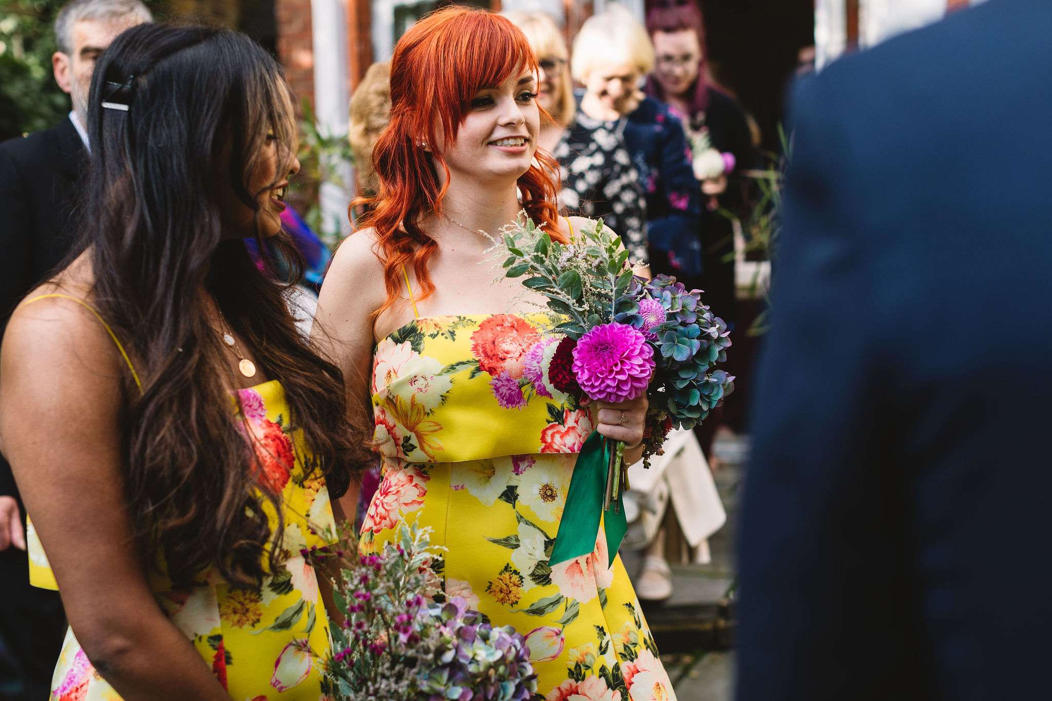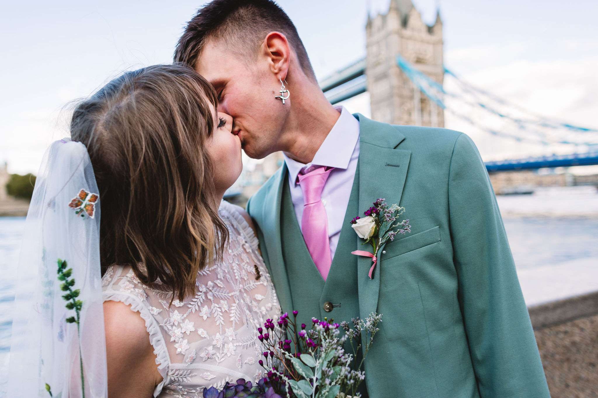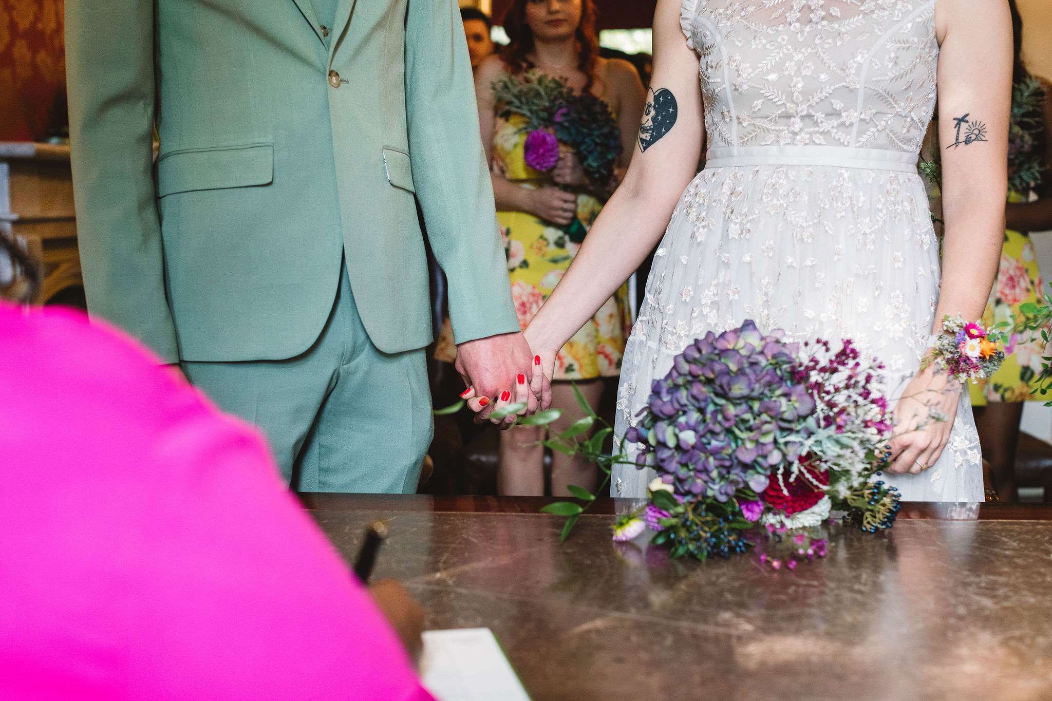 The couple’s ceremony was held at Southwark Registry Officer in Camberwell, London. As they’re not religious or spiritual the standard civil ceremony suited them well. They added some sweet touches to make it their own; the groom’s mum read an excerpt from a Lemony Snicket’s The Beatrice Letters that Suzanna had written in a card to him when she was going away for a year. “We also made a few mistakes when reading our vows that made everyone laugh! Often registry office weddings are seen as impersonal or bland but ours didn’t feel that way at all.”
