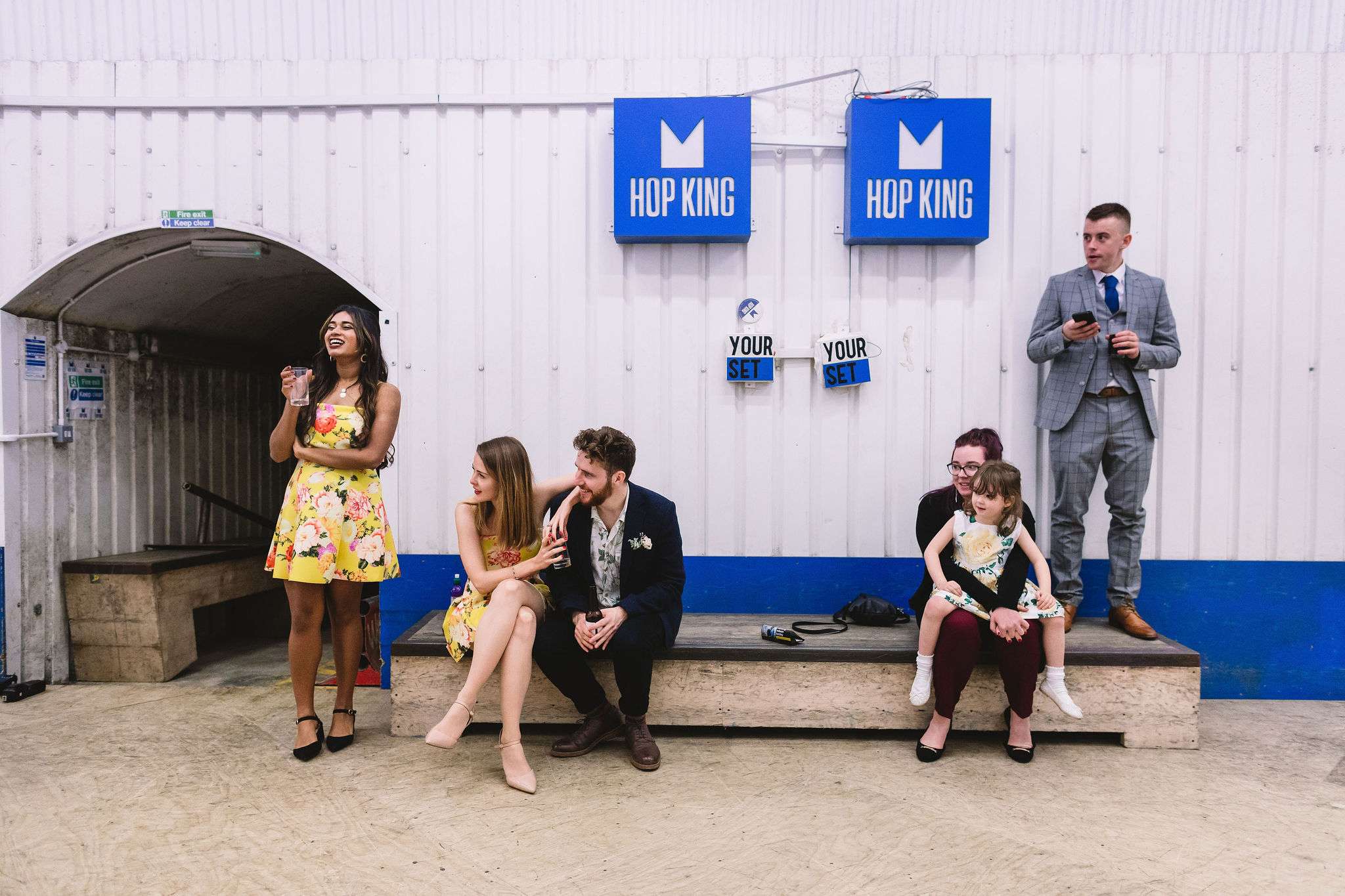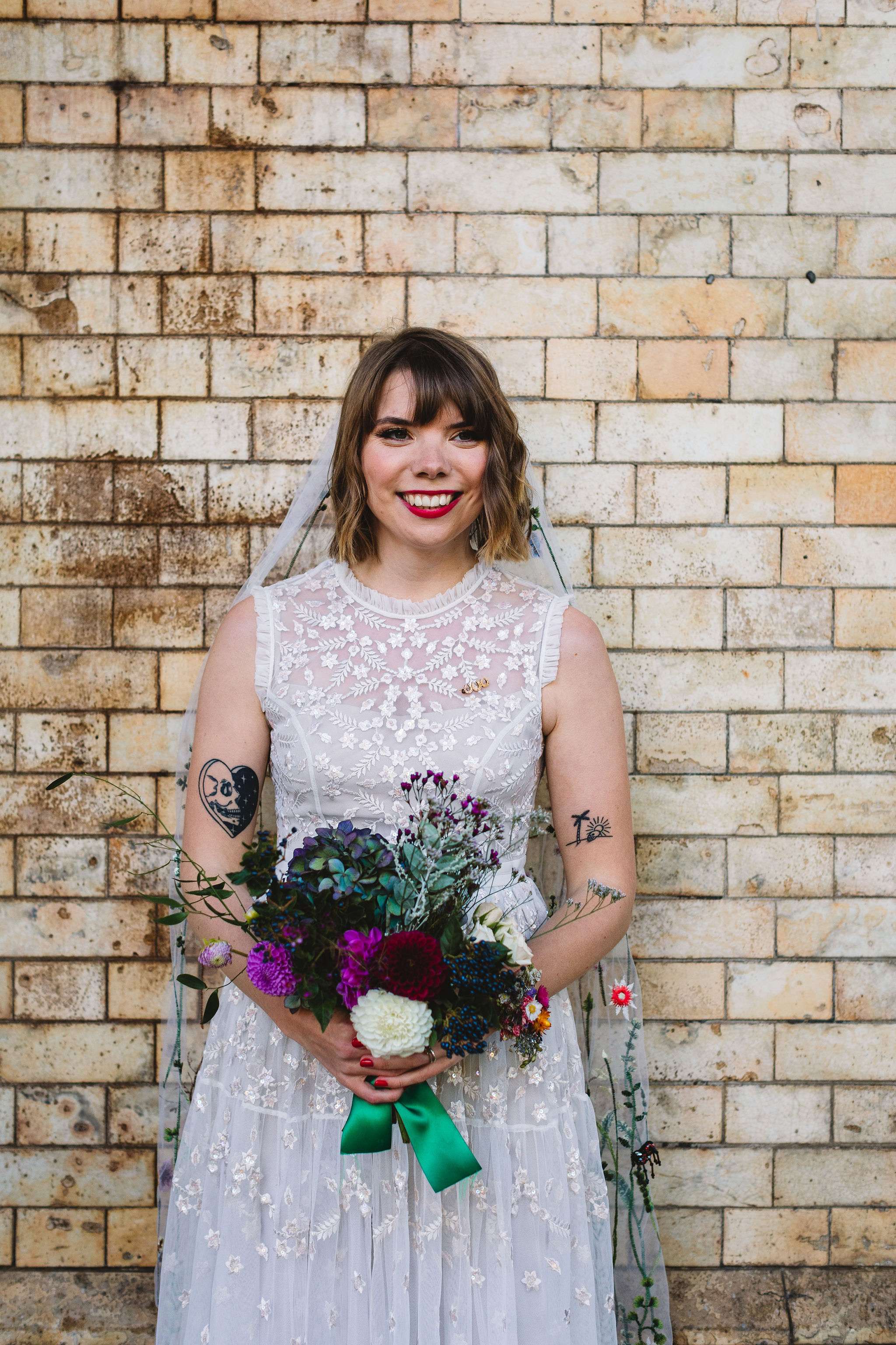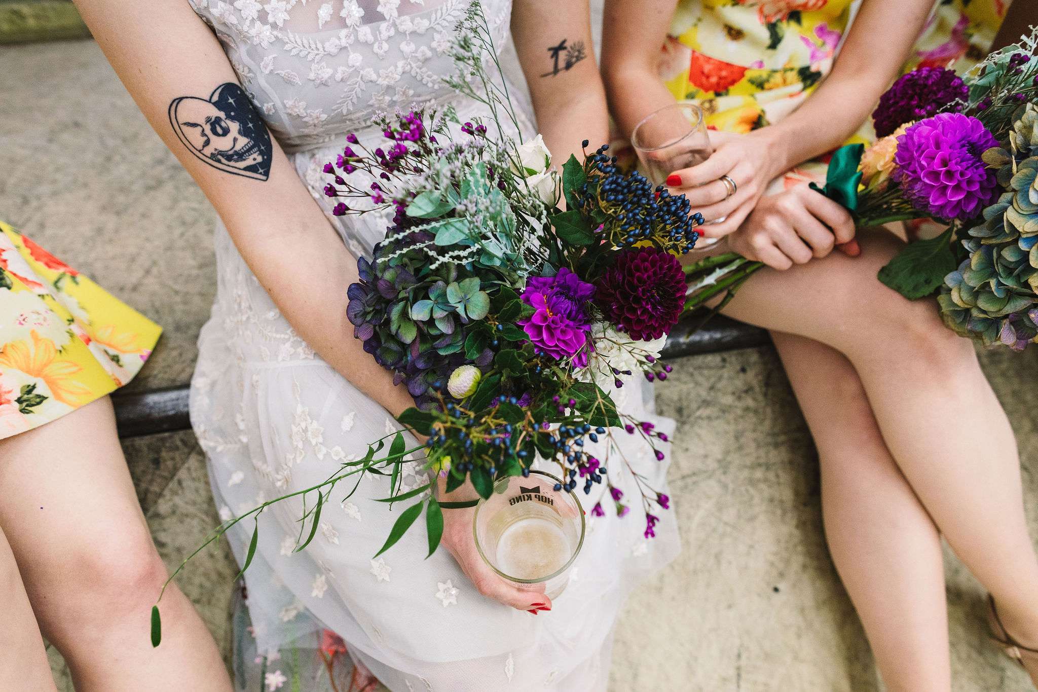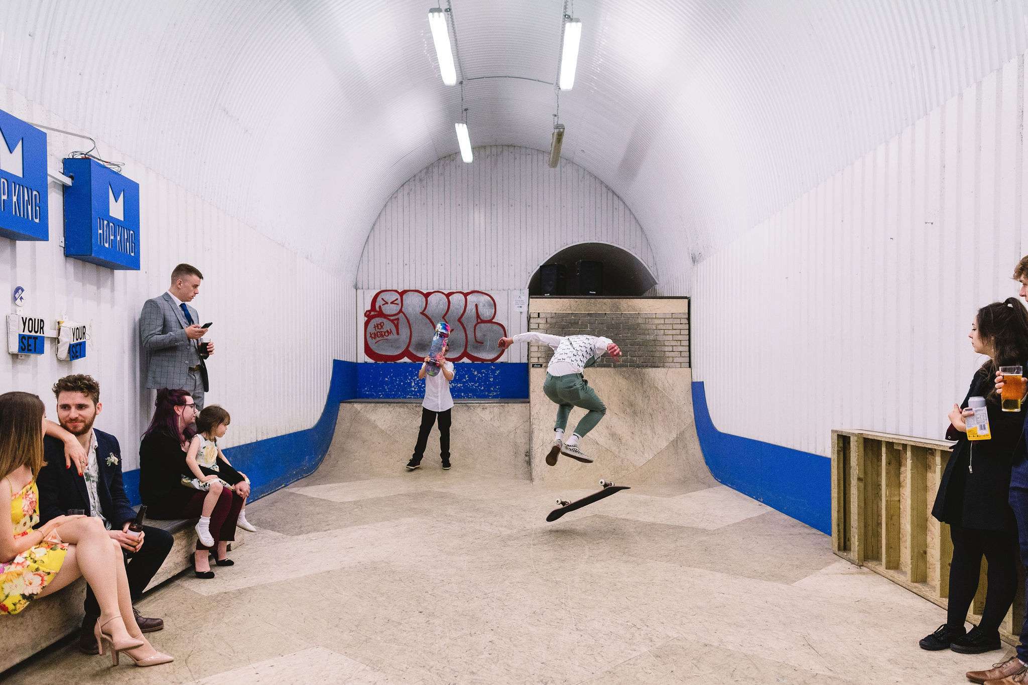 Their reception was held at Hop Kingdom in London, this nod to their love of skating was actually a happy accident – their original pub venue fell through a couple of weeks before. They did a lot of stuff themselves – they made all their decorations, from pom pom trimmed place mats to decorating plant its to fill with succulents and cacti. Jake sanded down an old skateboard to use as a guestbook and played DJ for the evening, and Suzanna took a flower arranging class in order to do her own flowers for the day, heading to Covent Garden Flower Market at 5am the day of the wedding and making bouquets, corsages and table flower arrangements themselves.