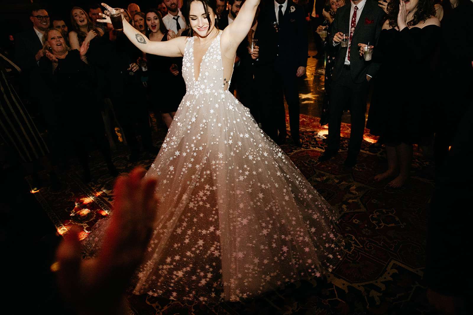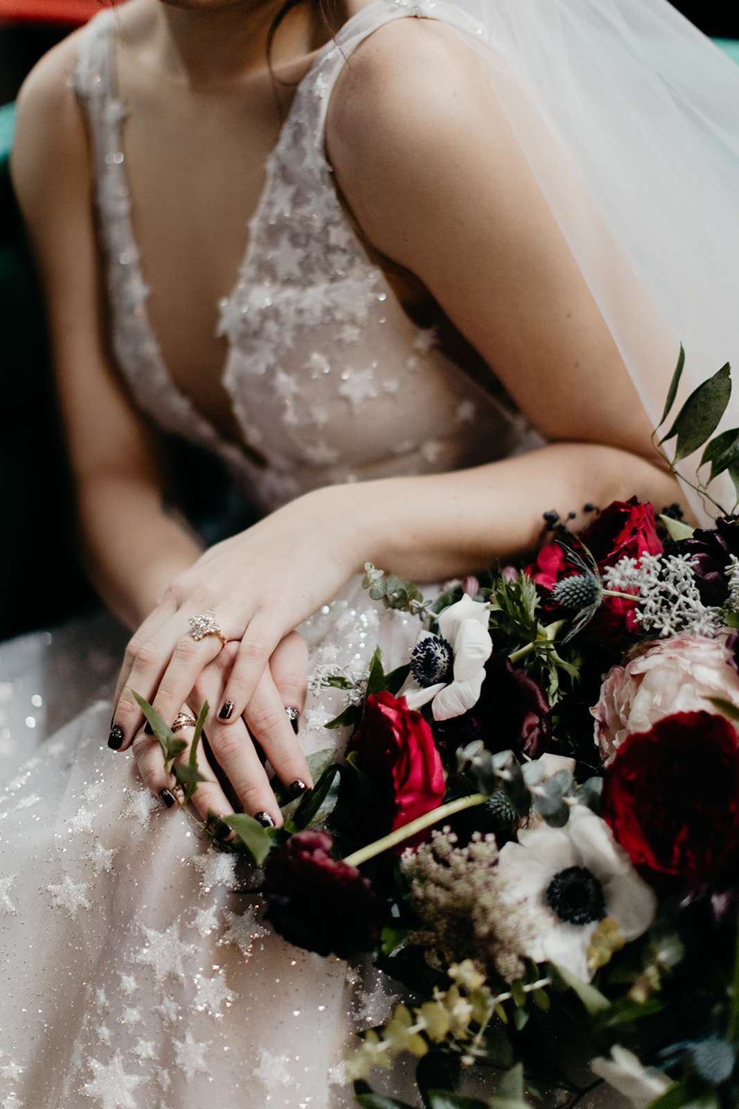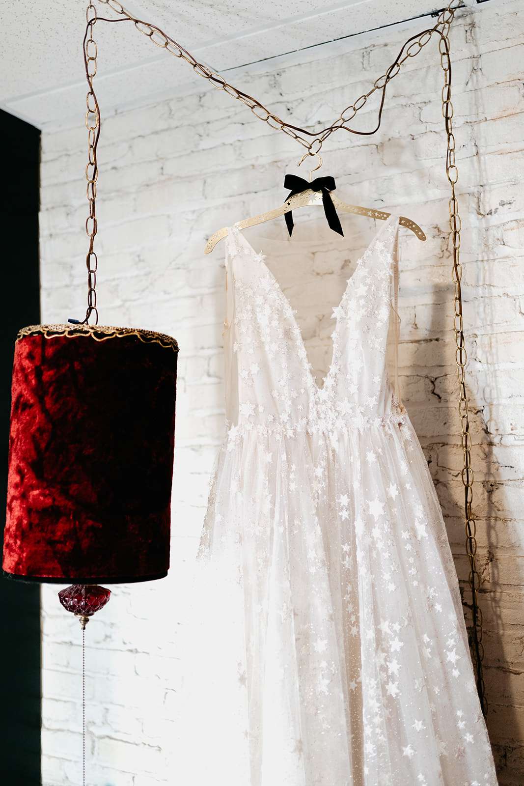 Stylistically, they were inspired by Abby’s star covered Galia Lahav dress, pairing celestial touches with bohemian elements to create a luxe, winter theme. “Instead of focusing on getting vendors to recreate things we’d already seen, we chose companies whose work we admired as a whole, and allowed them creative freedom,” explained Abby. “This ended up producing some of our favourite details of the day like our candlelit ceremony, greenery hanging to the ground, and stars projected onto the floor. I would have never thought of those things myself because I was so close to it and couldn’t see the bigger picture sometimes.”