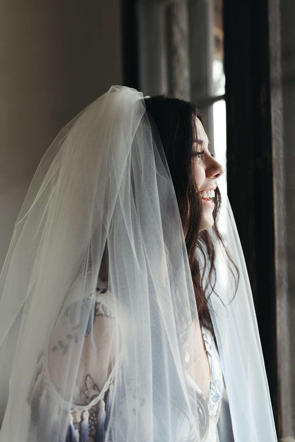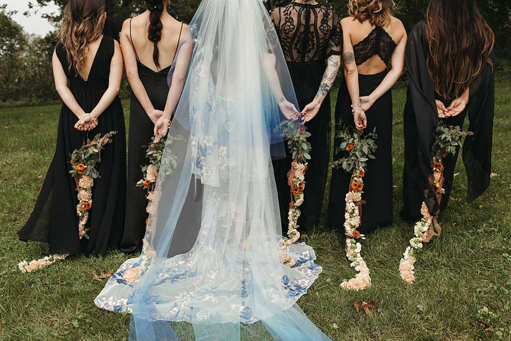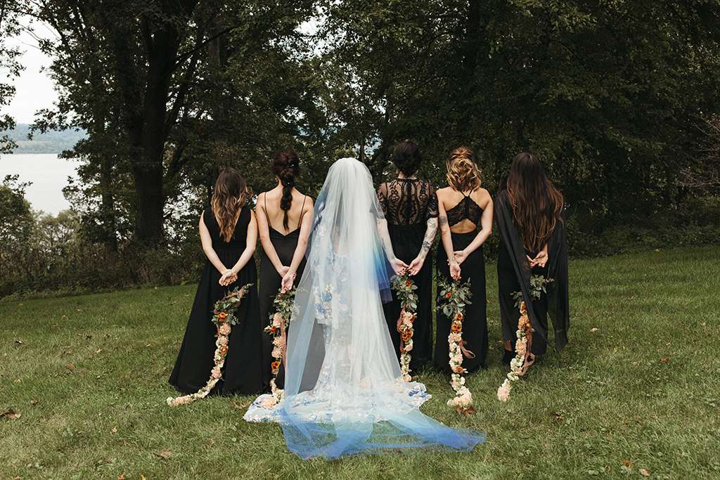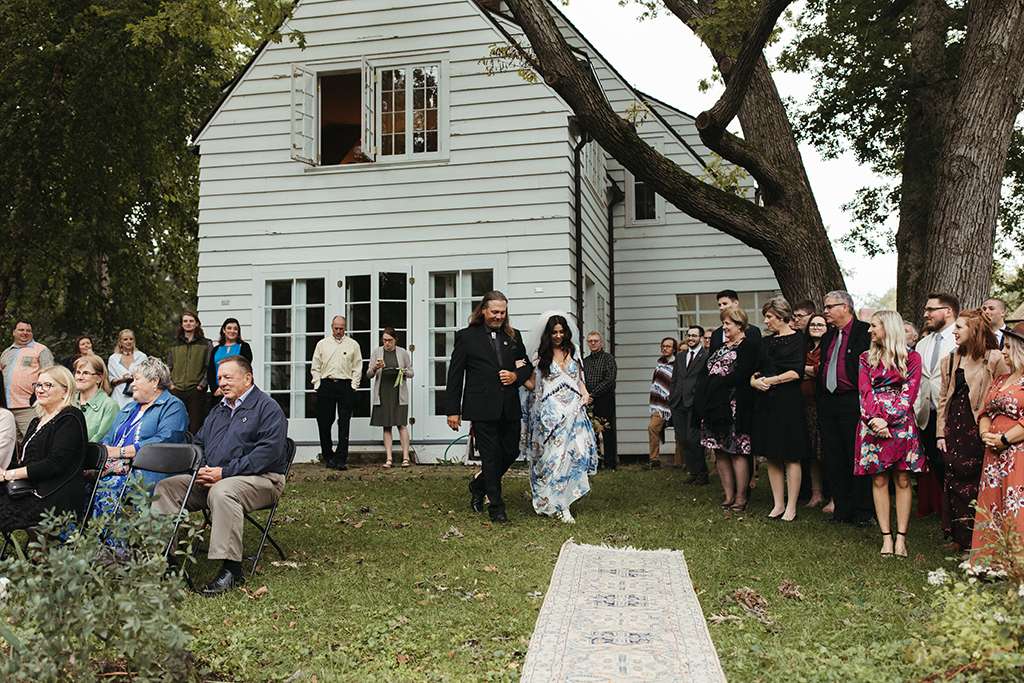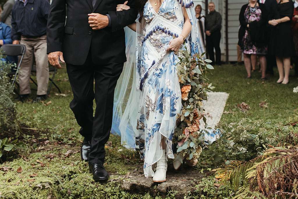They used sentimental touches throughout their day, too. Allie and her mum DIY’d a record wall backdrop for their reception, and bottle cap mirrors for favours as herself and Brian are big beer drinkers. Allie also put together their wedding website and stationery. Her mum hand-dyed her veil, and her grandmother took a load of old family blankets and upcycled them to table runners. With a friend, Allie arranged wholesale flowers for centrepieces, and many other people helped DIY in so many other ways. “We wanted the experience to be rich and lovely, but we didn’t feel the need to pay out the ass for such an experience for our guests. We could do that, with enough love and elbow grease.”