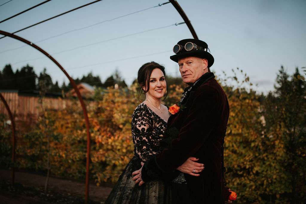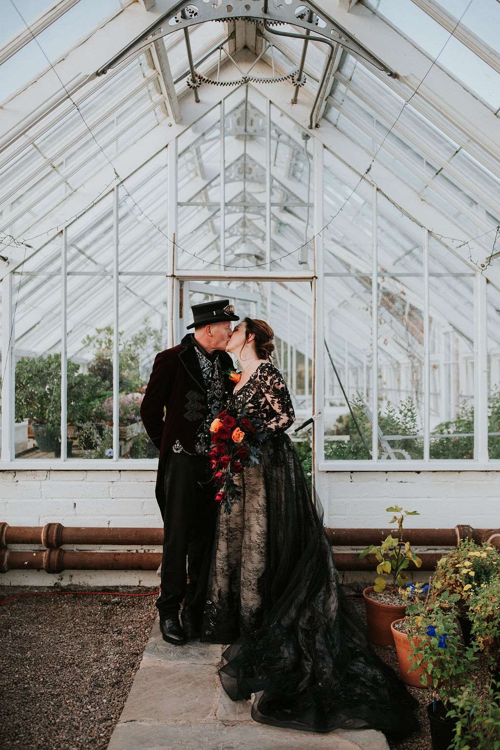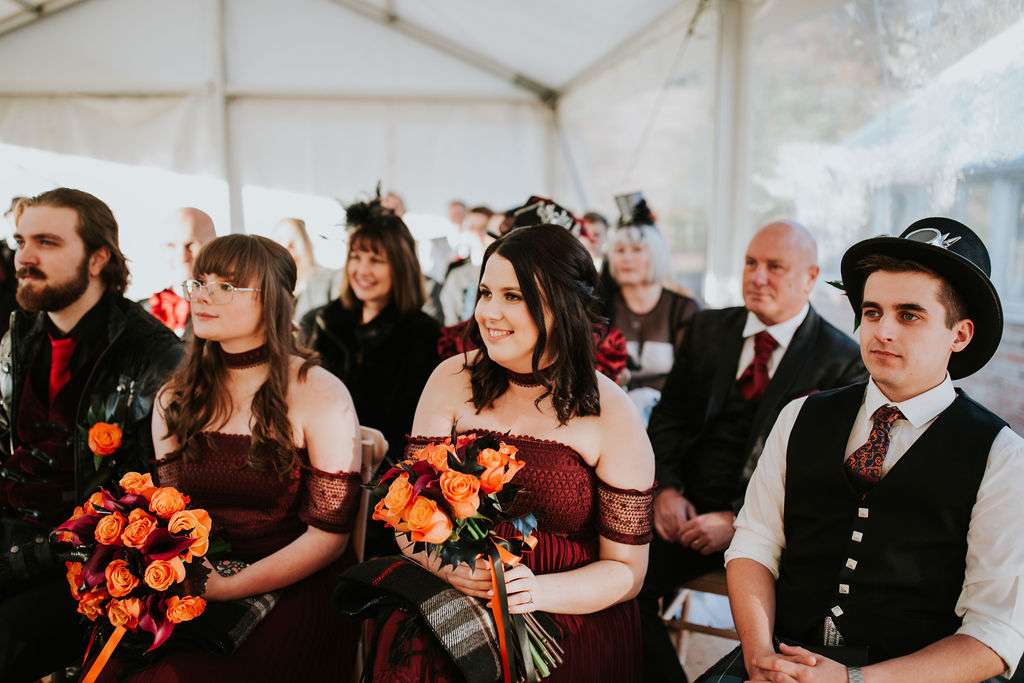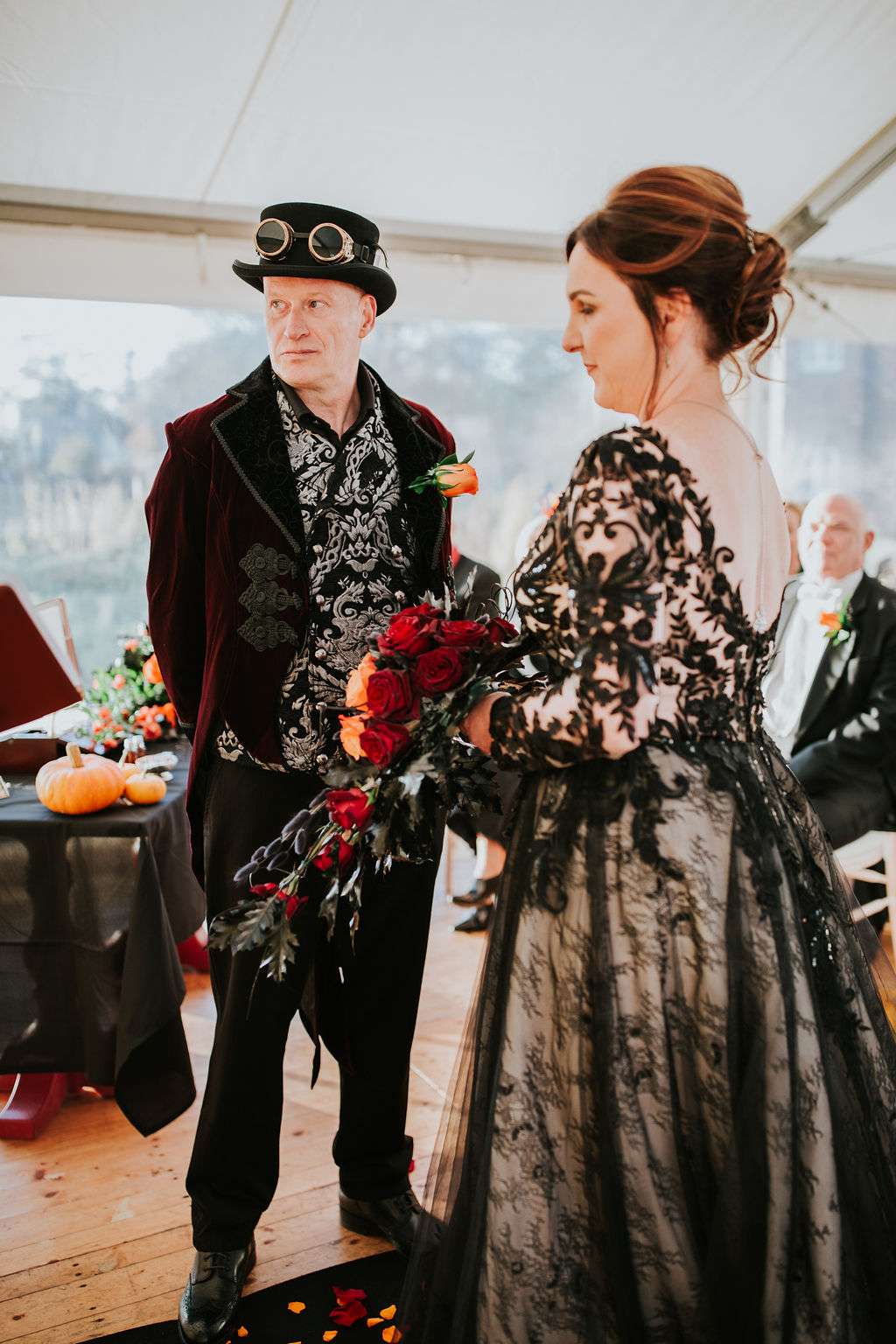 Bill and Julie set the bar high with their own outfits; Julie wore a black lace gothic-inspired Sottero and Midgley dress, styled with antique jewellery and headpieces from Etsy. Bill rocked a suitably Victoriana inspired ensemble from Violent Delights, and their bridesmaids wore ASOS dresses paired with burgundy lace chokers (made with off-cuts from the dresses) and tartan wraps.