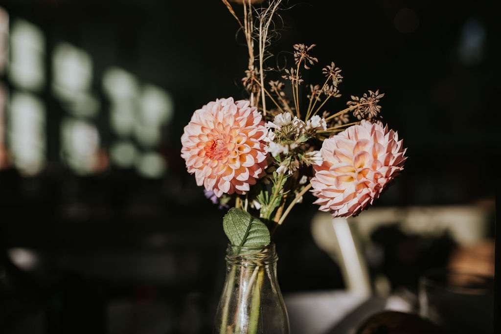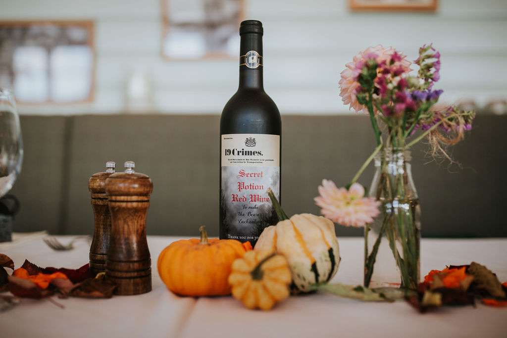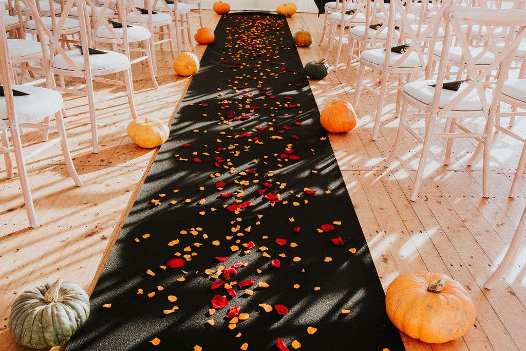They had a celebrant perform a humanist ceremony that included traditional Scottish elements such as the Quaich and a bagpipe player. “The ceremony was brilliant,” Julie reminisced. “Neil our celebrant spent time beforehand asking questions and getting to know us before preparing our vows. We chose to keep most of the service secret so it was a surprise to both us and the guests! The aisle lined with pumpkins and orange and red petals set the tone, fun and vibrant.”