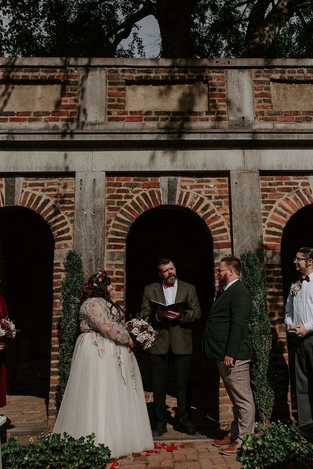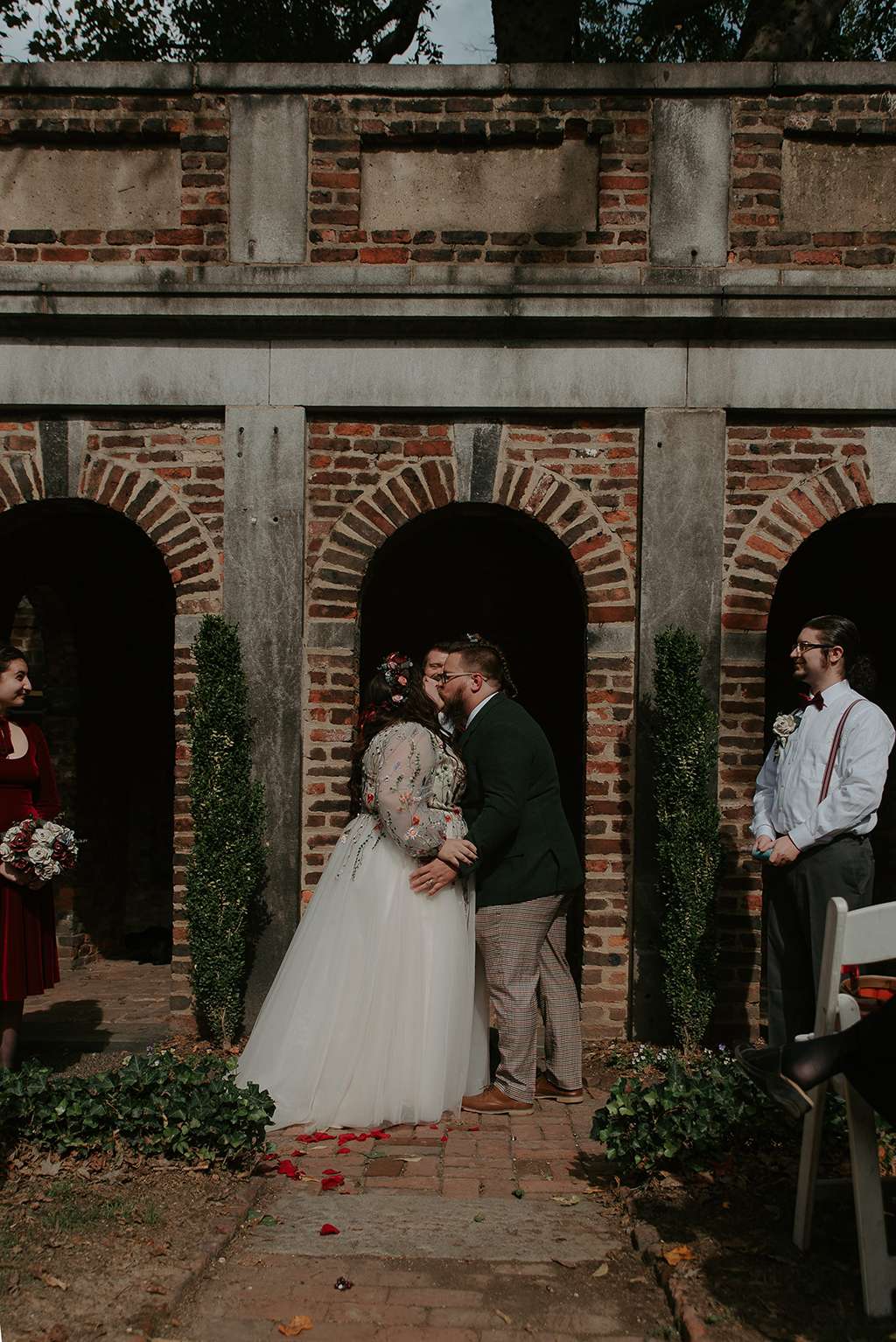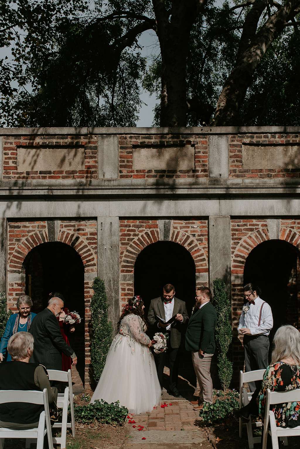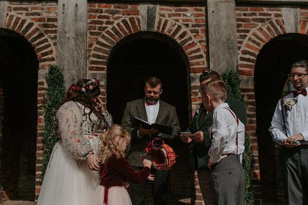 They picked two unique venues close to their bibliophilic hearts; their ceremony was held in the enchanted garden at the Edgar Allan Poe Museum in Richmond, Virginia. Faith was walked in by both her parents. They included vows to their children as well as writing their own vows to each other. These included lots of jokes between them, and Shawn promised never to wear cargo shorts again (after turning up to their first date in them… Faith almost didn’t go out with him again!) “Our ceremony was short, sweet and personal – exactly what we wanted,” she said.