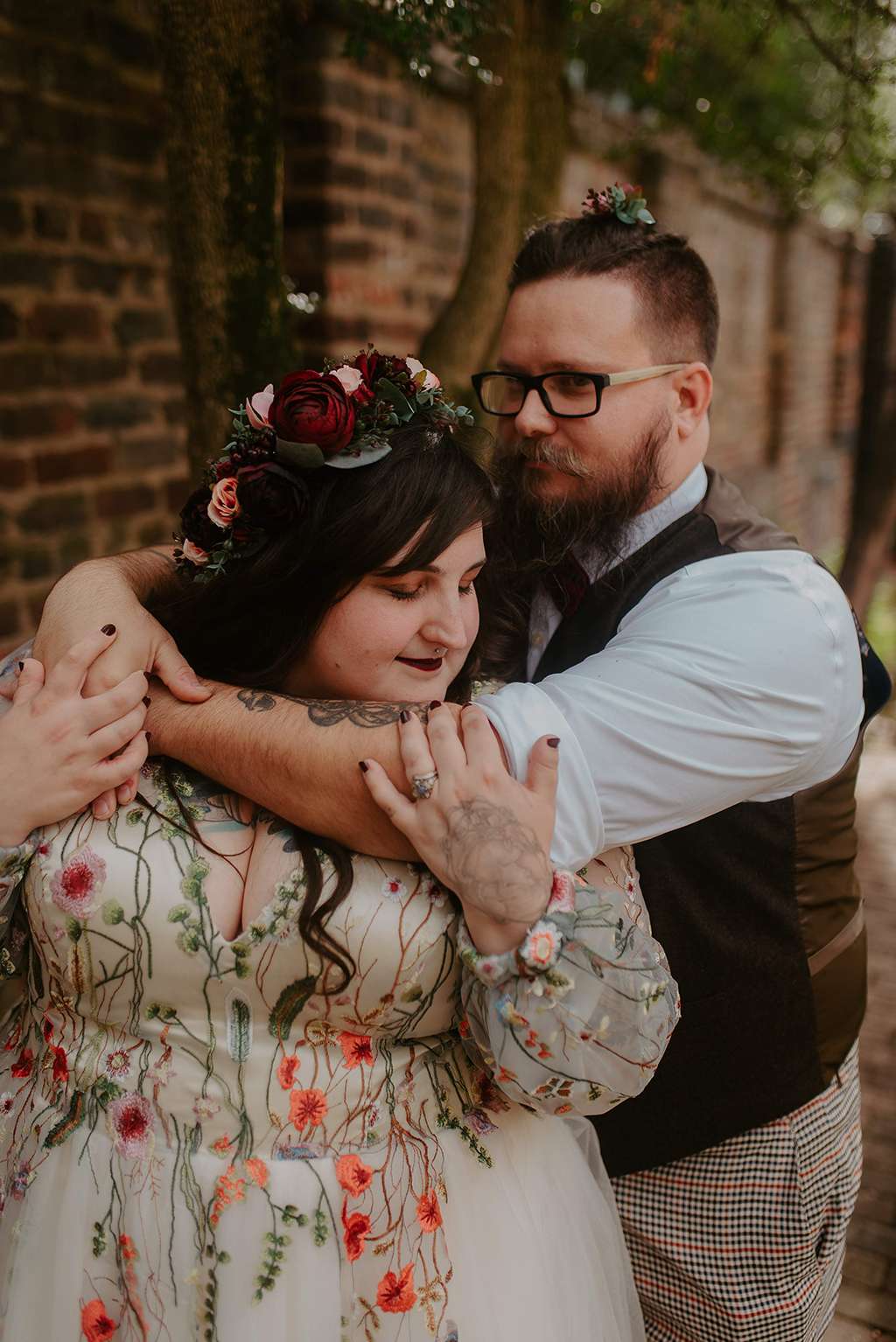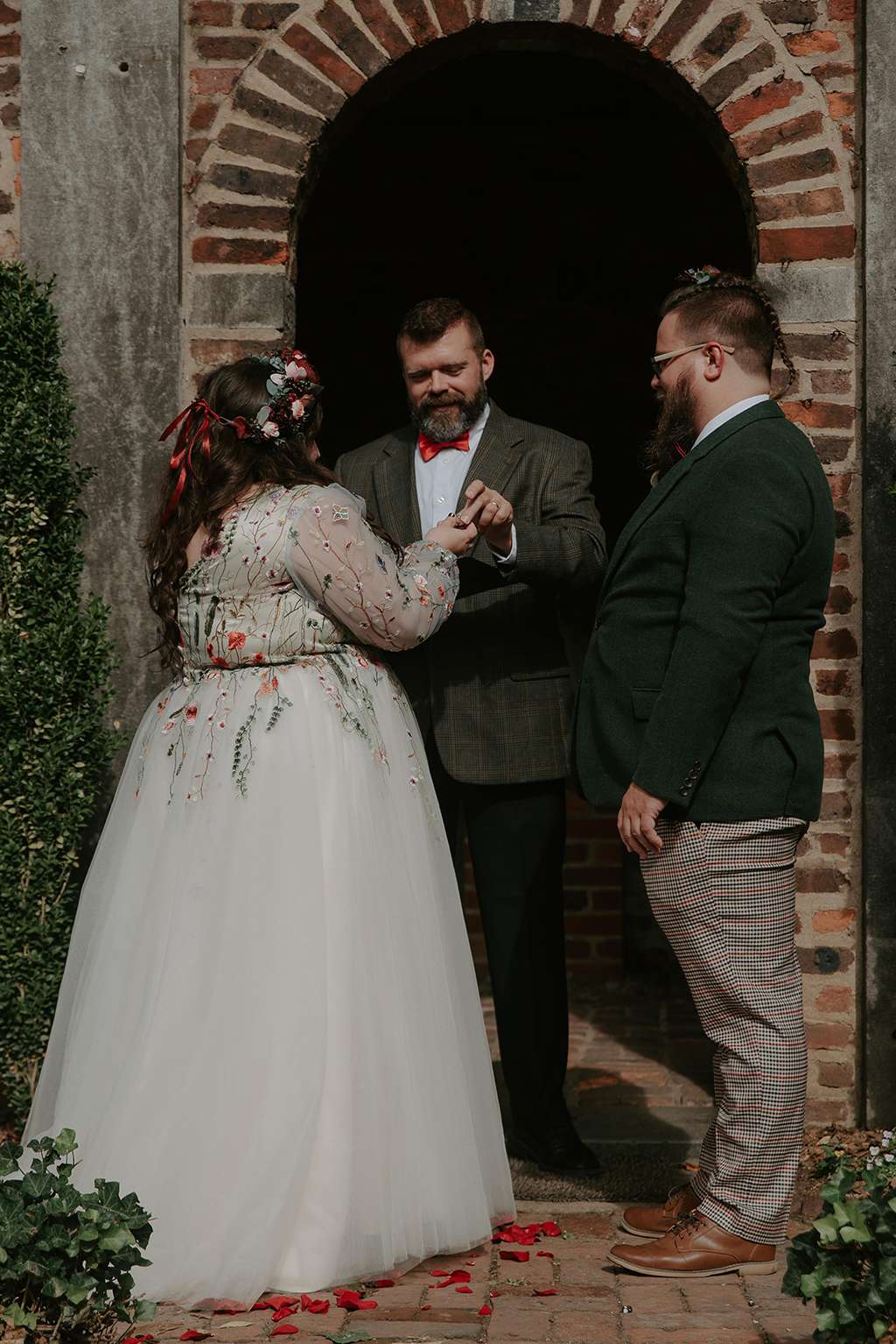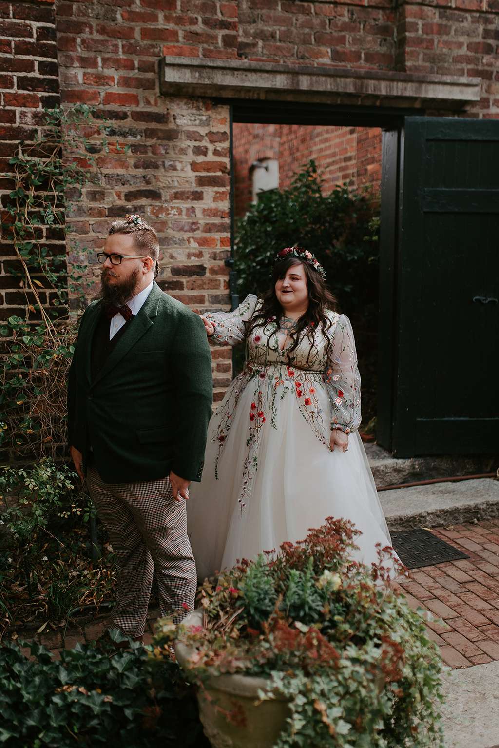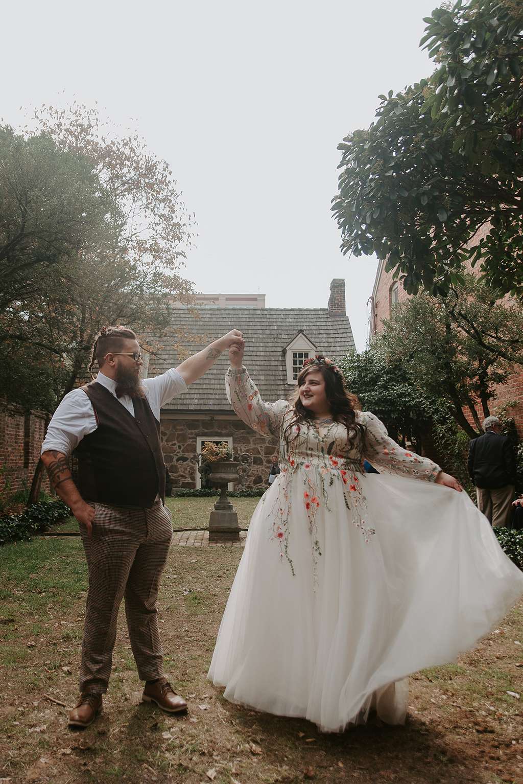 They picked two unique venues close to their bibliophilic hearts; their ceremony was held in the enchanted garden at the Edgar Allan Poe Museum in Richmond, Virginia. Faith was walked in by both her parents. They included vows to their children as well as writing their own vows to each other. These included lots of jokes between them, and Shawn promised never to wear cargo shorts again (after turning up to their first date in them… Faith almost didn’t go out with him again!) “Our ceremony was short, sweet and personal – exactly what we wanted,” she said.