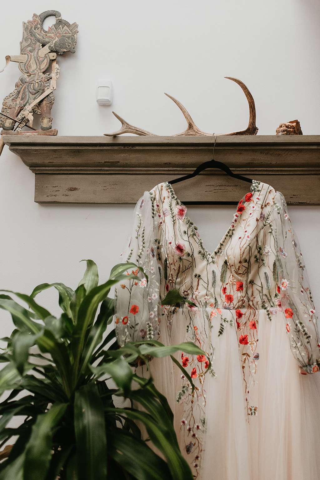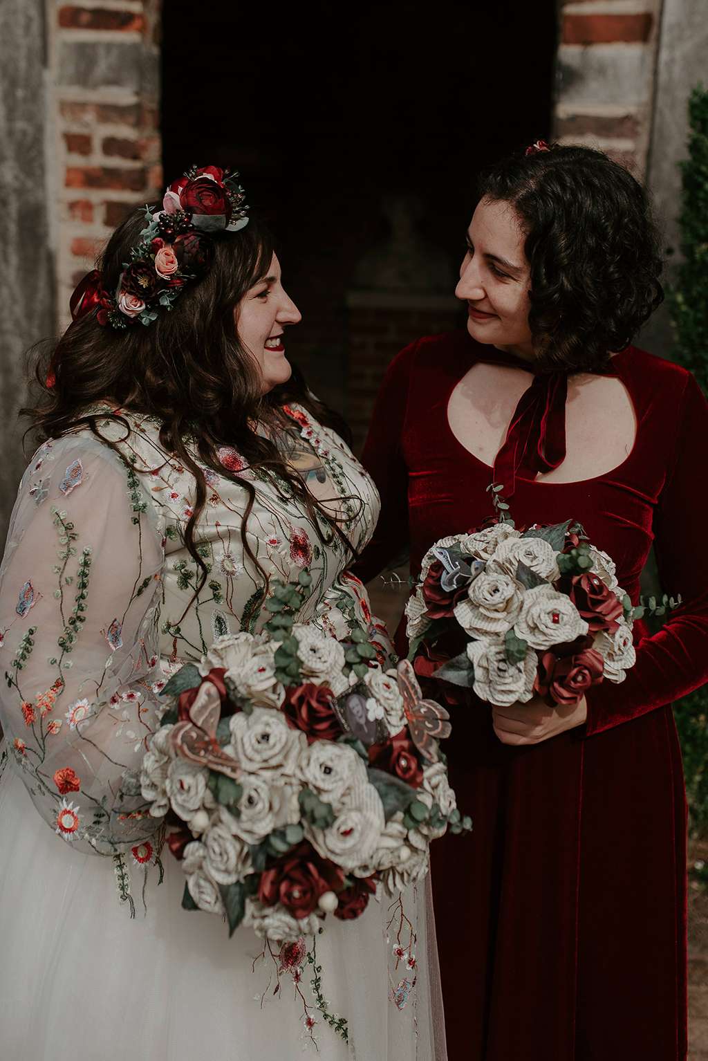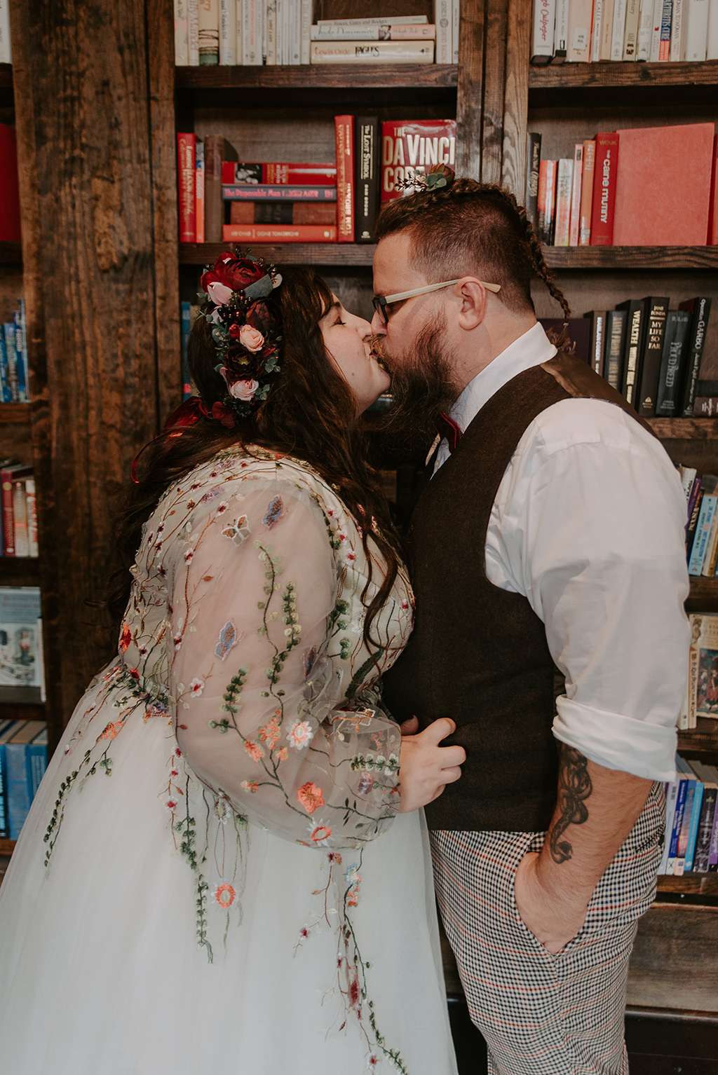 Starting with their invitations, which were made from old due date cards from the library that the bride works at, they waved literacy touches throughout their day; their rings were held in a custom book with their name and date on it. Shawn wore Edgar Allan Poe socks while the bride wore Edgar Allan Poe shoes. They DIY’d their centrepieces, collecting vintage books from friends and family and pairing from with curious touches like vintage bird cages and bird skulls. For the ethereal touches, Faith had a custom floral embroidered dress made. Her flower crown, also custom made, matched the other flowers used throughout, including the groom’s hair flowers and the flower girl’s floral belt and hair piece too.