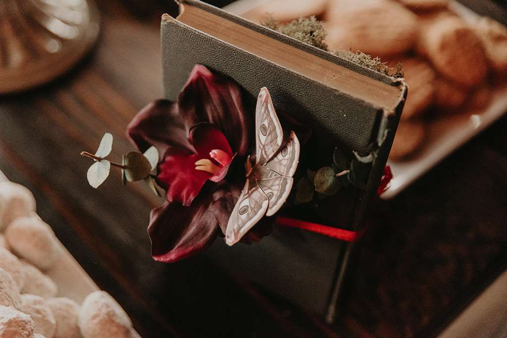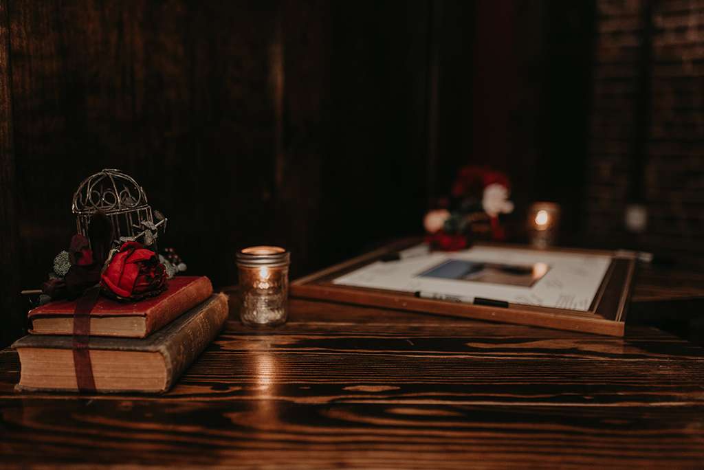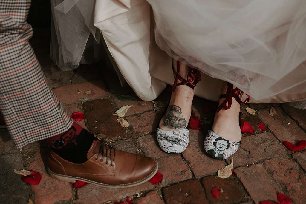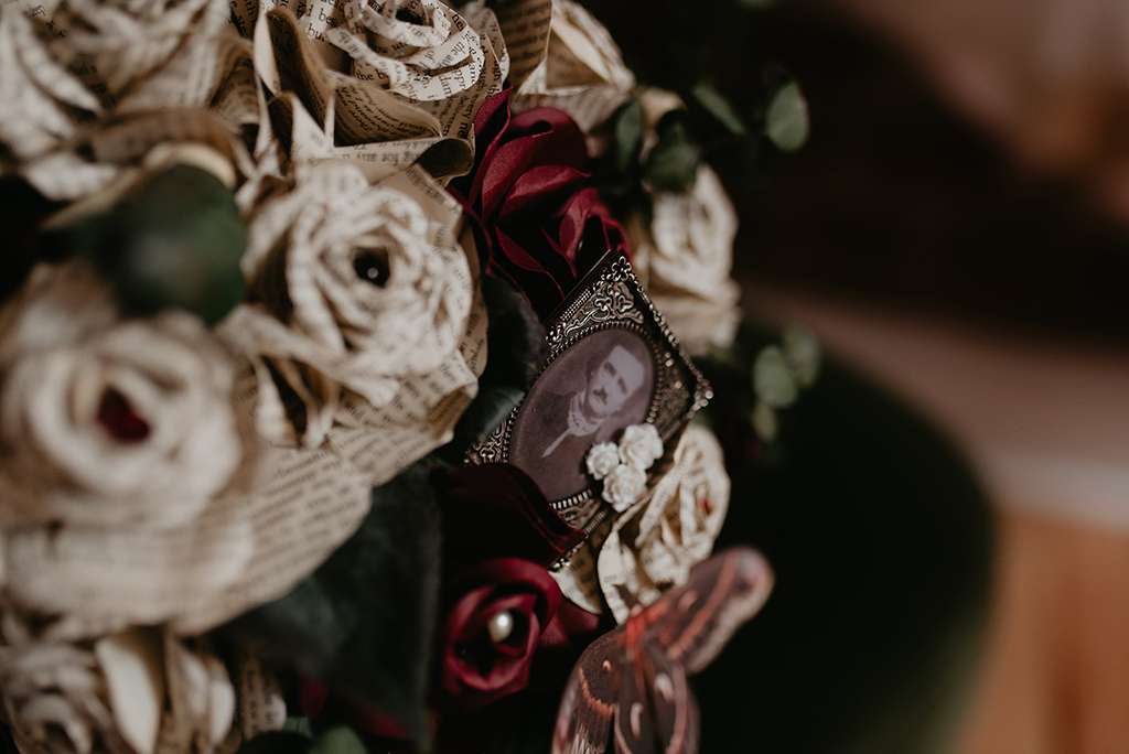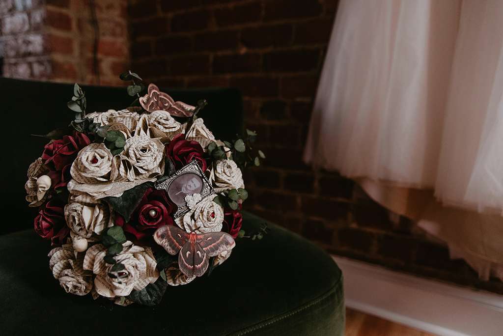 For their October wedding, Faith and Shawn wanted to tie their love of literature (especially, Edgar Allan Poe) with a kind of ethereal, subtly obscure vibe. They used personalisation throughout; in fact, Faith was adamant she didn’t want a traditional wedding at all. Attention to detail was paramount, with no area left untouched.