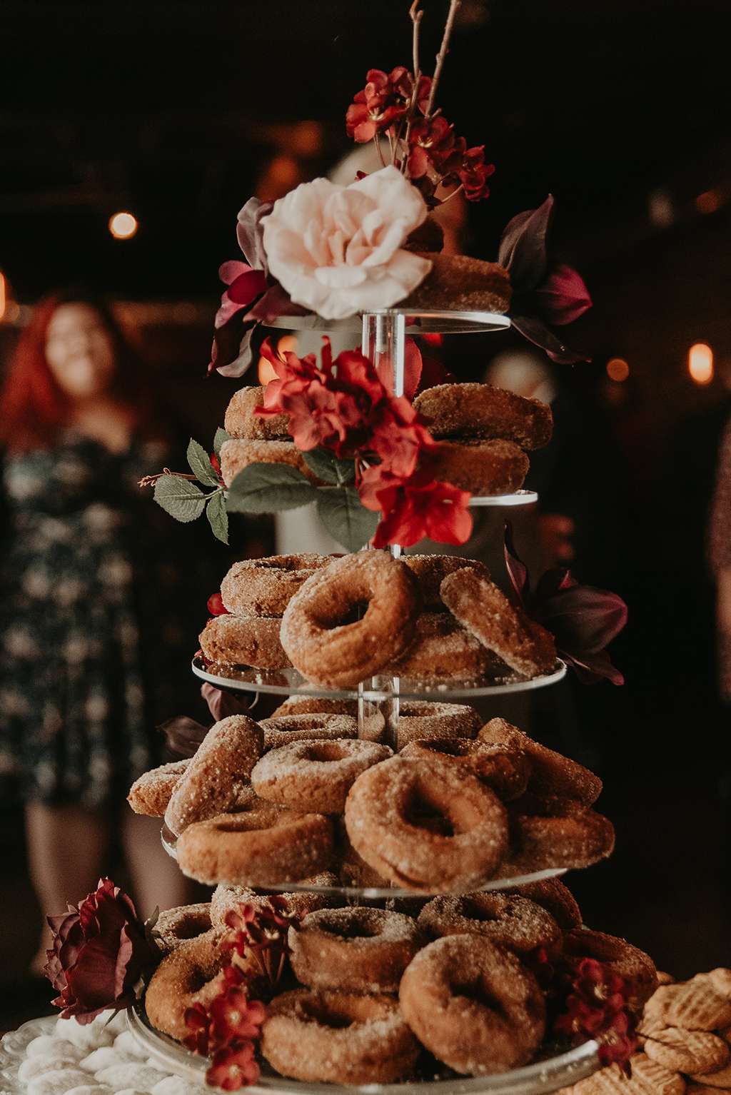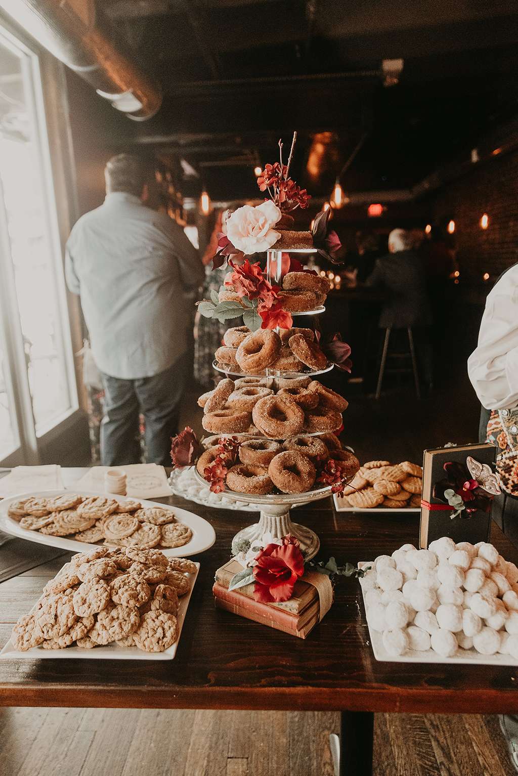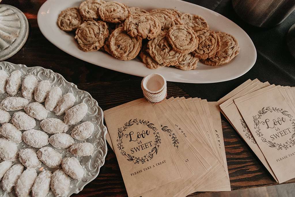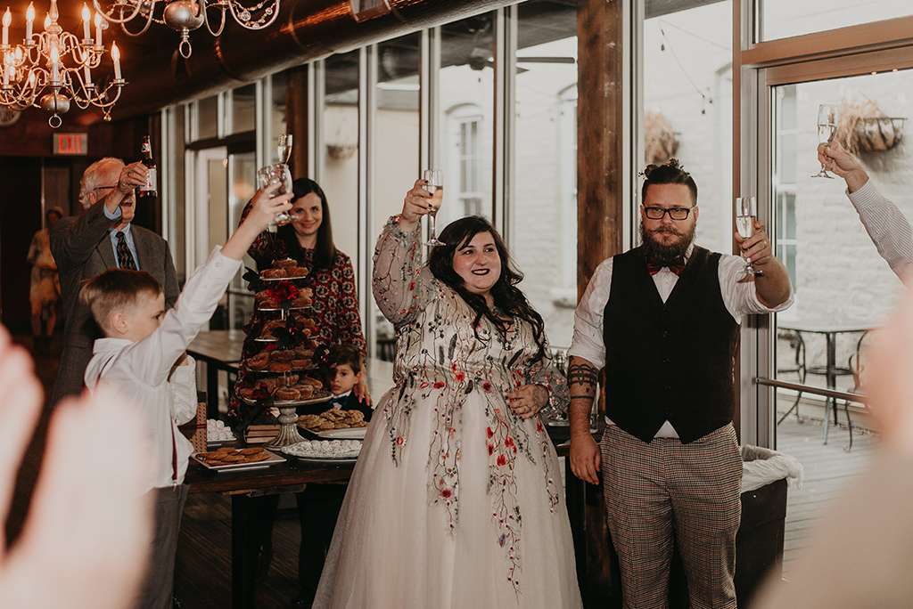 Their reception at was held at Granstaff and Stein, just down the road. Being a speakeasy, guests were required to offer a password to enter; they used ‘nevermore’ to tie in with the Poe theme of the wedding. Instead of a traditional three-tier wedding cake, the couple opted for an apple doughnut tower and cider toast in lieu of champagne toast. To cut costs they only served appetisers instead of a full sit down meal. They had a traditional Pittsburgh cookie table, where family members baked cookies for people to help themselves to and even take home.
