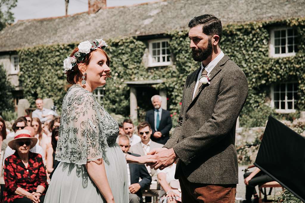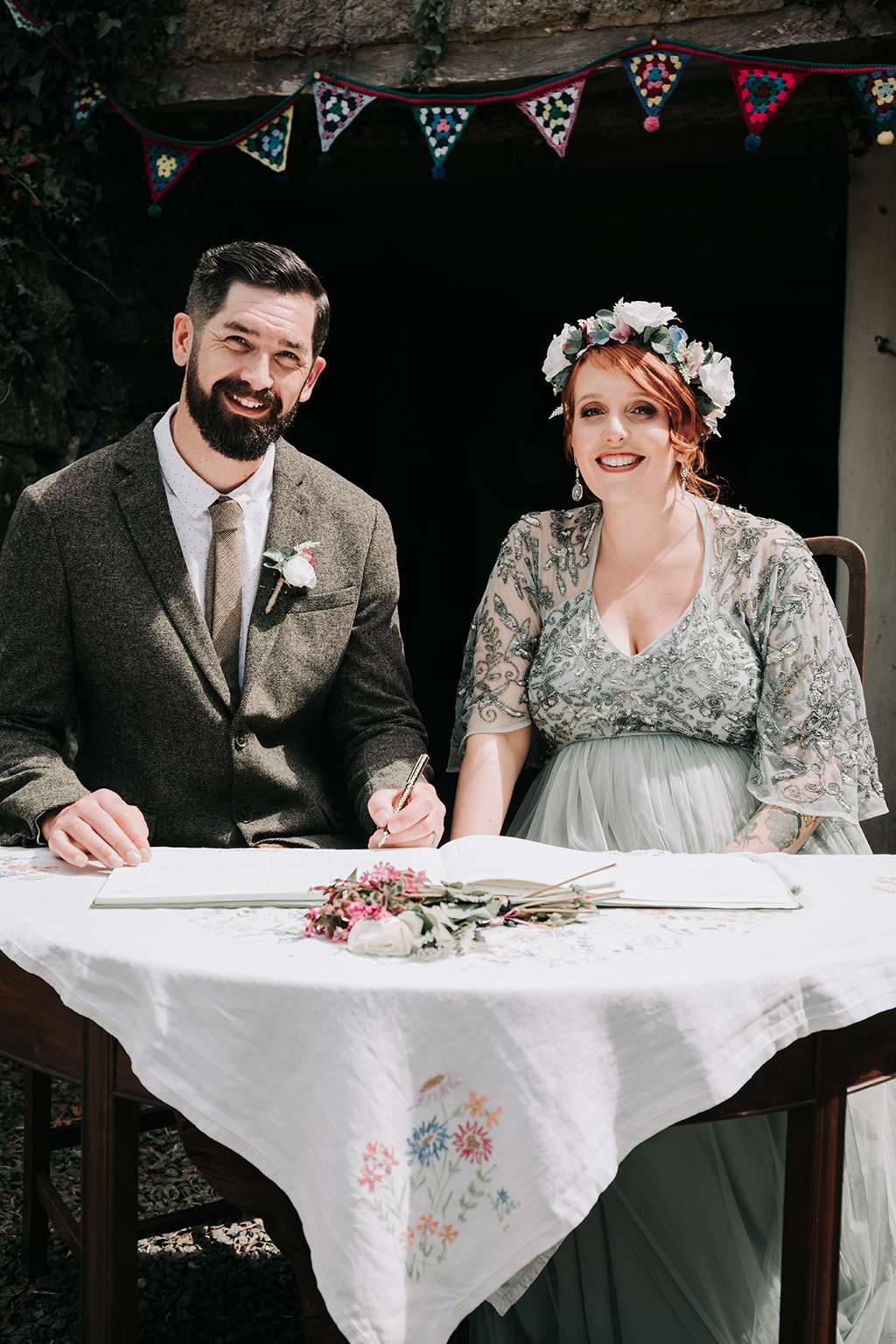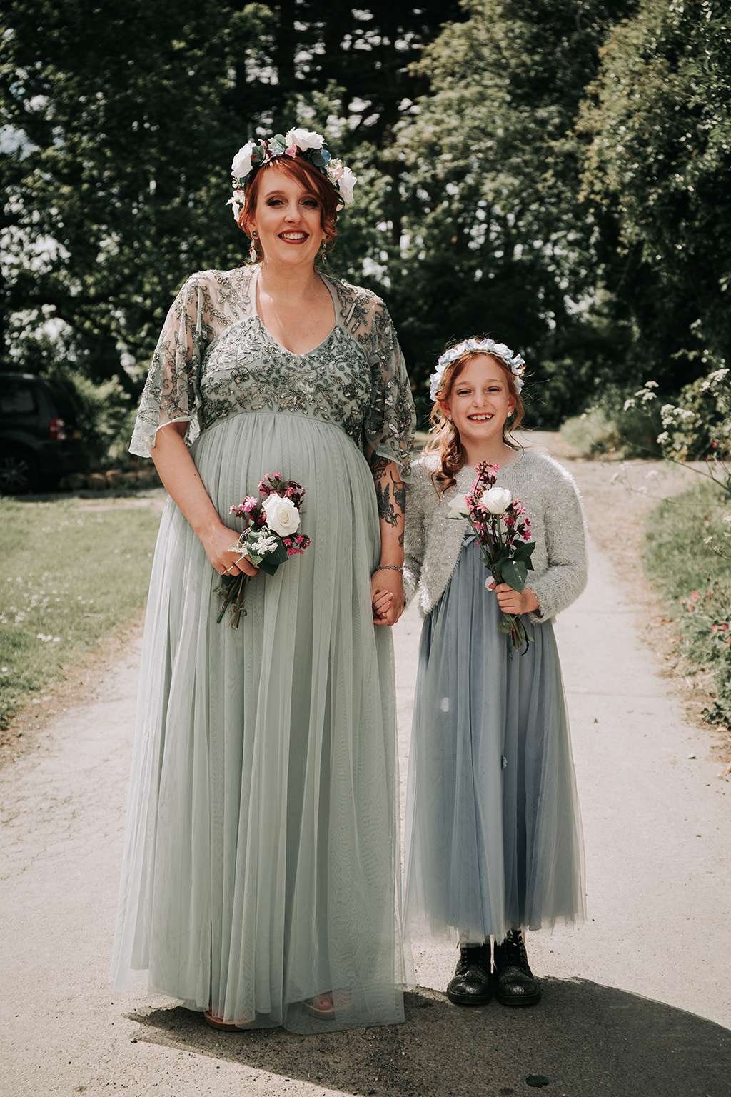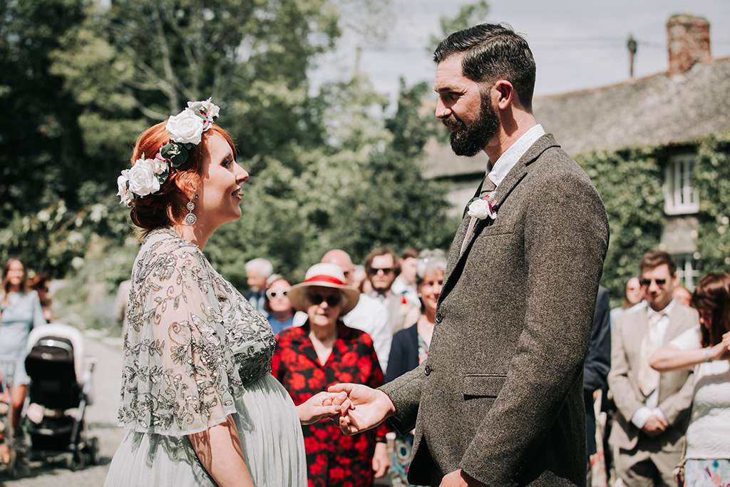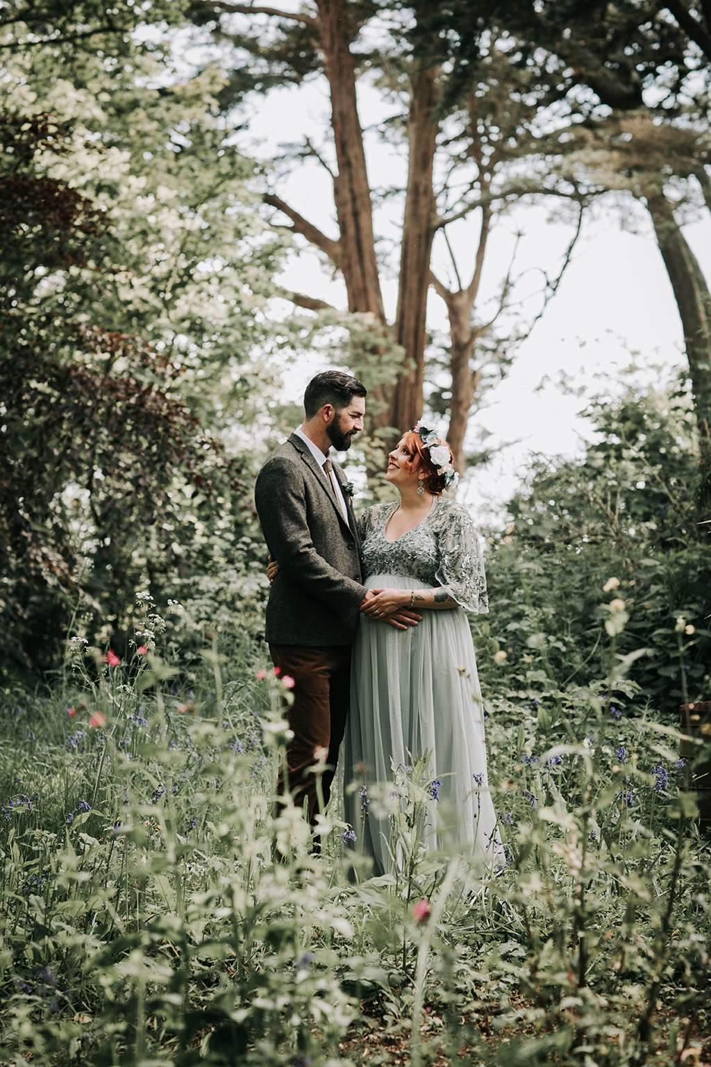 Sharron was seven months pregnant for their big day and they nearly cancelled when they found out, but instead worked with the venue to make some changes to fit their budget. The bride wore a green maternity dress from Maya at ASOS, paired with a real floral crown from Cornish Flower Crowns. Her friends, and bridesmaids, kindly gifted her hair and make up as budget wouldn’t allow for it. Keeping the catering casual helped keep costs down, and another friend kindly made their cake.