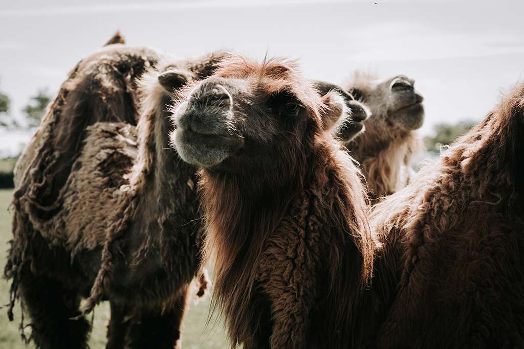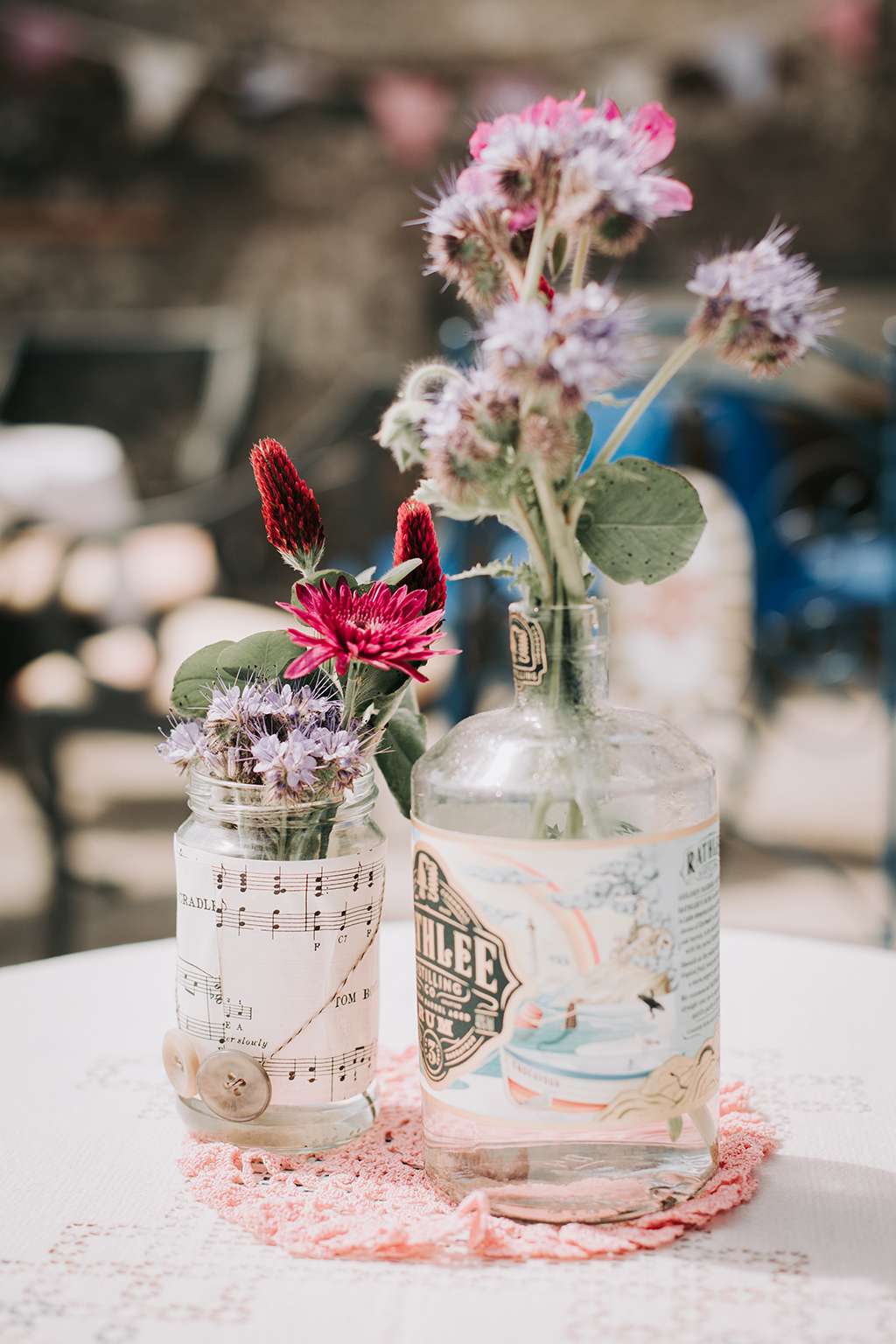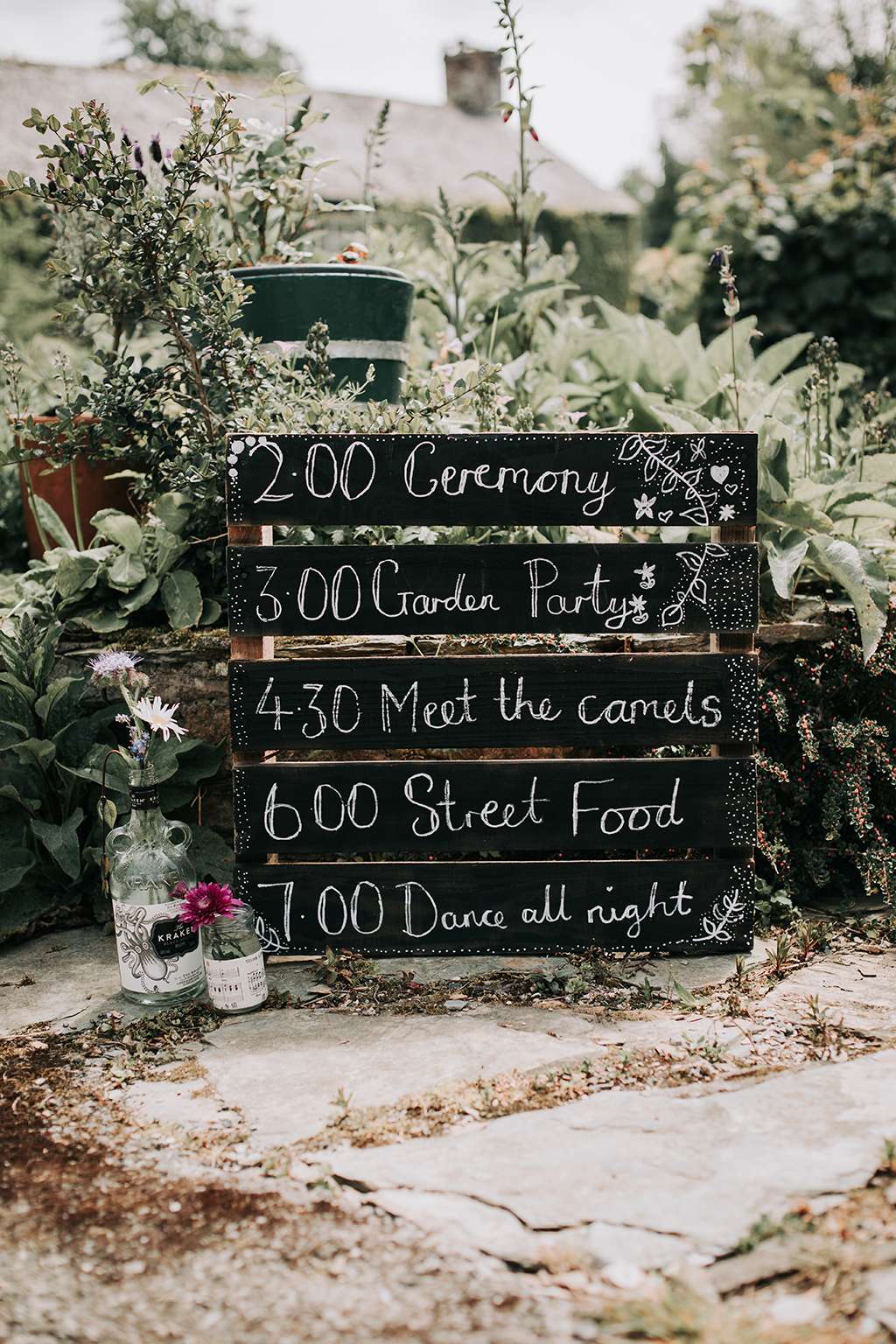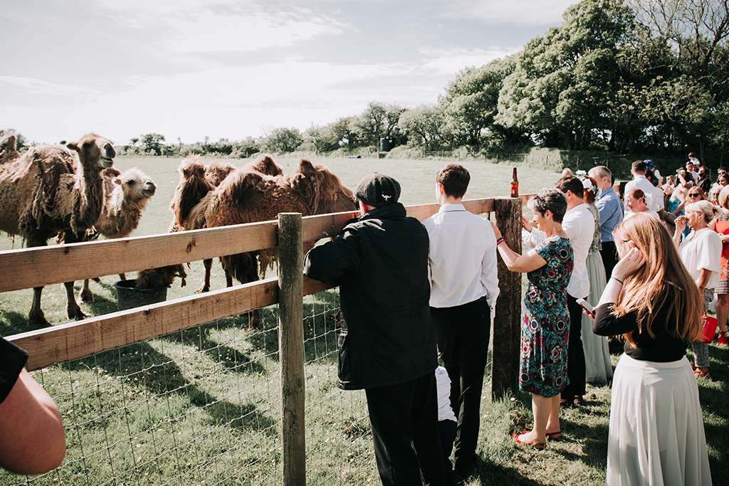 With a £3,500 budget, they kept things super simple and low key. Guests were told to bring a picnic blanket and a chair. They served a cream tea picnic as a wedding breakfast followed by vegan street food later on. The entertainment was already provided in the form of the resident camels, who were looking adorably dishevelled as their fur was malting. They kept decor simple, with table decorations of jars with sheet music wrapped around and bunting loaned from a friend’s previous wedding.