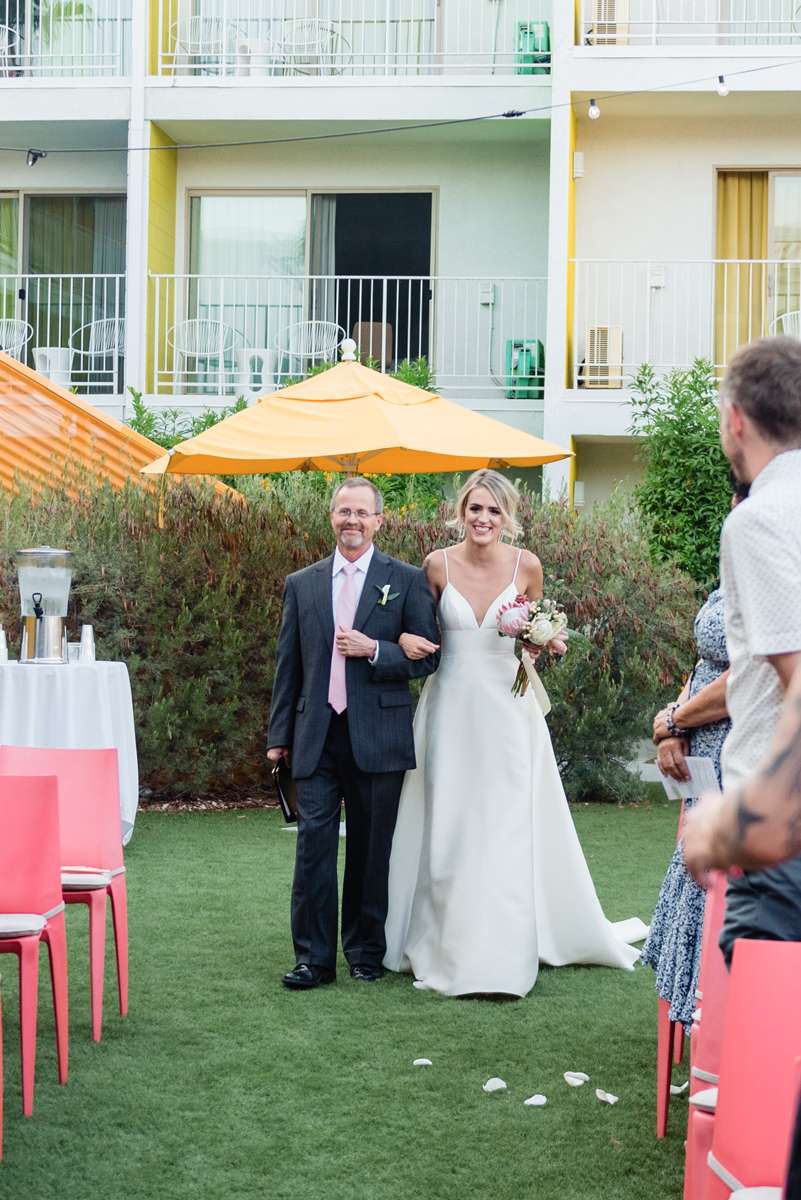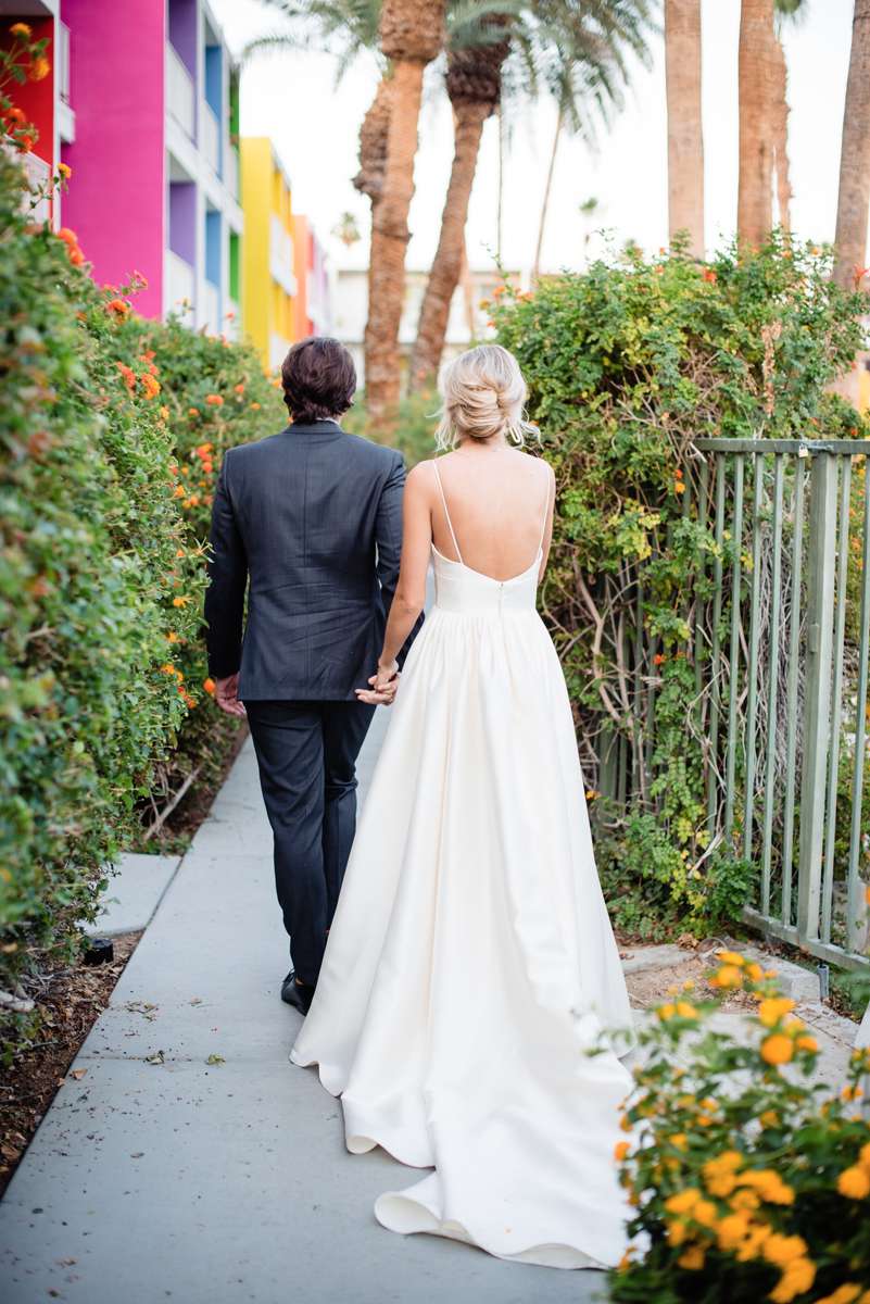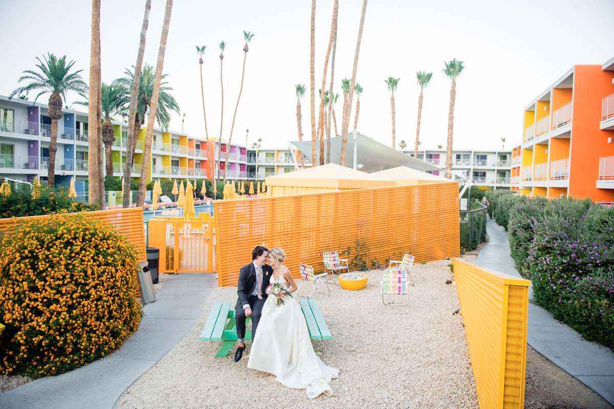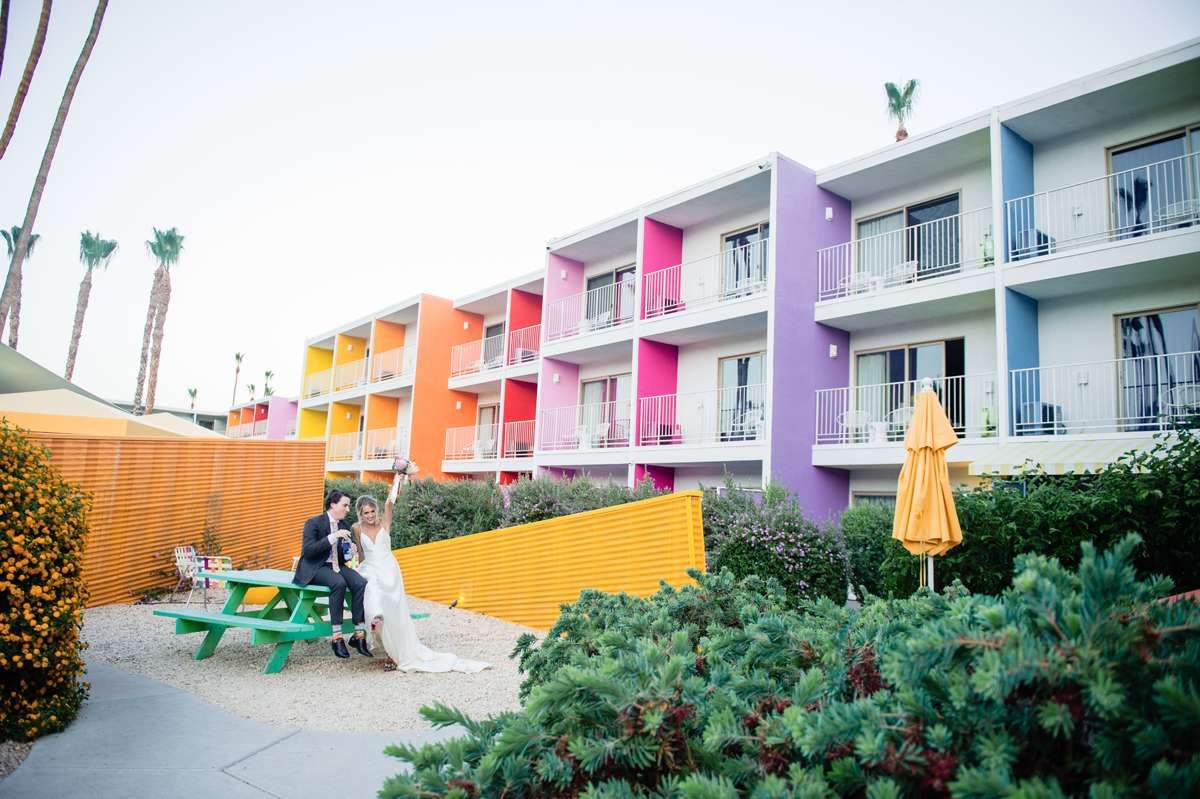 Ali’s main goal for her June wedding to Mike was for it to feel modern and contemporary with a colourful edge. They chose the iconic Saguaro Hotel in Palm Springs which obviously ticked all the colourful boxes! They didn’t need to add much in the need of extra decor at all, using the rainbow backdrop of the hotel in all their photos.