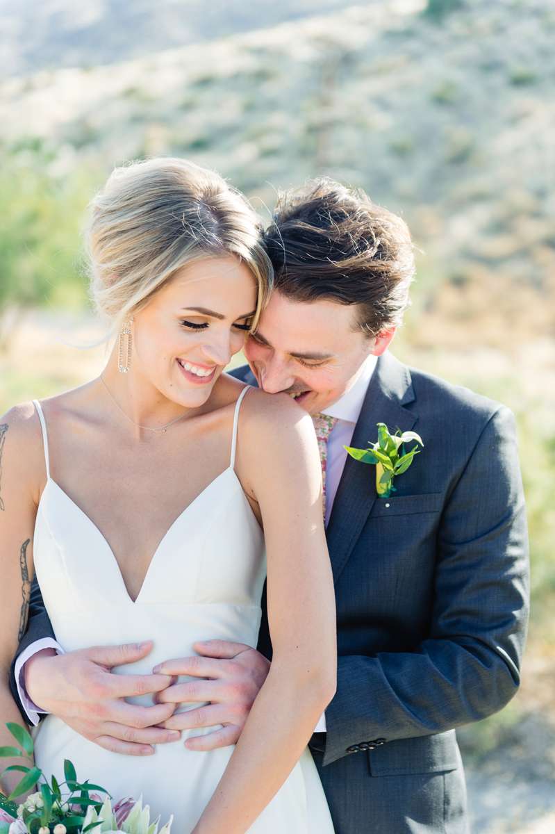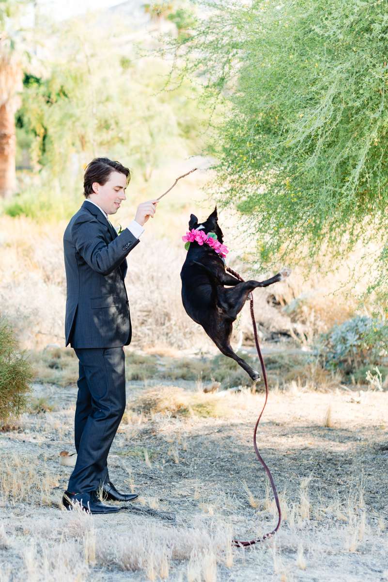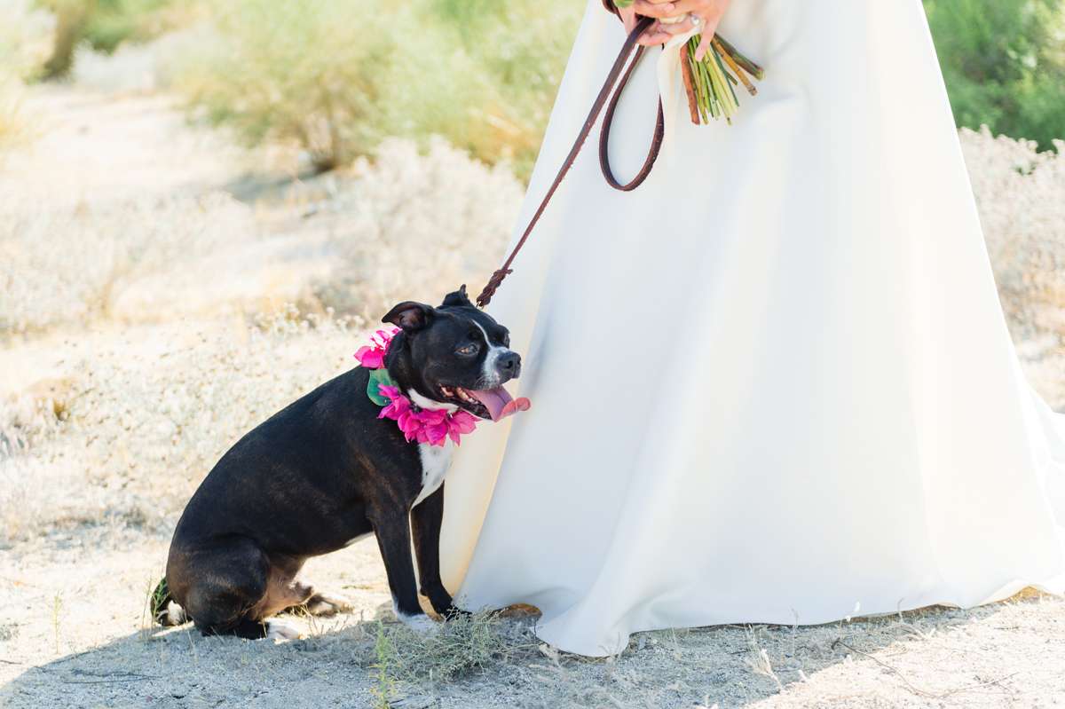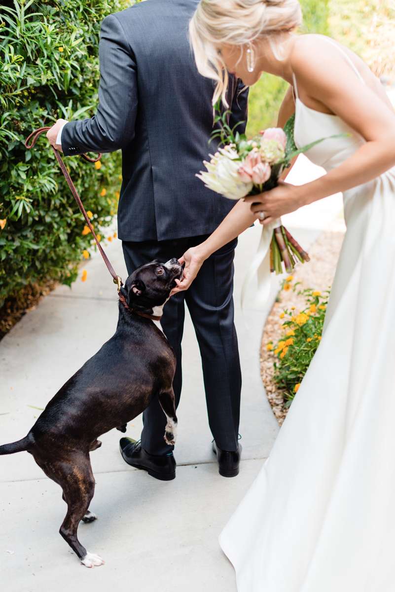 After the ceremony, they drove out to the desert for some portraits with their dog, Snacks, and ended the night with a reception back at the hotel. “I really enjoyed the reception”, Ali remembered. “I liked being able to talk to all of our friends in one big room together. I also enjoyed the moments when our photographer and videographer would pull us away from the party to get some footage. It allowed us to re-centre ourselves and take a moment to remember the reason we were all there and dressed up in the first place!”
