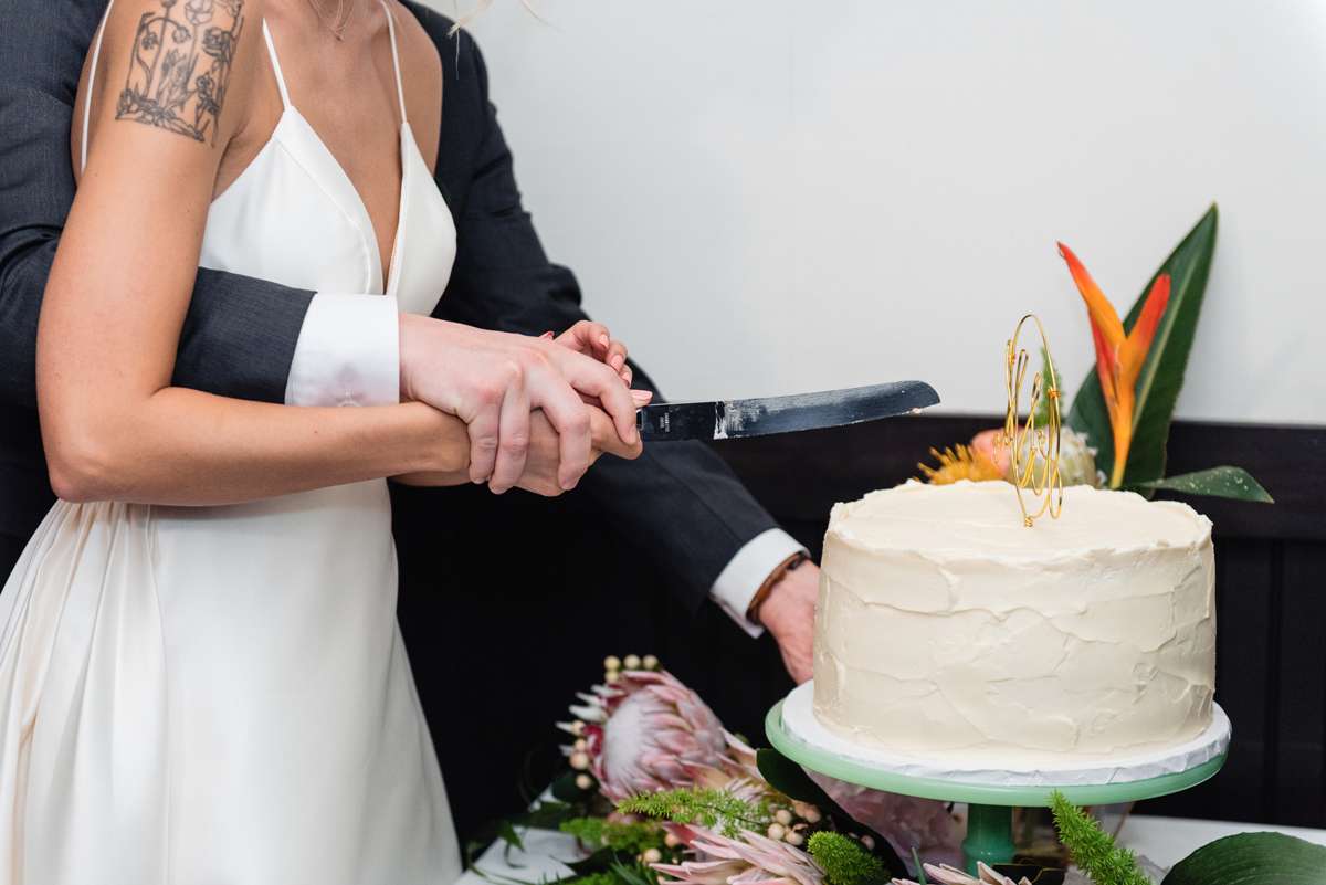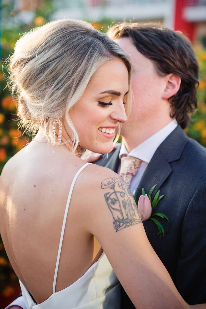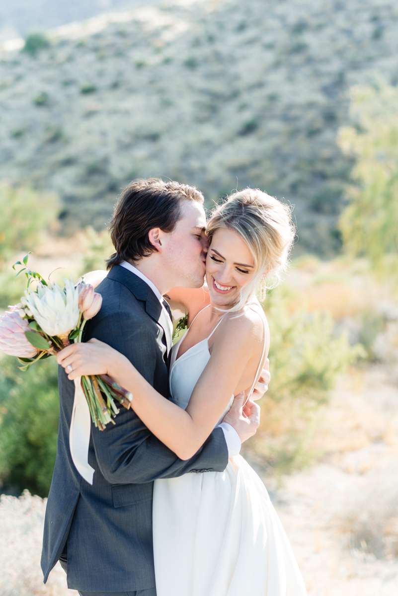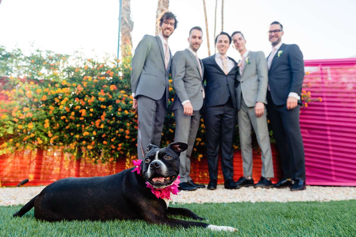 After the ceremony, they drove out to the desert for some portraits with their dog, Snacks, and ended the night with a reception back at the hotel. “I really enjoyed the reception”, Ali remembered. “I liked being able to talk to all of our friends in one big room together. I also enjoyed the moments when our photographer and videographer would pull us away from the party to get some footage. It allowed us to re-centre ourselves and take a moment to remember the reason we were all there and dressed up in the first place!”