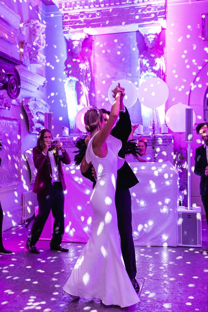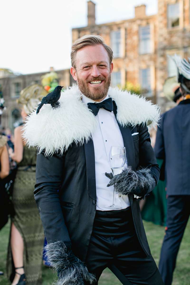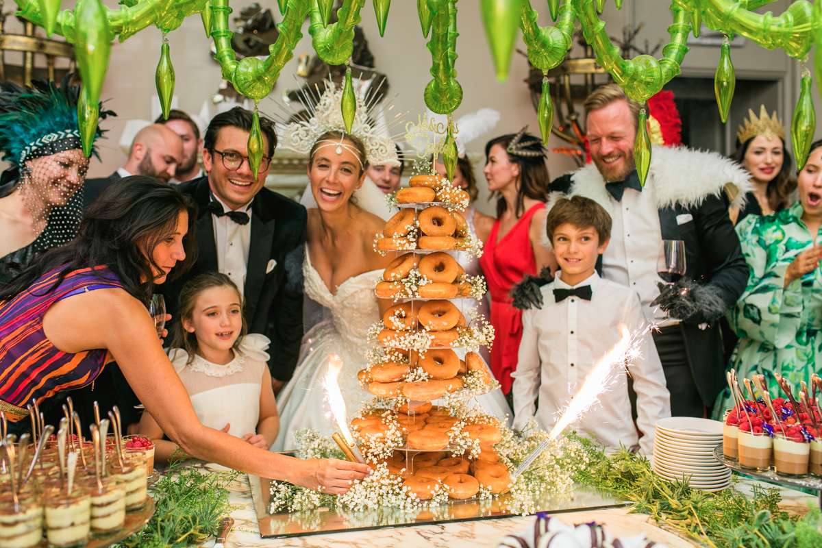 “Our wedding was black tie but with limitless colour everywhere else” Melissa explained, “We didn’t want to hold back! We suggested that our guests wore feathers, headpieces and glitz – the bigger the better! Luke’s mother wore a self-designed hat made of childhood pictures of the us both and my mother wore a feathered black nest with two storks sitting on top to encourage the birth of a grandchild!”