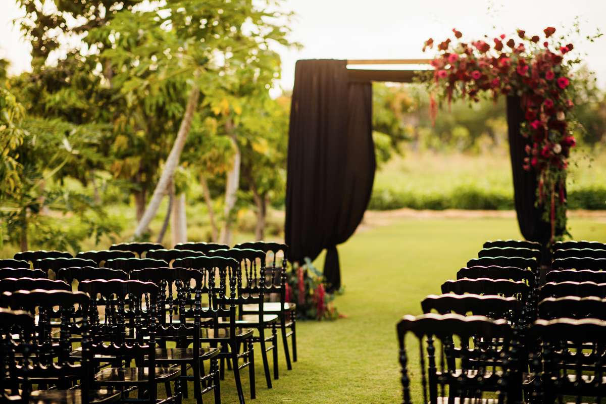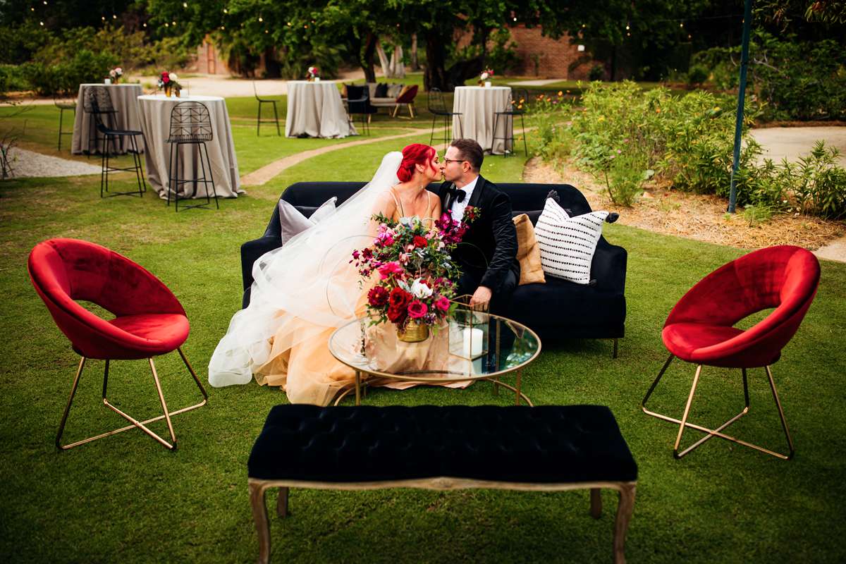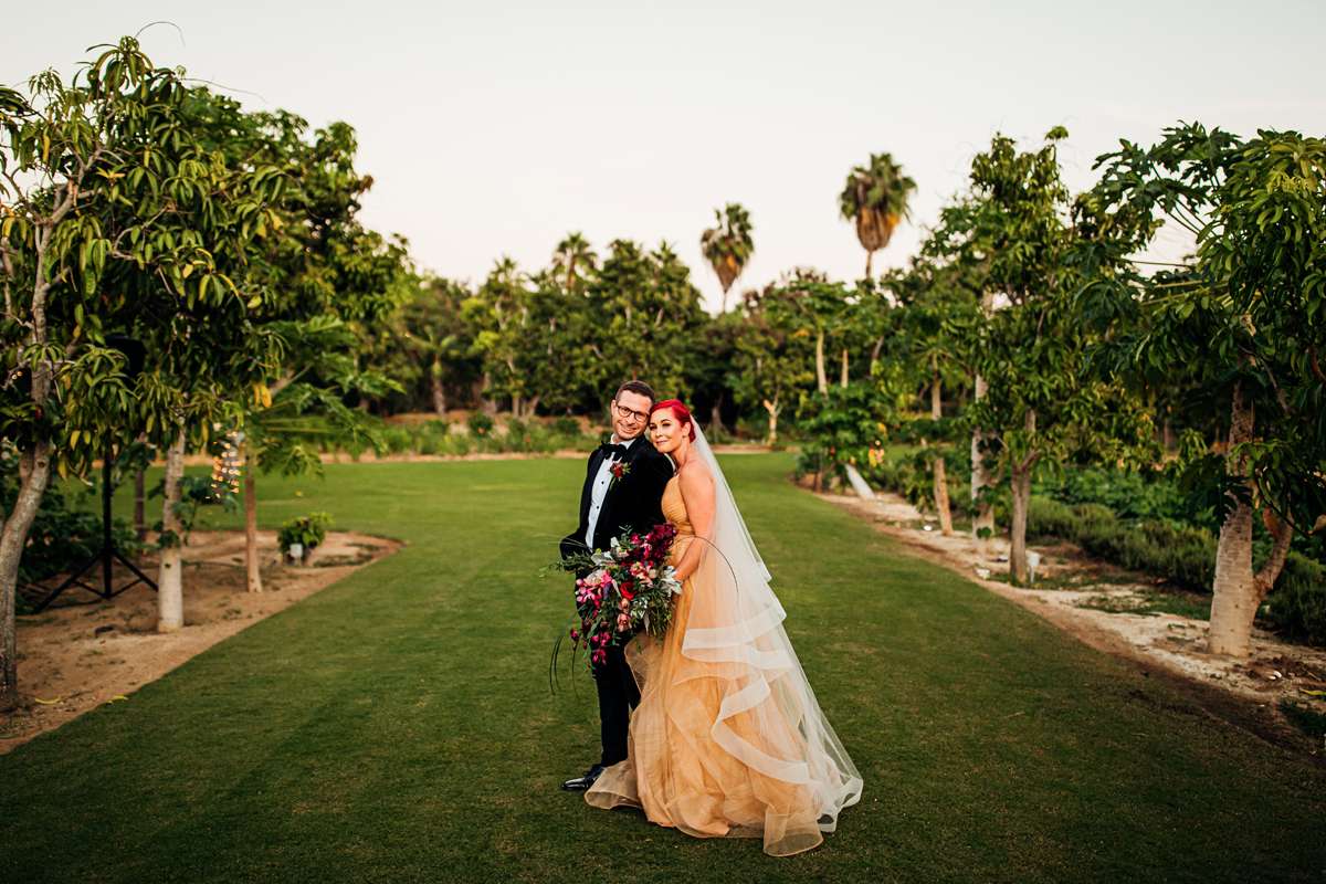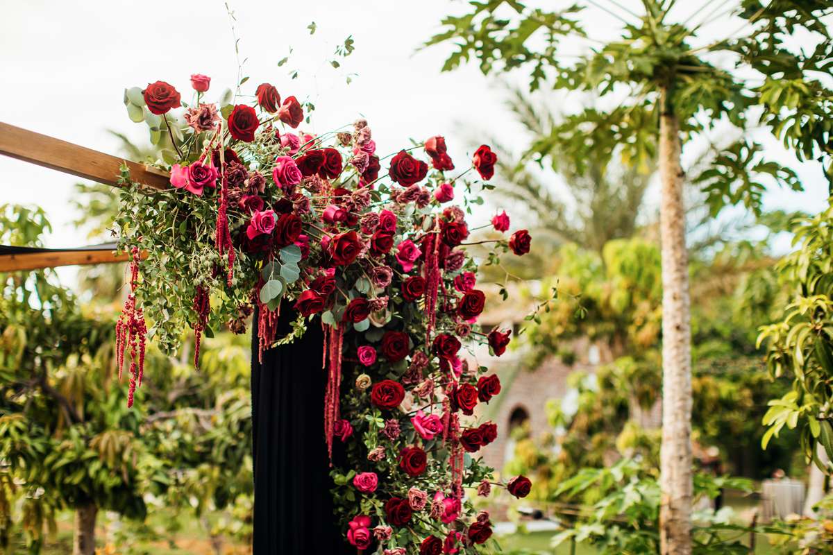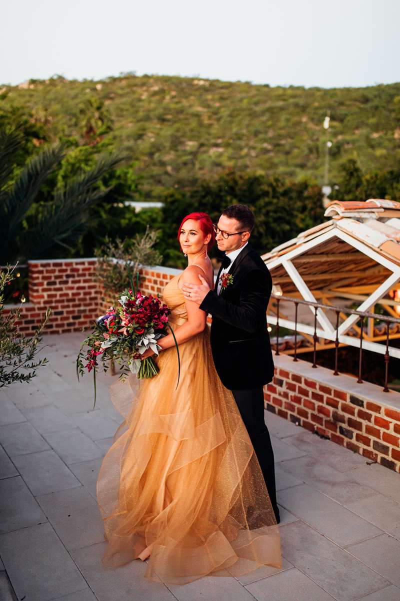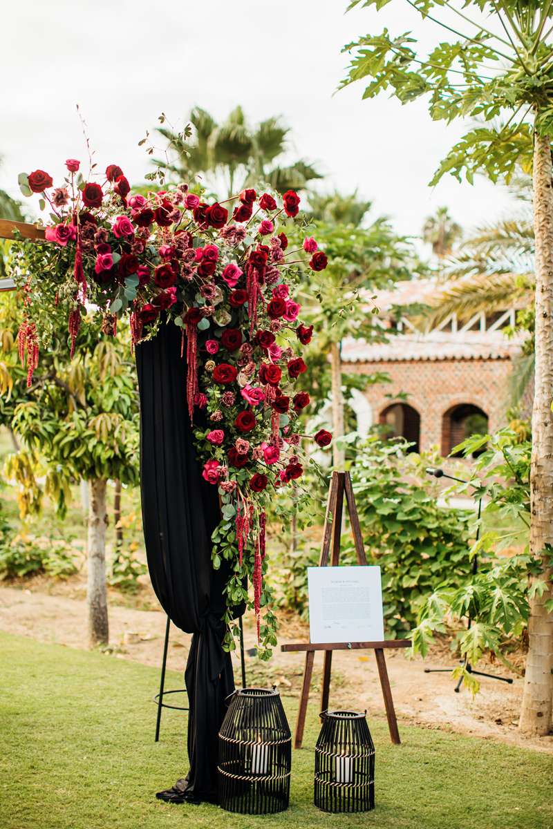 Inspired by the bride’s flame red hair, Robyn and Michael had a black and gold colour scheme with accents of burgundy for their November wedding. Held at Flora Farms, in Cabo, Mexico, they had a Jewish ceremony officiated by Michael’s stepmother, followed by a glamorously styled yet super informal outdoor reception for their 60 guests.