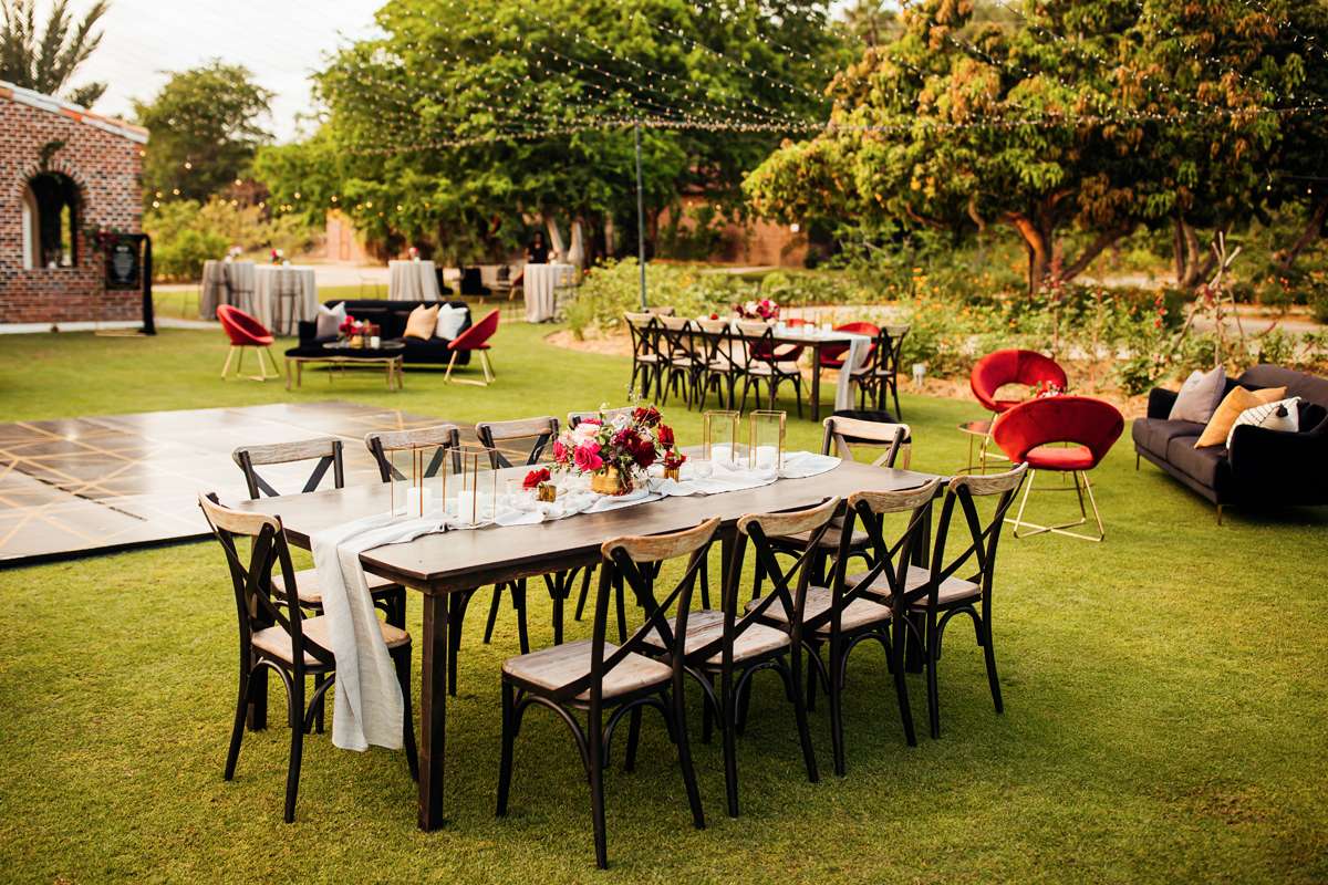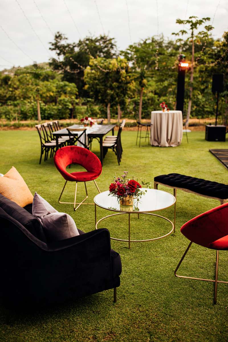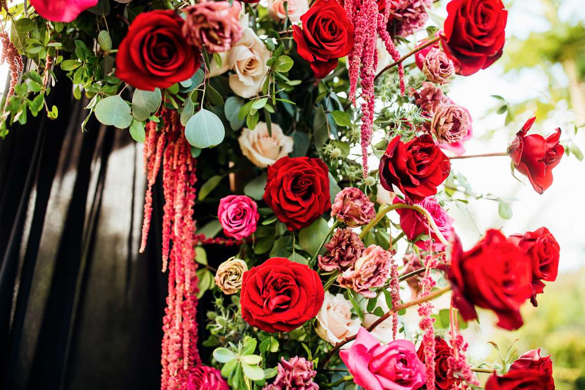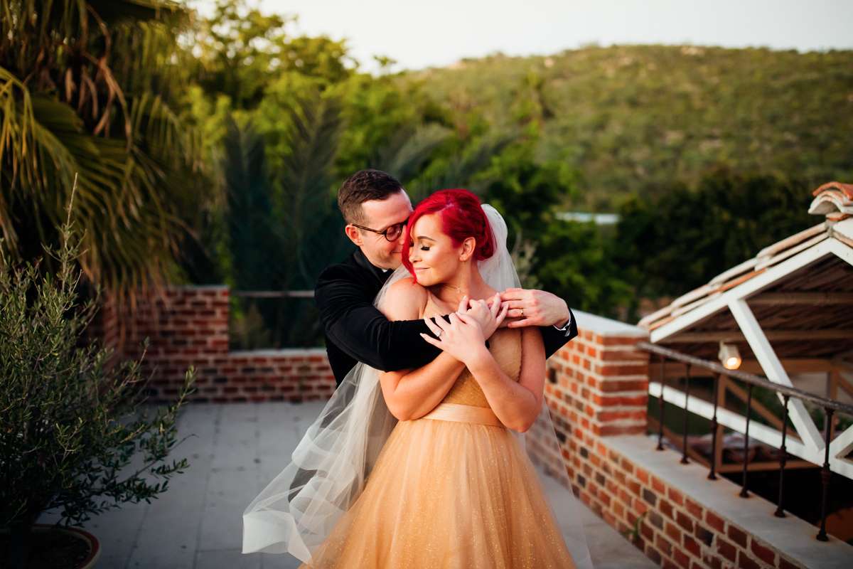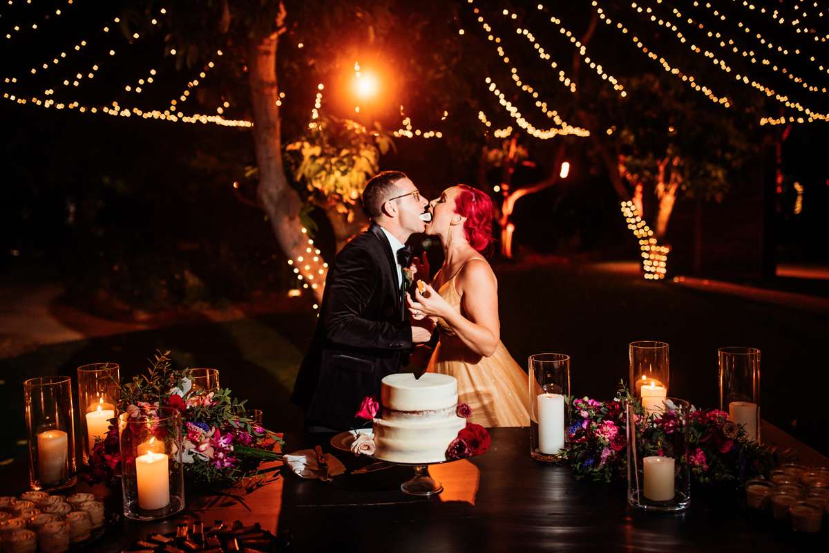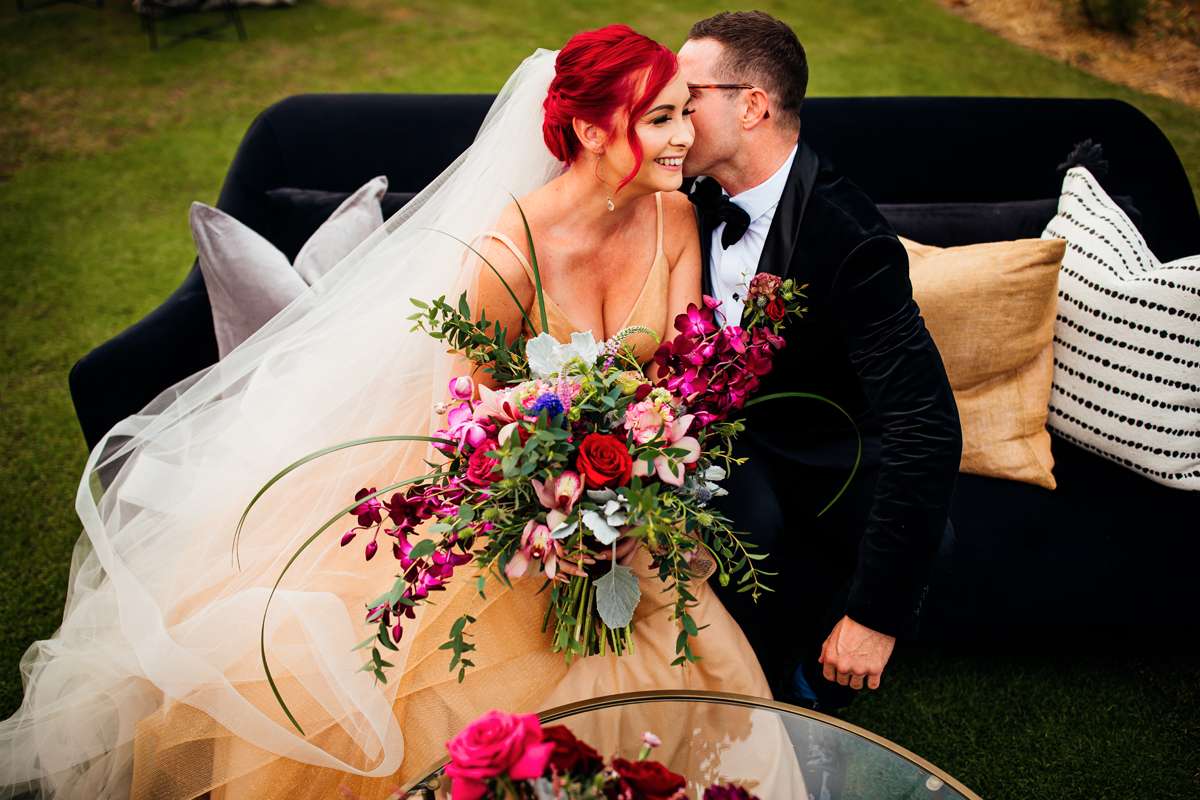 Inspired by the bride’s flame red hair, Robyn and Michael had a black and gold colour scheme with accents of burgundy for their November wedding. Held at Flora Farms, in Cabo, Mexico, they had a Jewish ceremony officiated by Michael’s stepmother, followed by a glamorously styled yet super informal outdoor reception for their 60 guests.