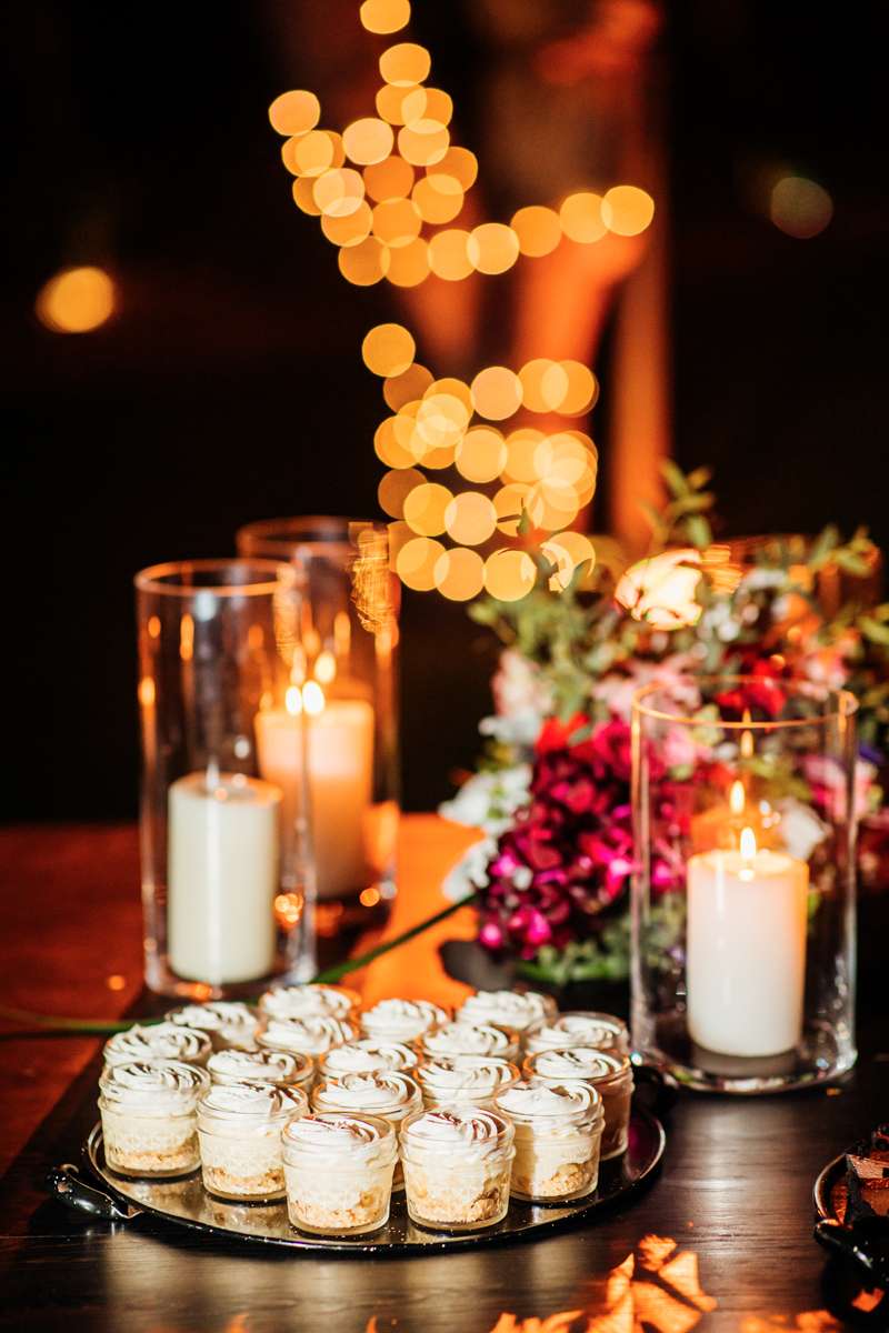 The venue also provided the cake and did all the catering, and to keep the reception informal the couple opted to not have a sit down dinner. They wanted their guests to be able to eat and drink when they wanted and talk to whomever they wanted too! They passed hors d oeuvres around the entire evening and had a dessert and wood-fried pizza station!