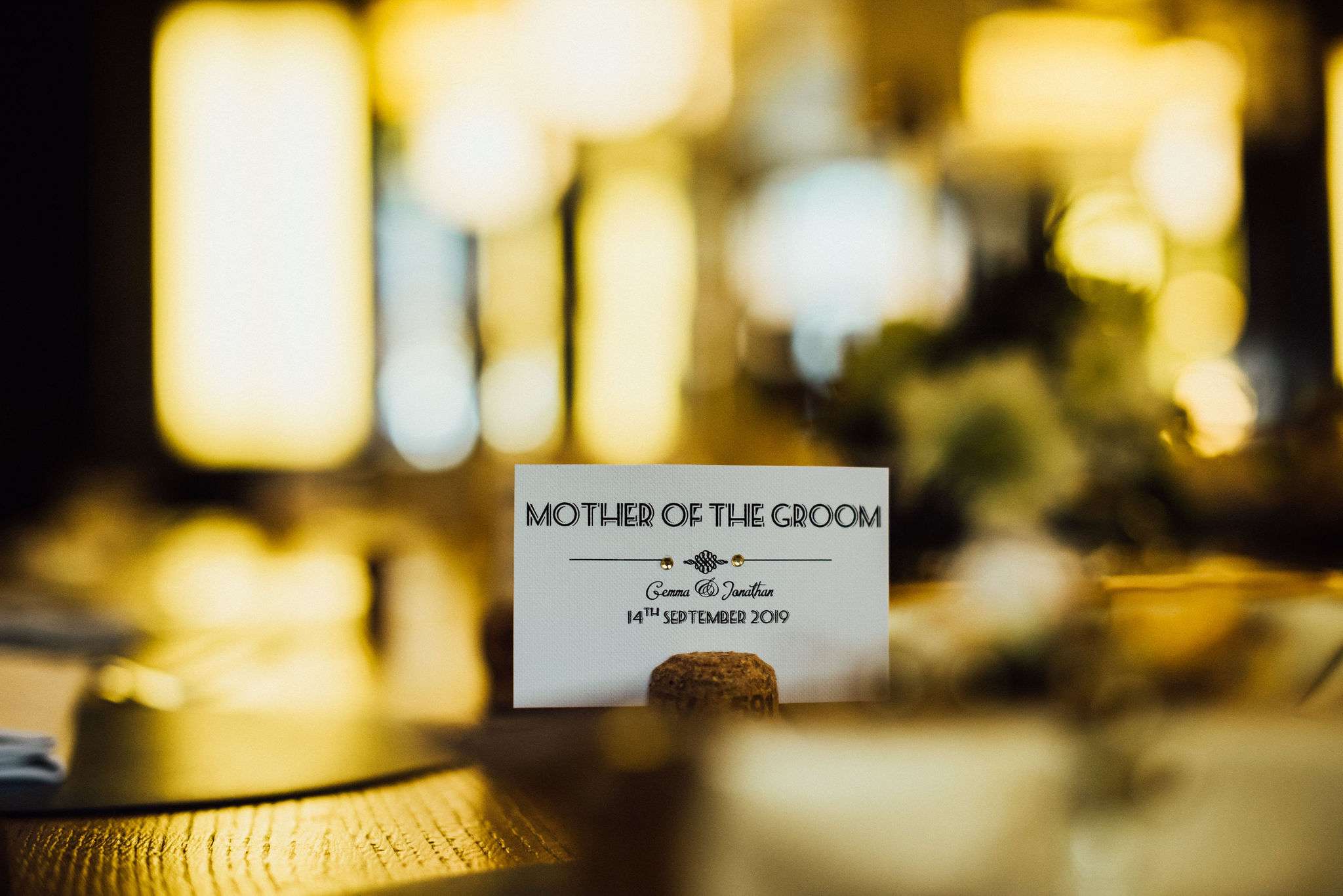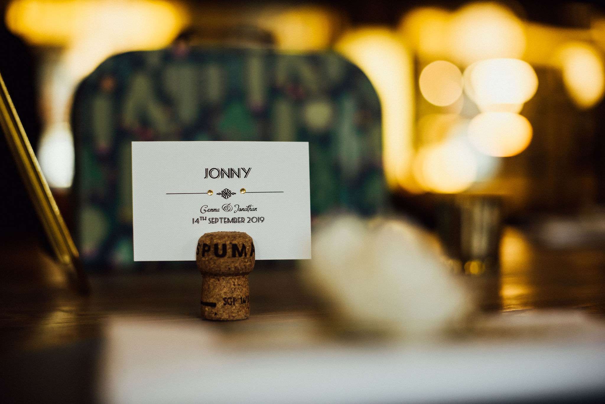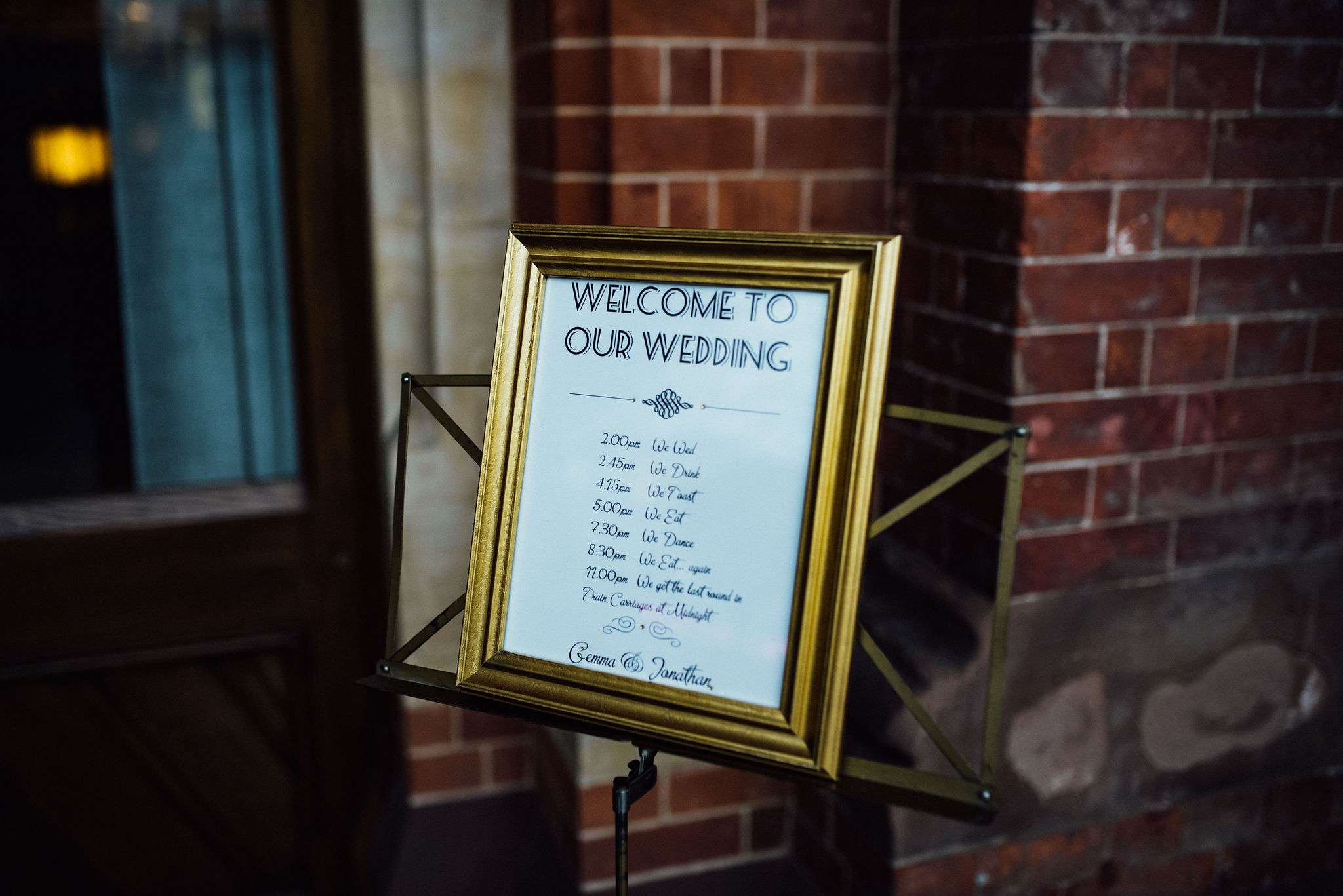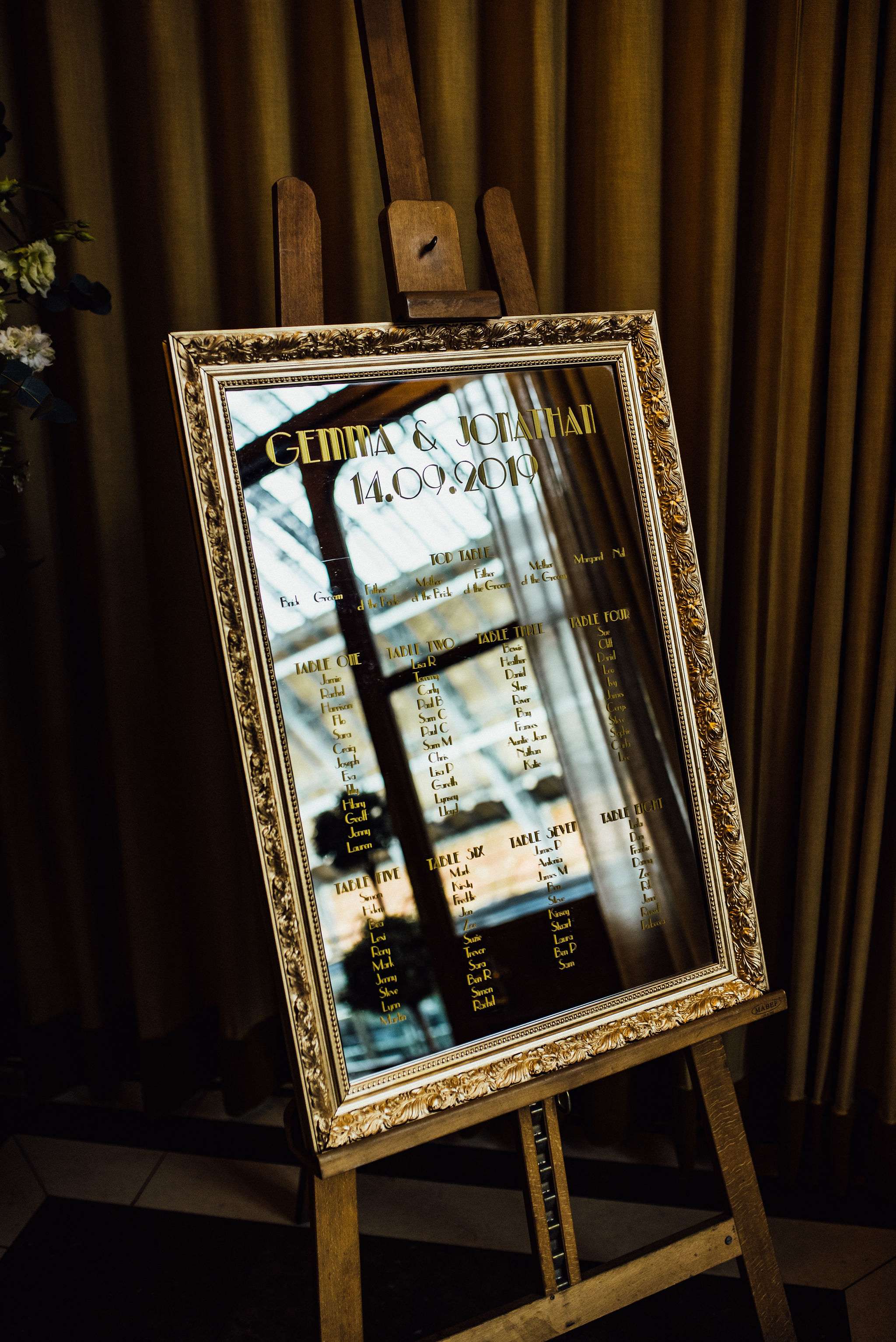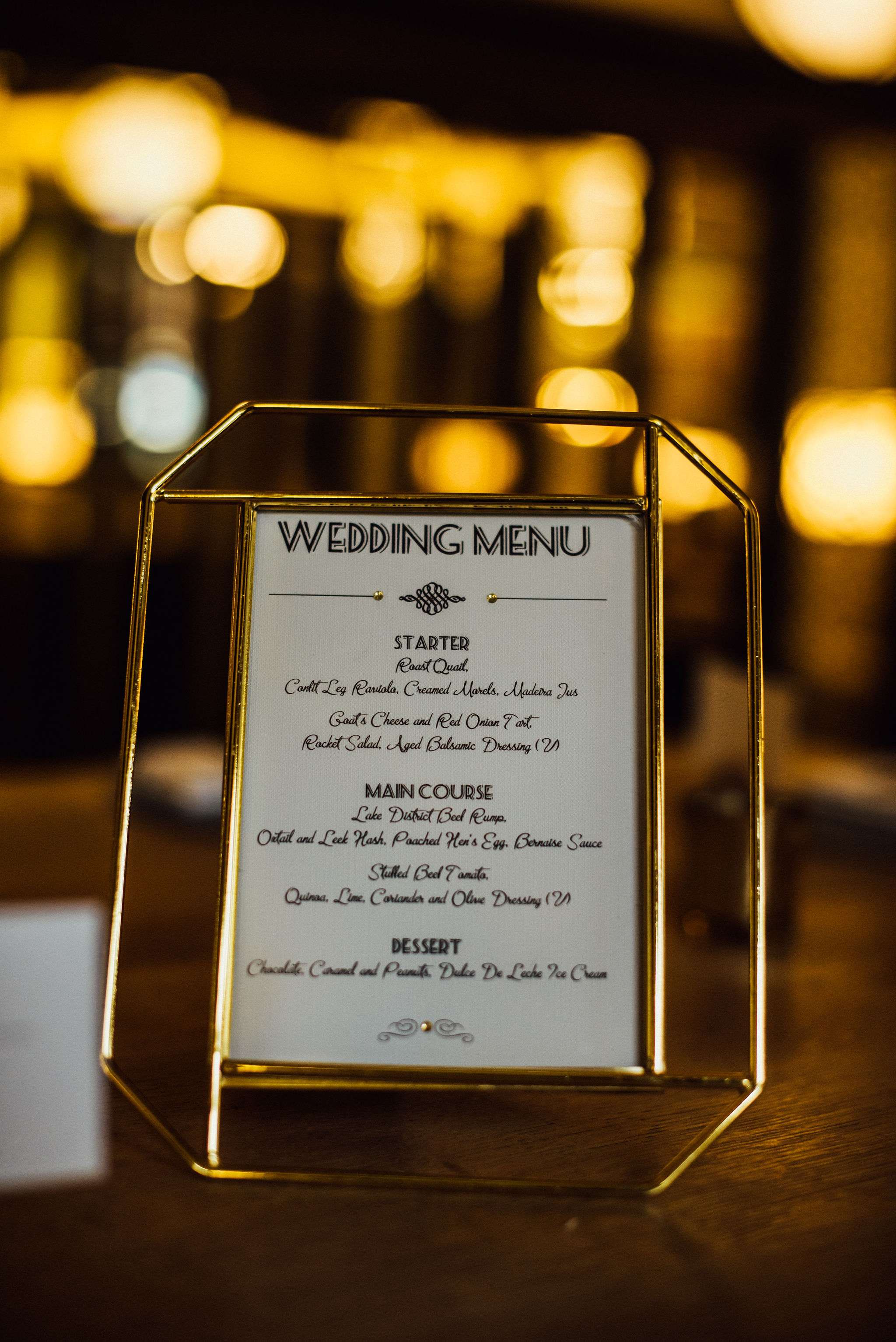 They spend around £20k, but made lots of money saving choices to keep within their budget. The bride’s dress was, unbelievably, made for her by a friend and cost them just £80. In fact, dry cleaning it afterwards was more expensive! The bridesmaids were in ASOS dresses (a steal at £12 each), the stationery and signage were all DIY and the art deco mirror which they painted the seating plan on was a car boot find. All the frames for the photos and menus all came from charity shops and Gemma collected champagne corks to use as place card holders.