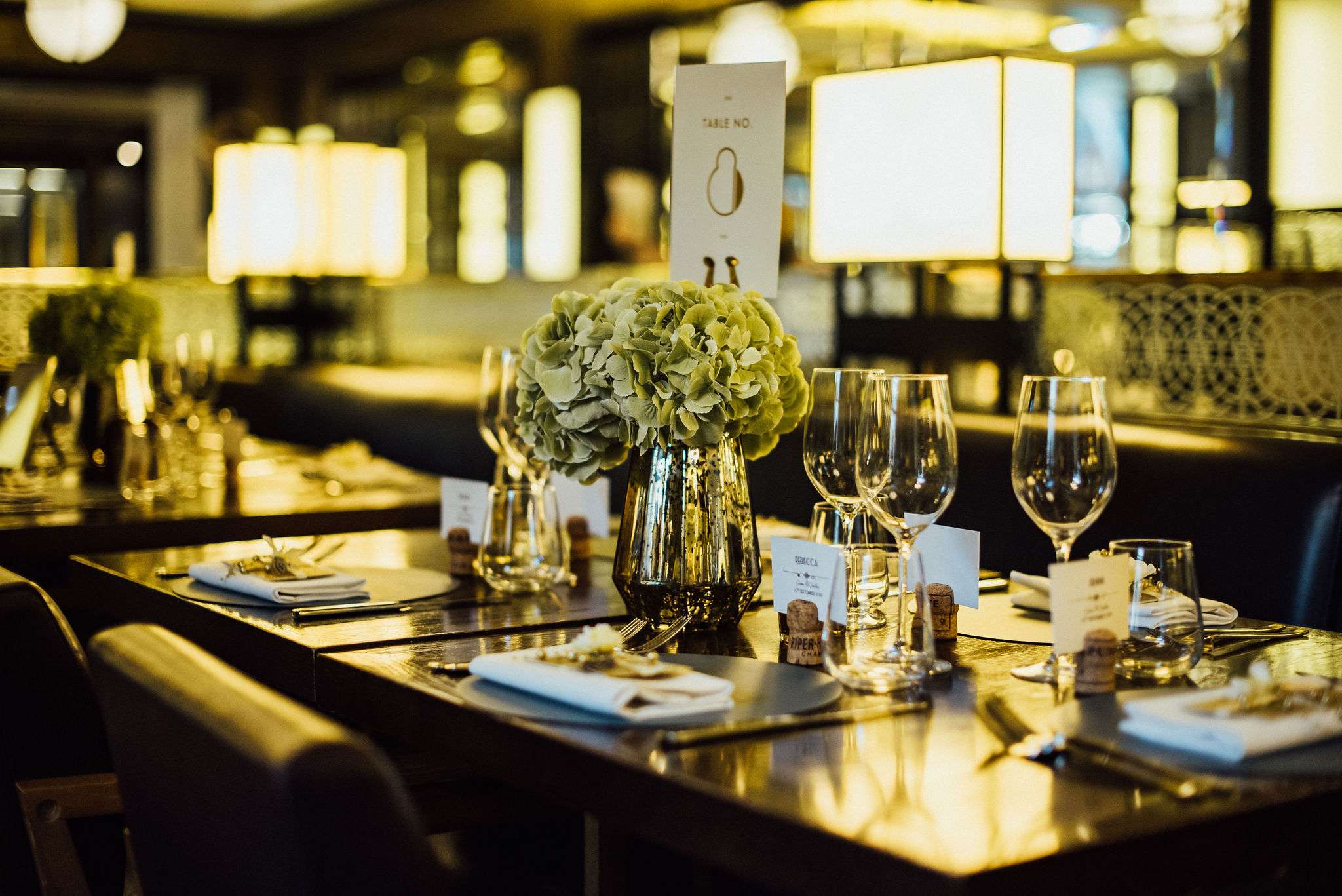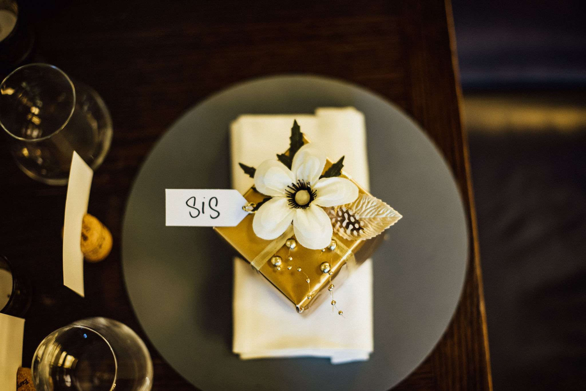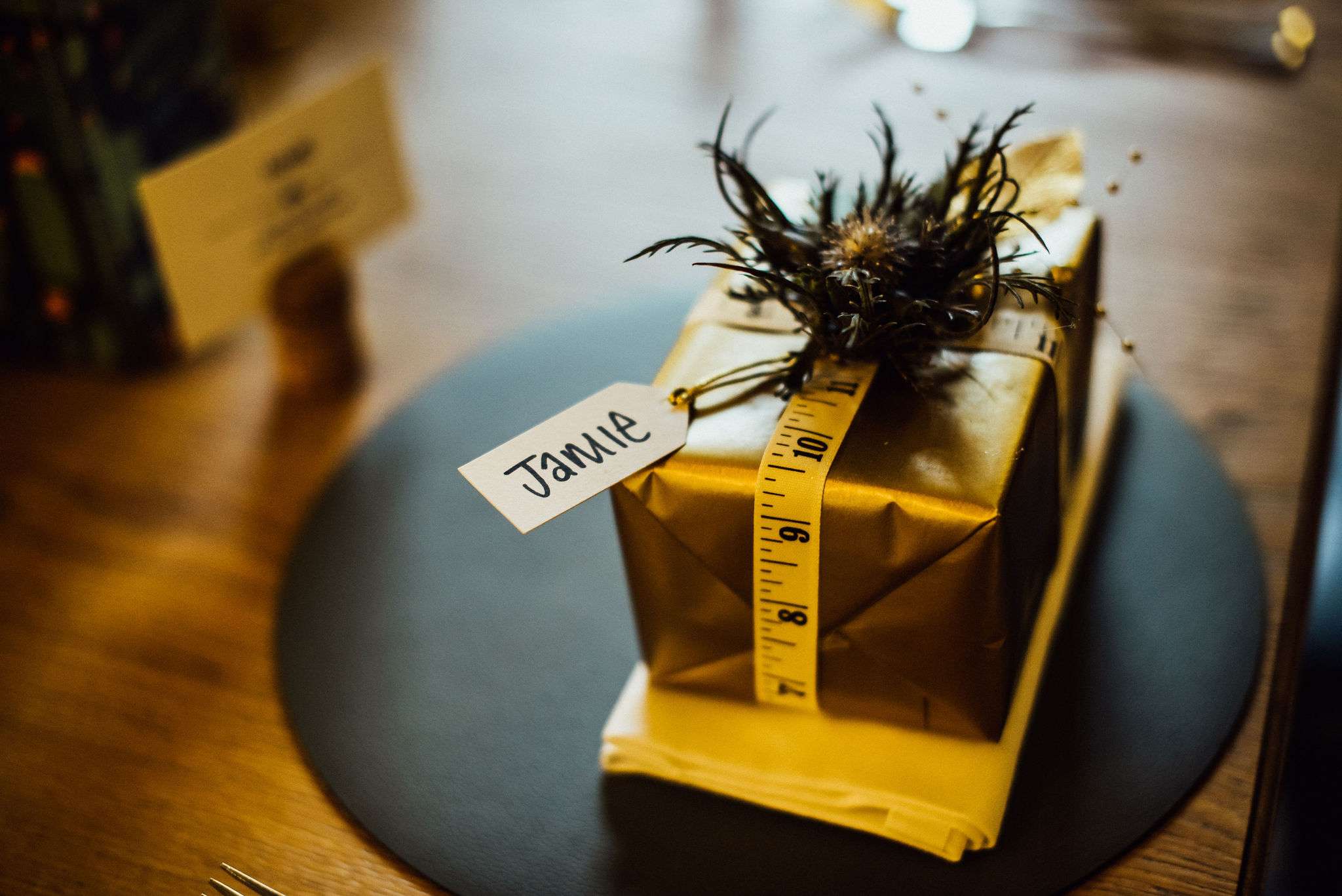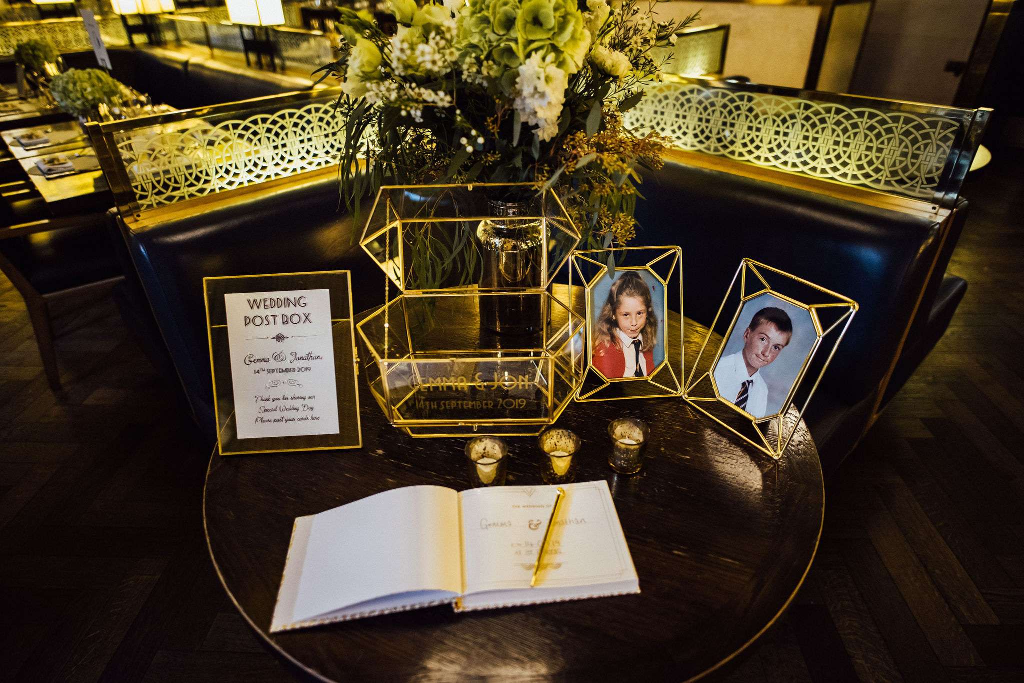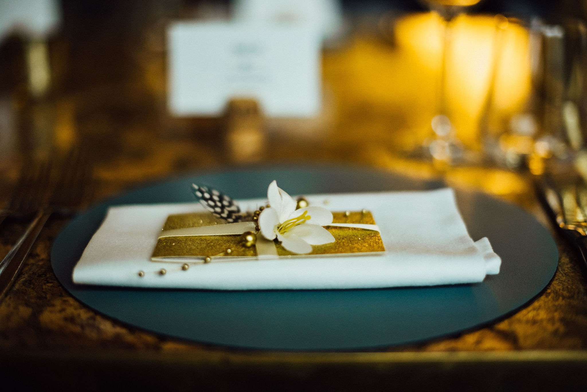 They spend around £20k, but made lots of money saving choices to keep within their budget. The bride’s dress was, unbelievably, made for her by a friend and cost them just £80. In fact, dry cleaning it afterwards was more expensive! The bridesmaids were in ASOS dresses (a steal at £12 each), the stationery and signage were all DIY and the art deco mirror which they painted the seating plan on was a car boot find. All the frames for the photos and menus all came from charity shops and Gemma collected champagne corks to use as place card holders.
