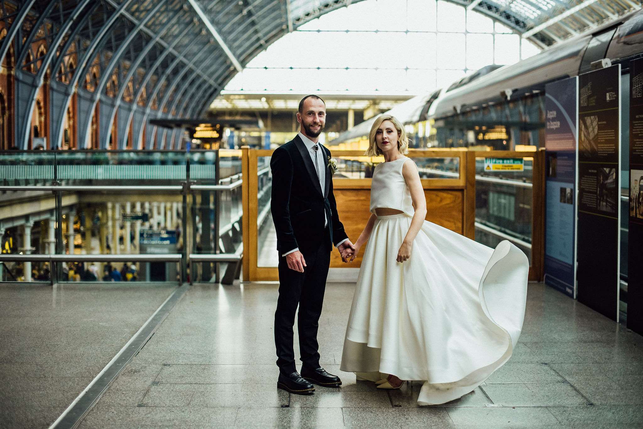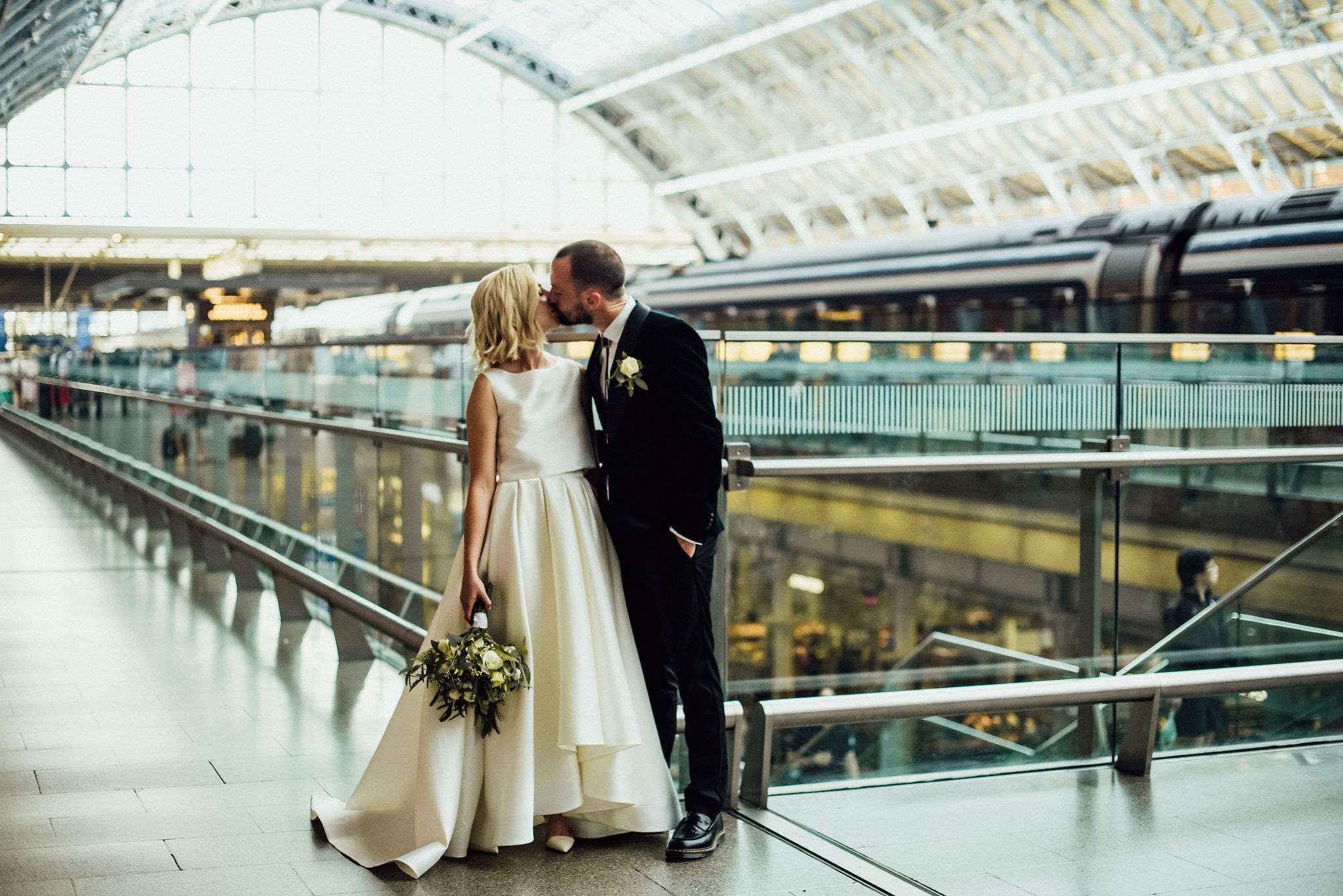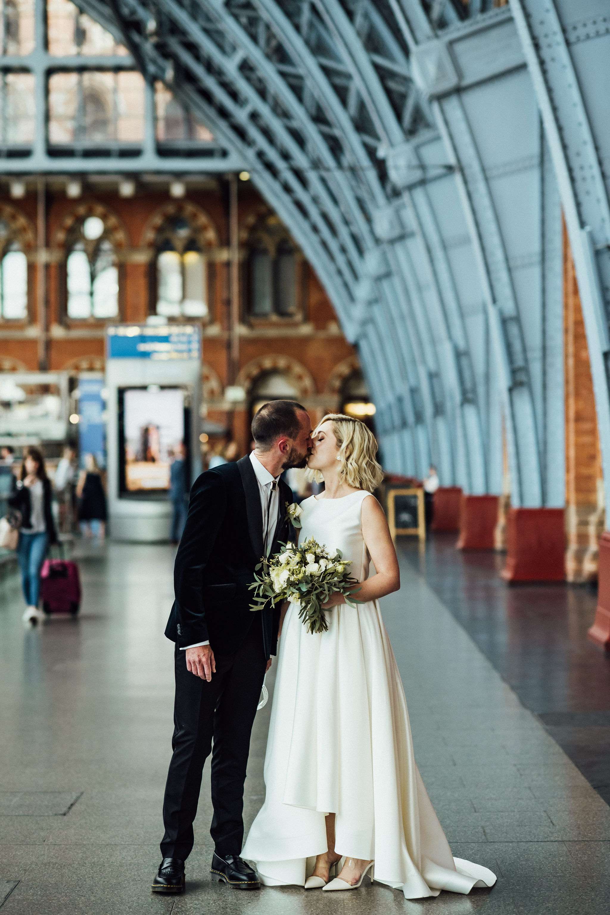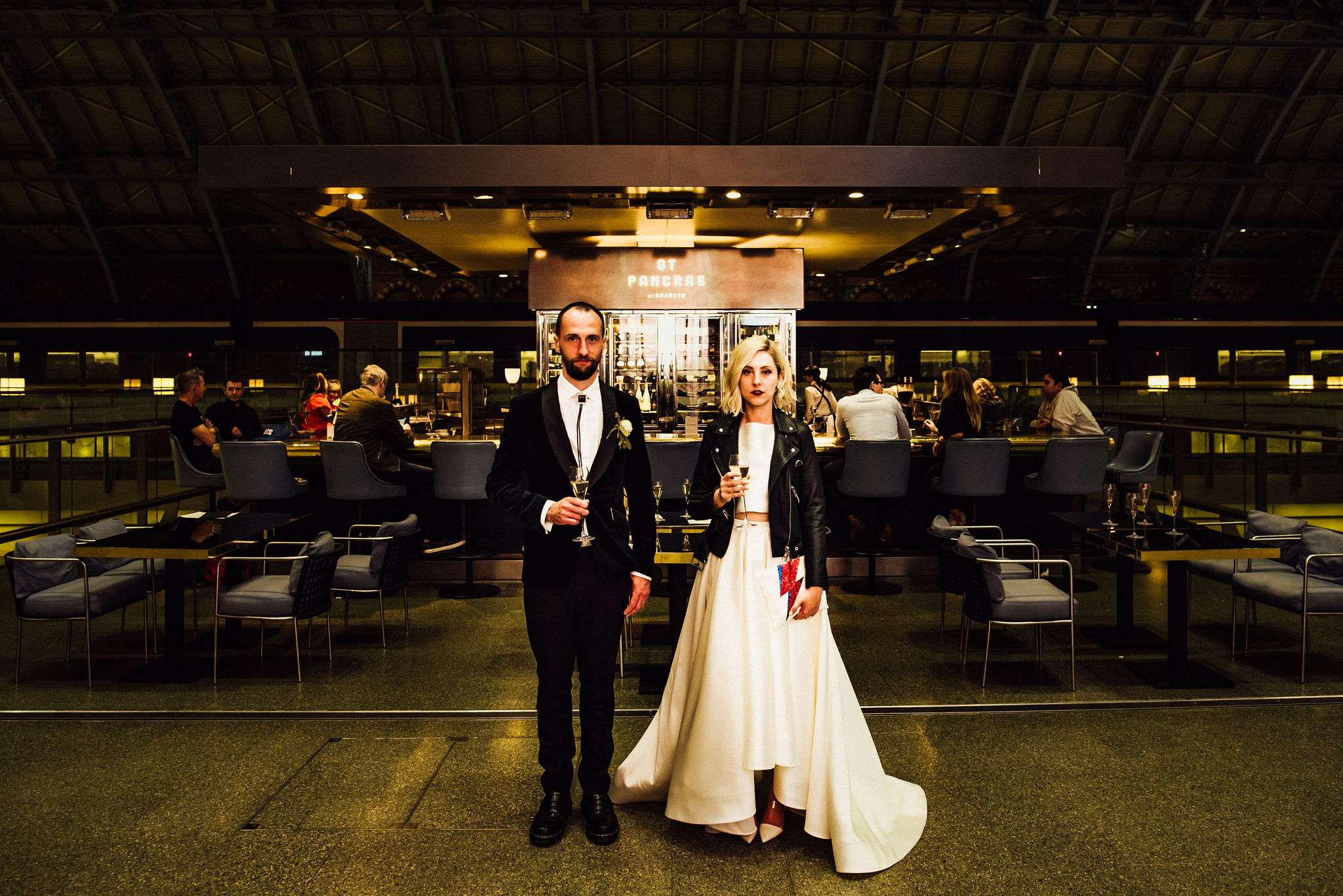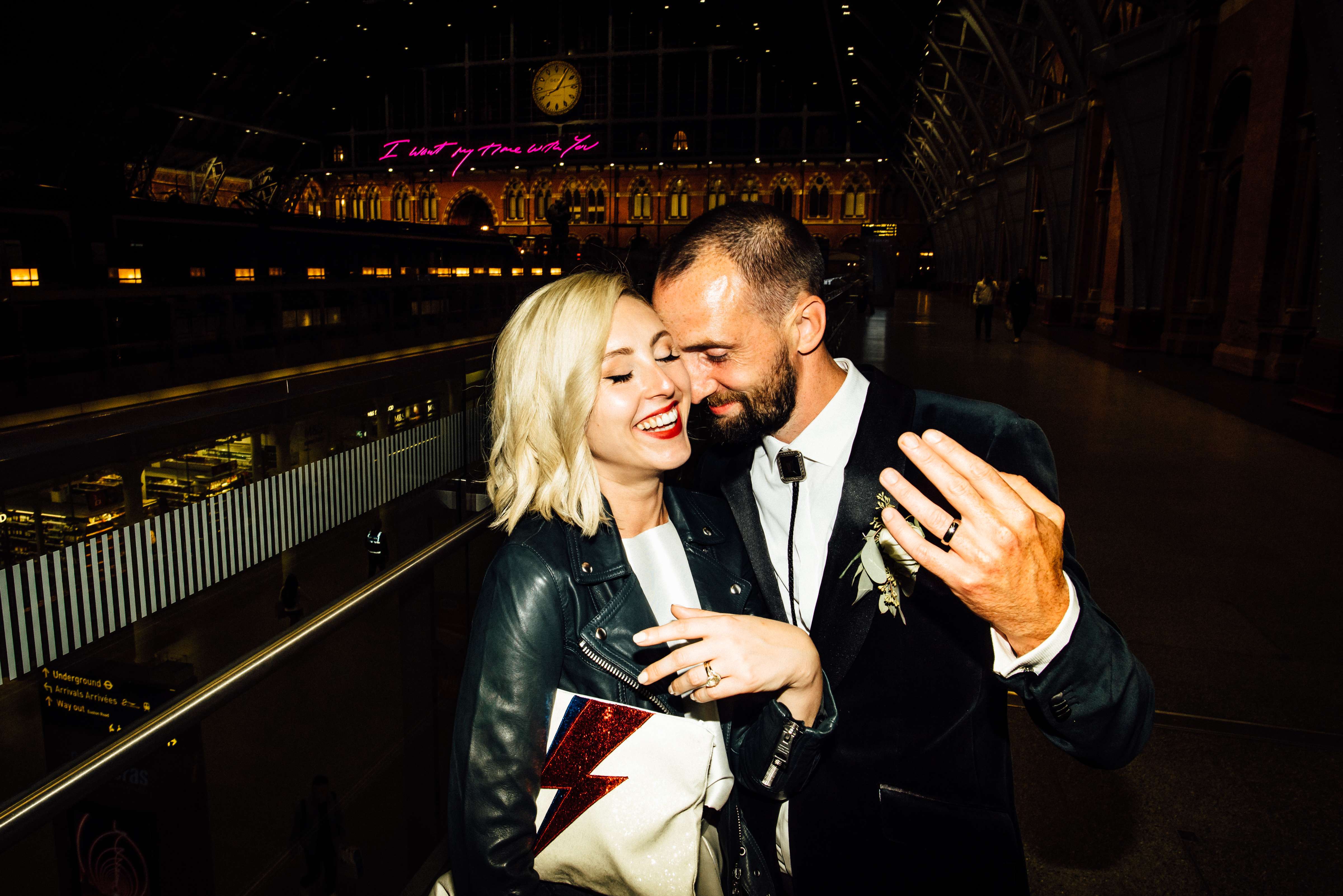 Gemma and Jon chose St Pancras Station as their unusual wedding location and were married at the exact spot where they first met for their first date! They were married on the concourse with the trains behind them, and had their reception at Searcys Champagne Bar. They were inspired by the art deco vibes of the location, but also their love of Bowie through their choice of music and the bride’s accessories (Bowie is also their son’s name!)