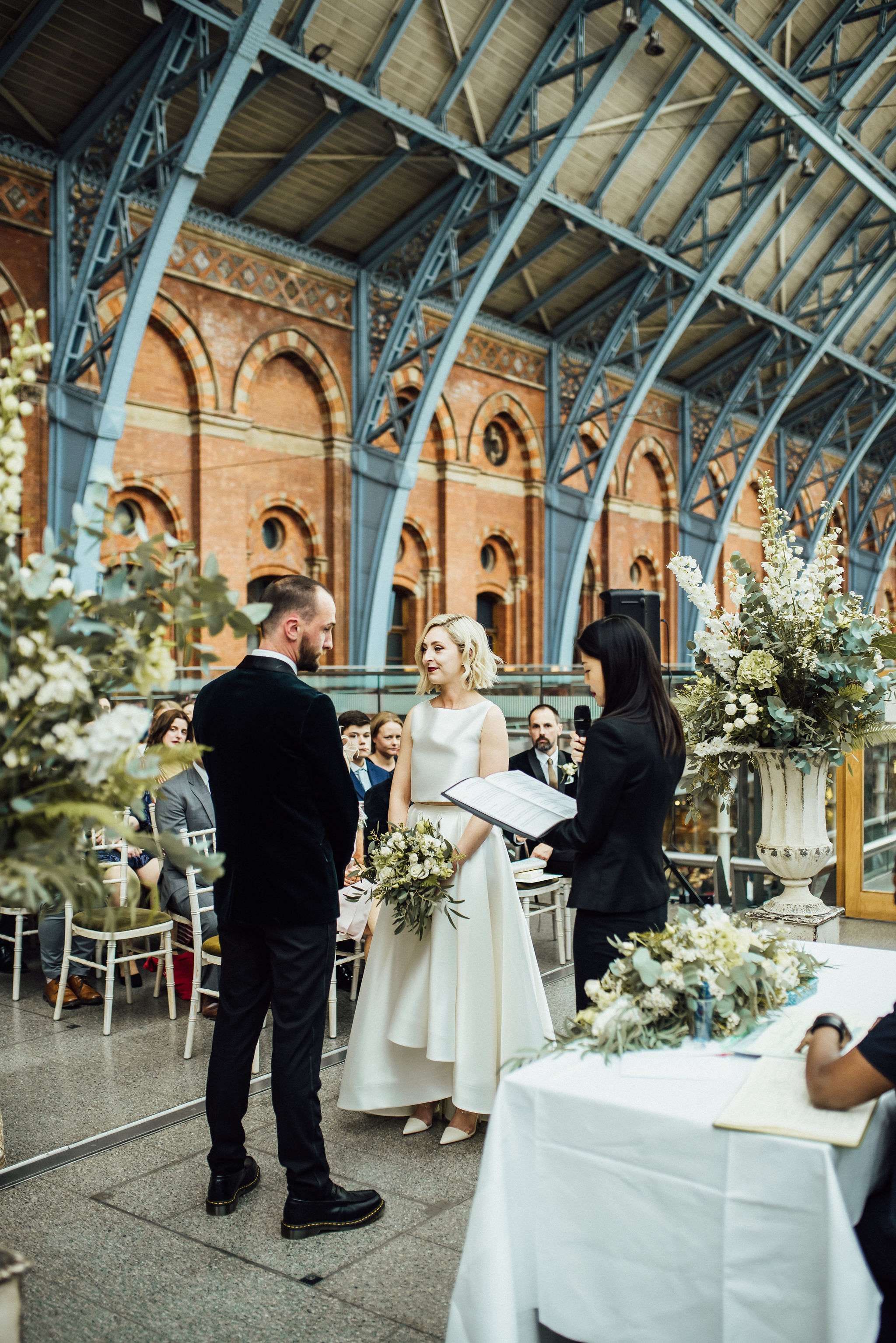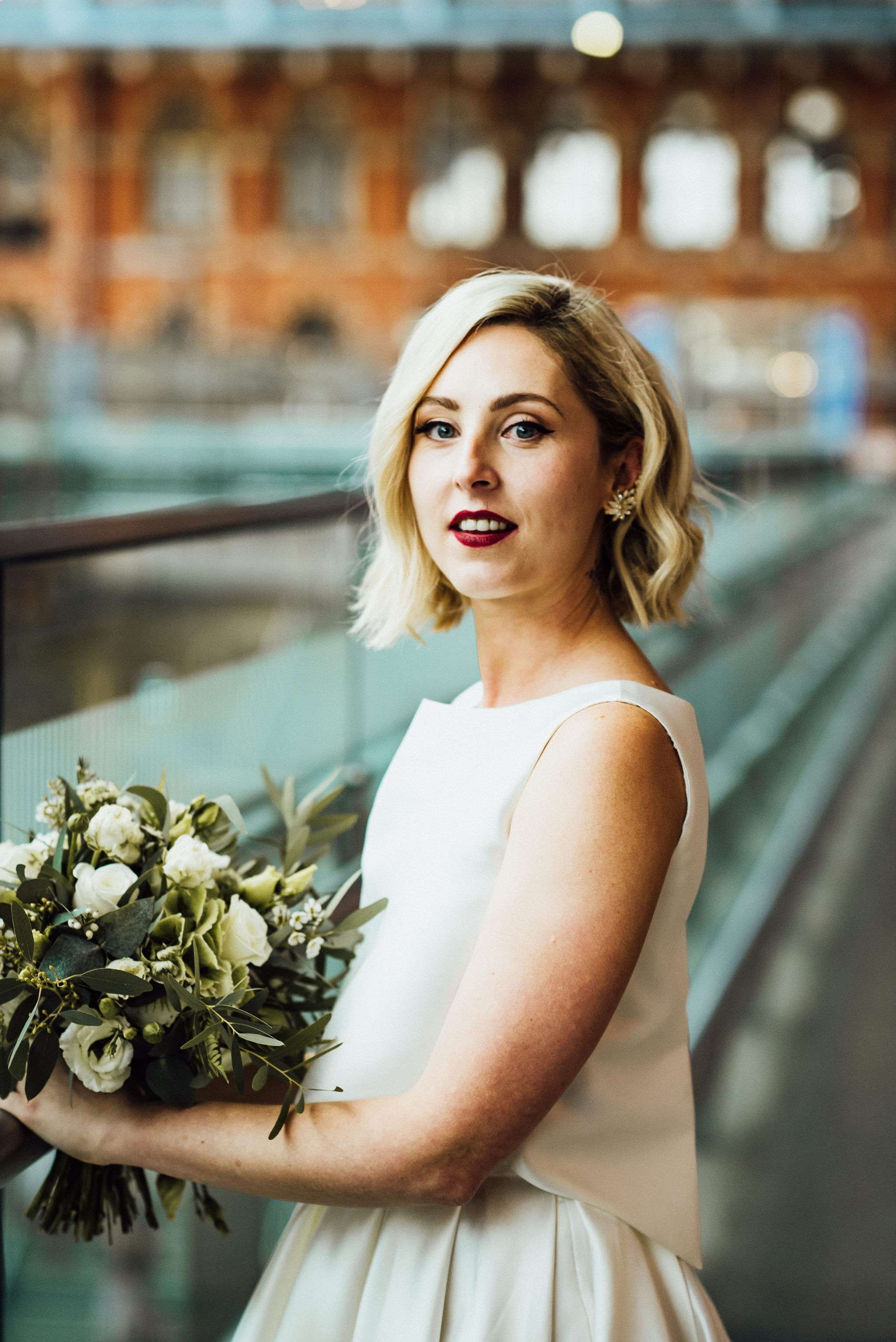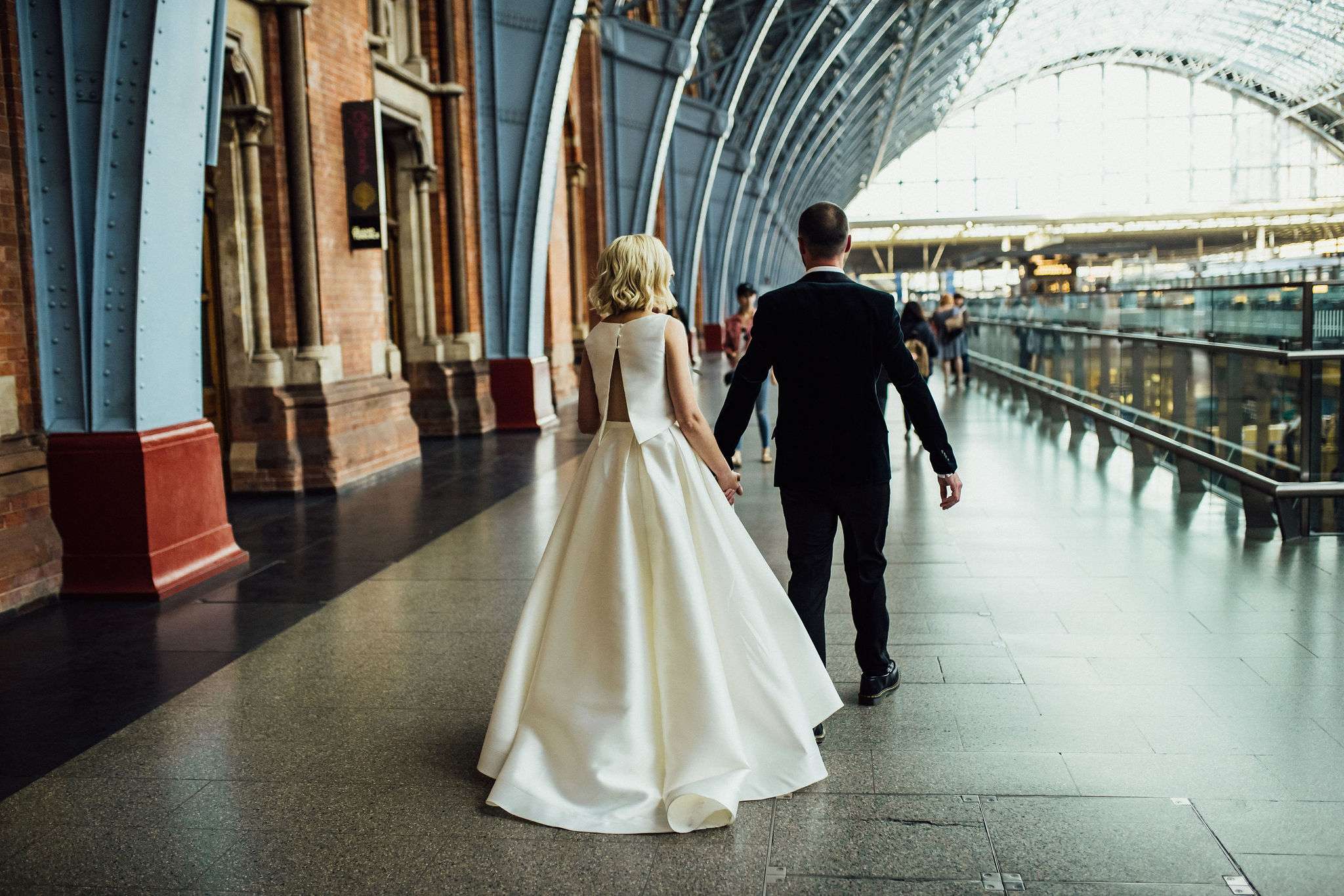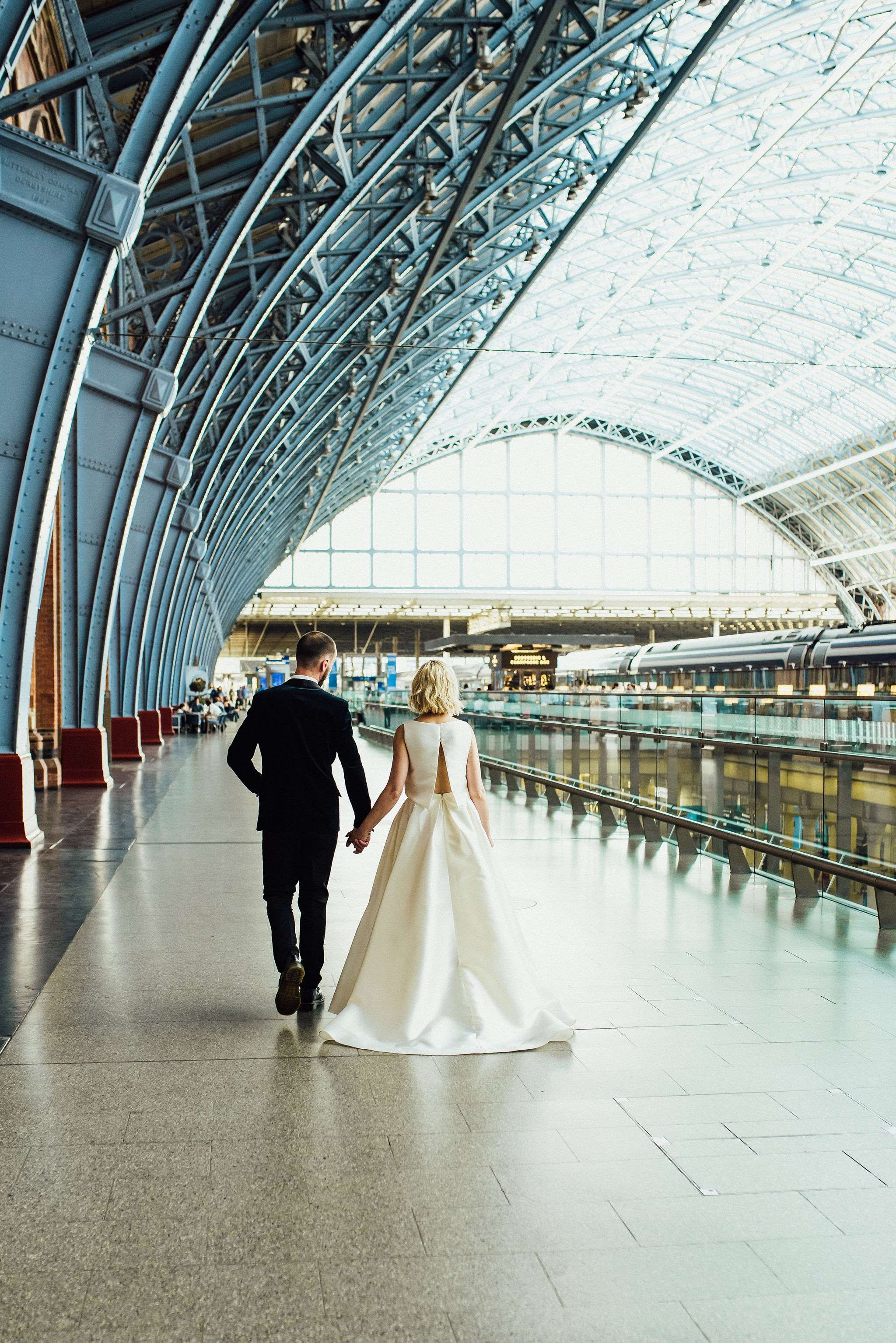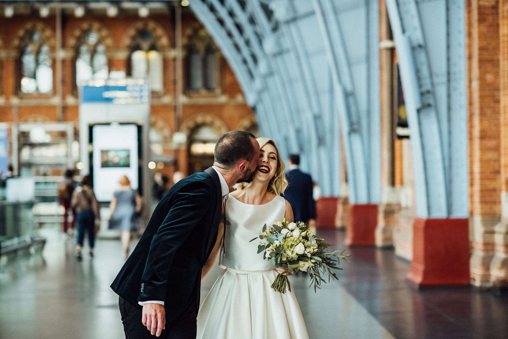Gemma and Jon chose St Pancras Station as their unusual wedding location and were married at the exact spot where they first met for their first date! They were married on the concourse with the trains behind them, and had their reception at Searcys Champagne Bar. They were inspired by the art deco vibes of the location, but also their love of Bowie through their choice of music and the bride’s accessories (Bowie is also their son’s name!)