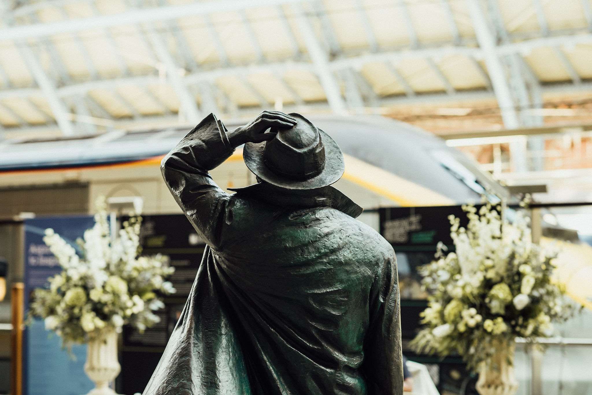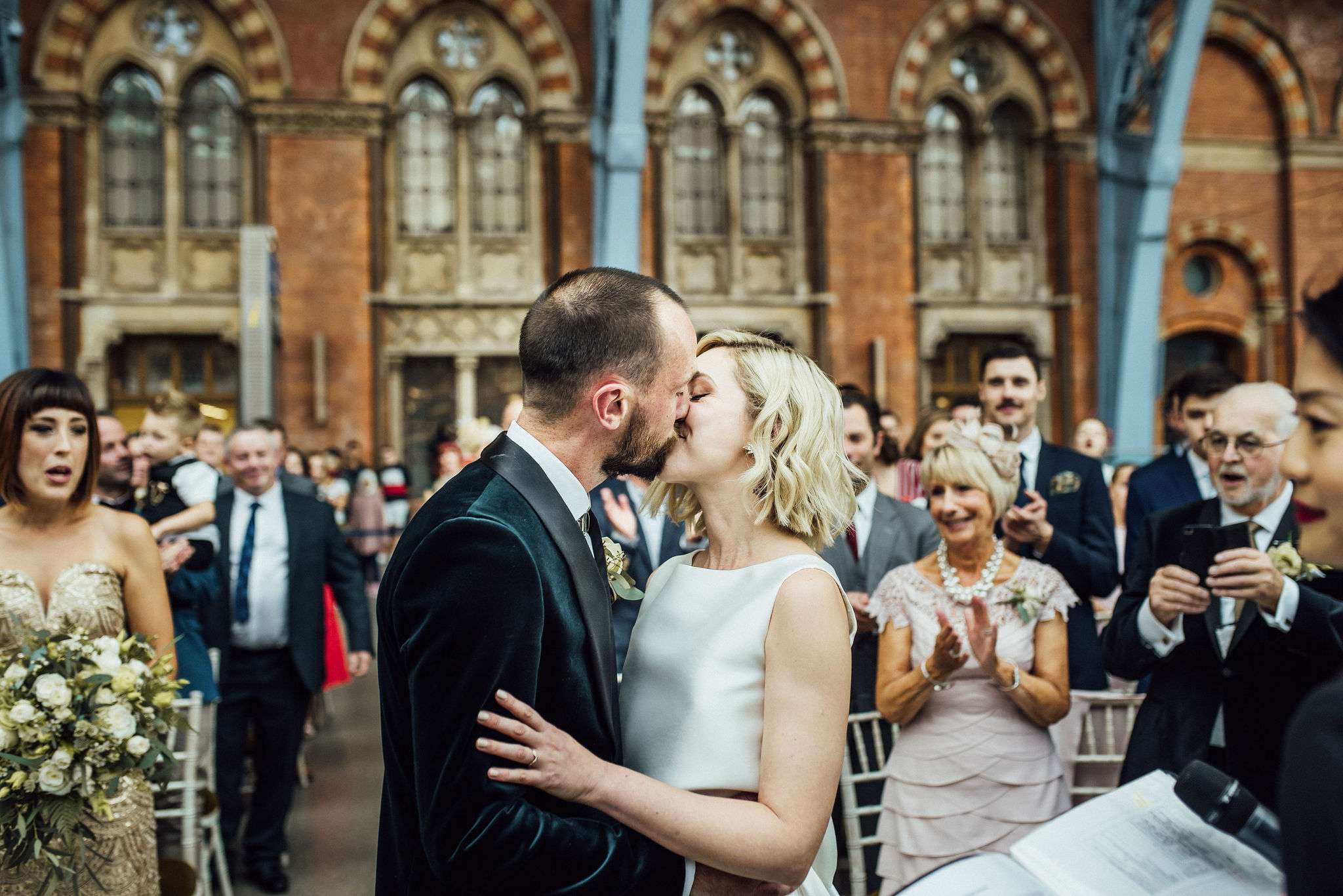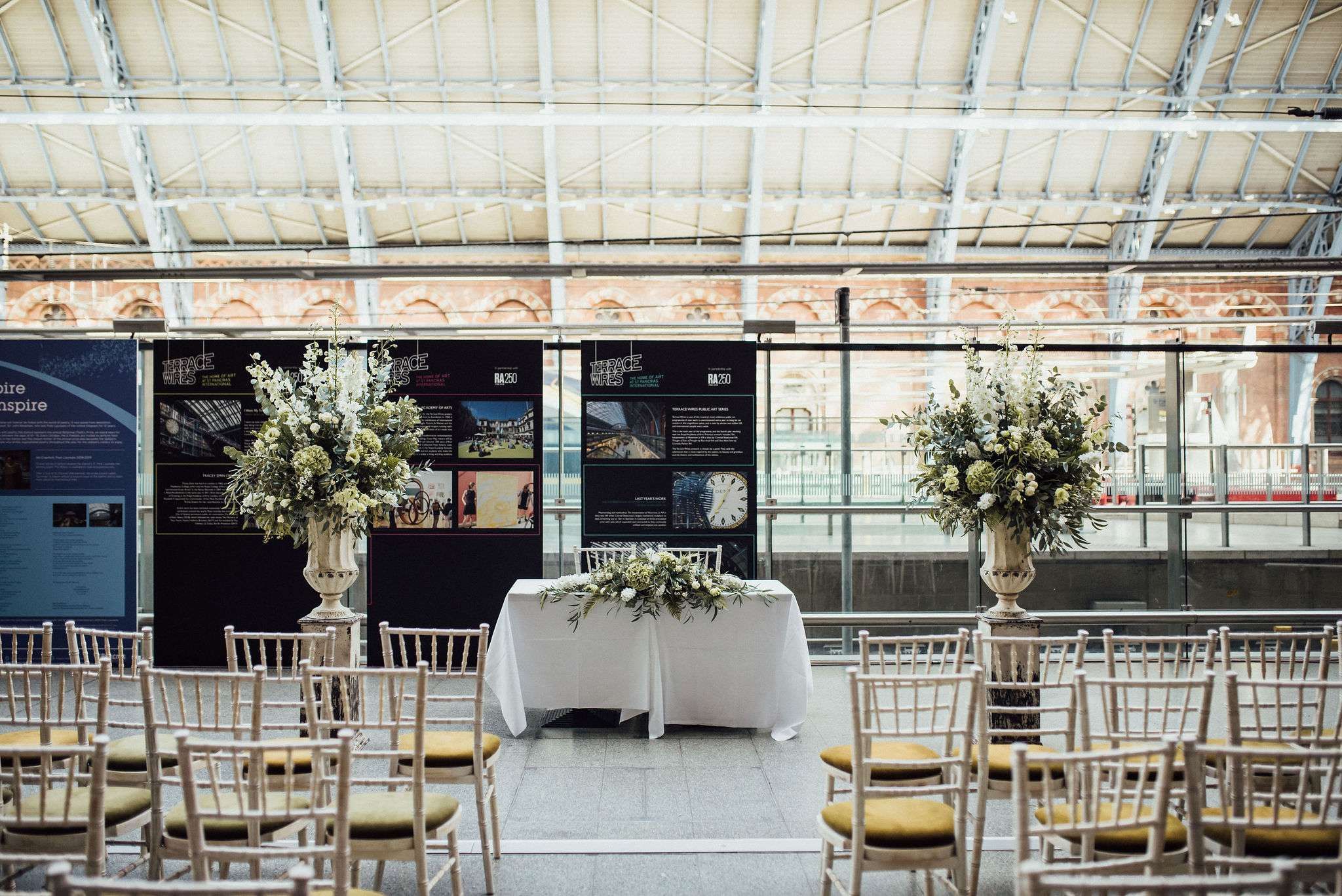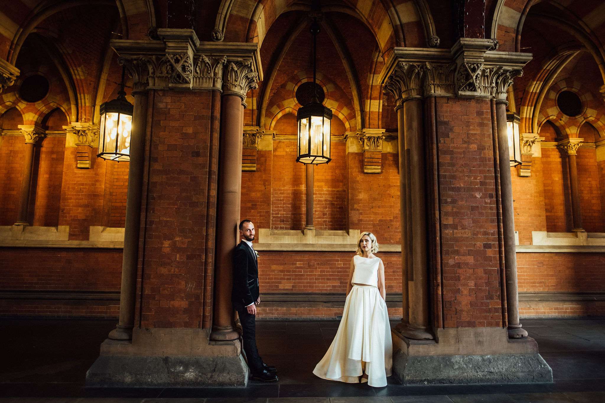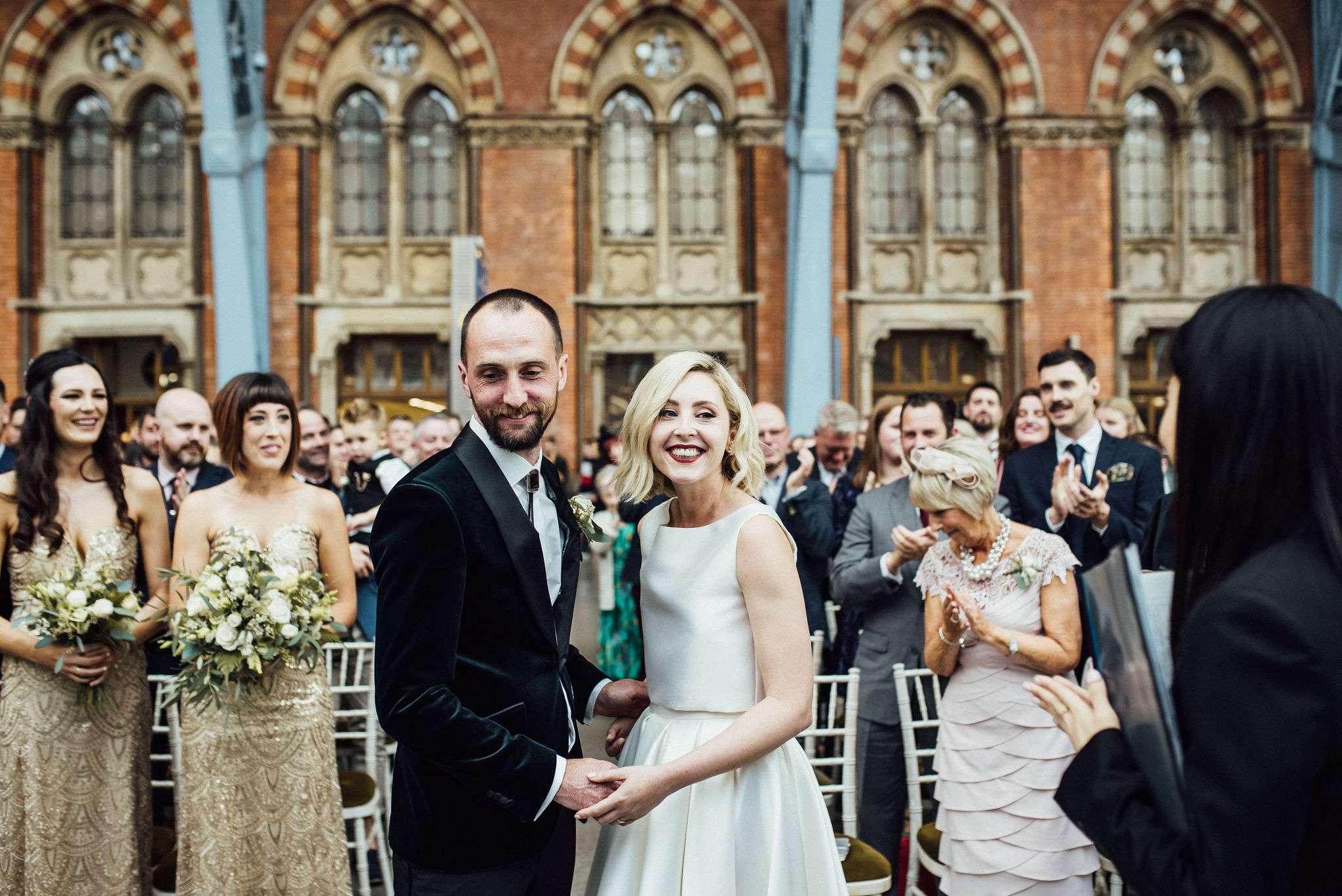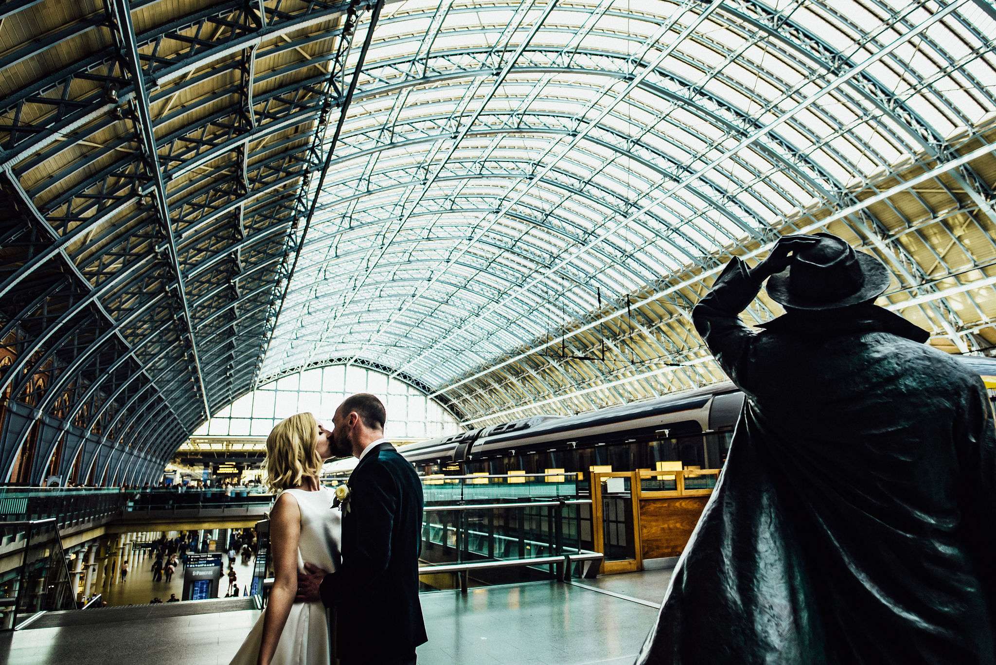 Gemma and Jon chose St Pancras Station as their unusual wedding location and were married at the exact spot where they first met for their first date! They were married on the concourse with the trains behind them, and had their reception at Searcys Champagne Bar. They were inspired by the art deco vibes of the location, but also their love of Bowie through their choice of music and the bride’s accessories (Bowie is also their son’s name!)