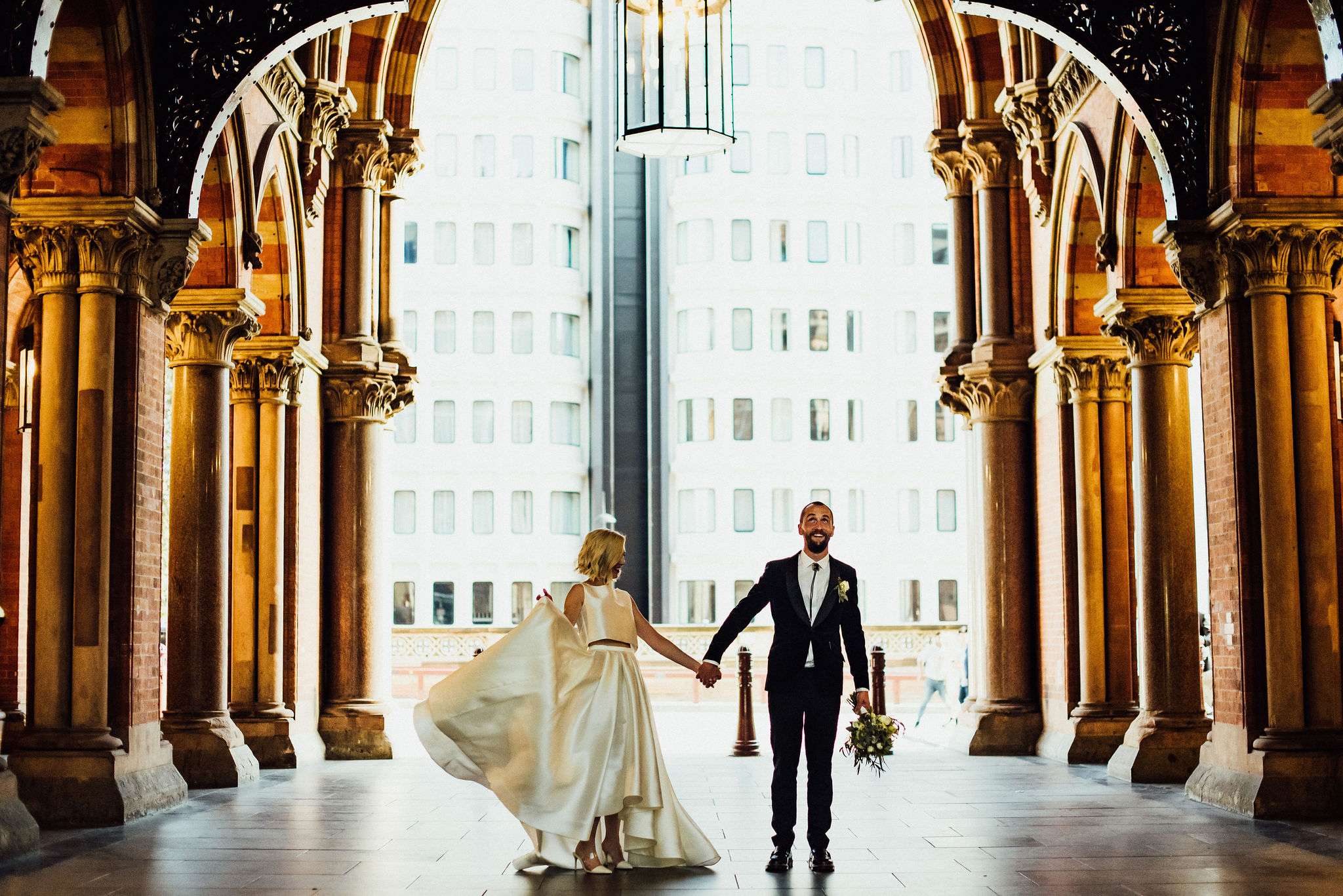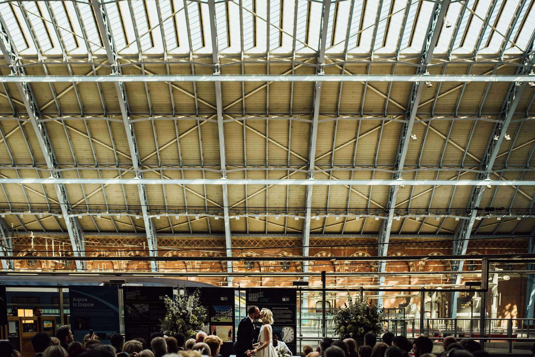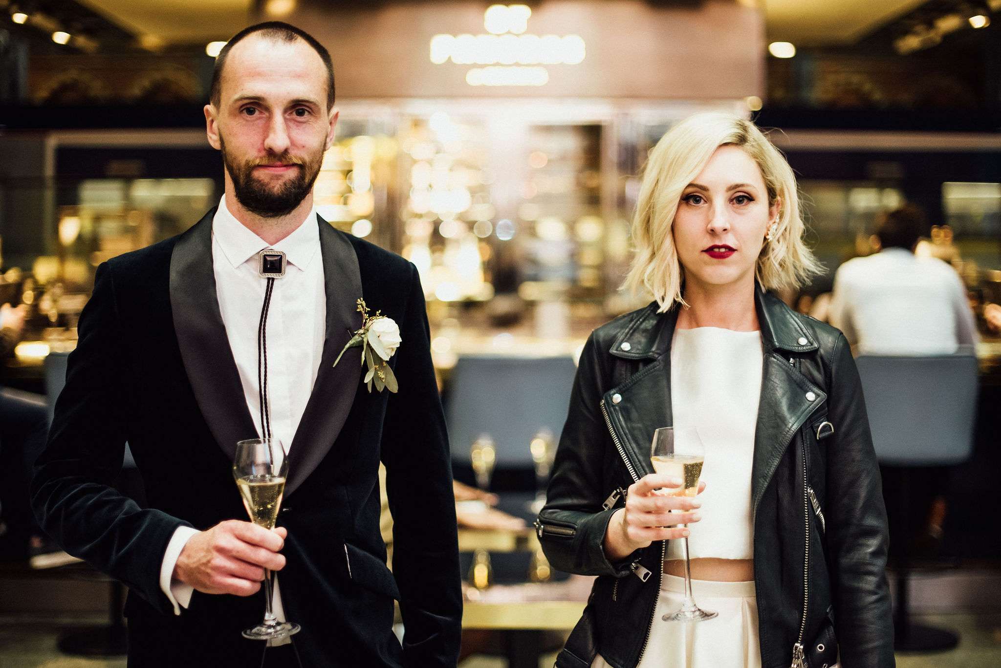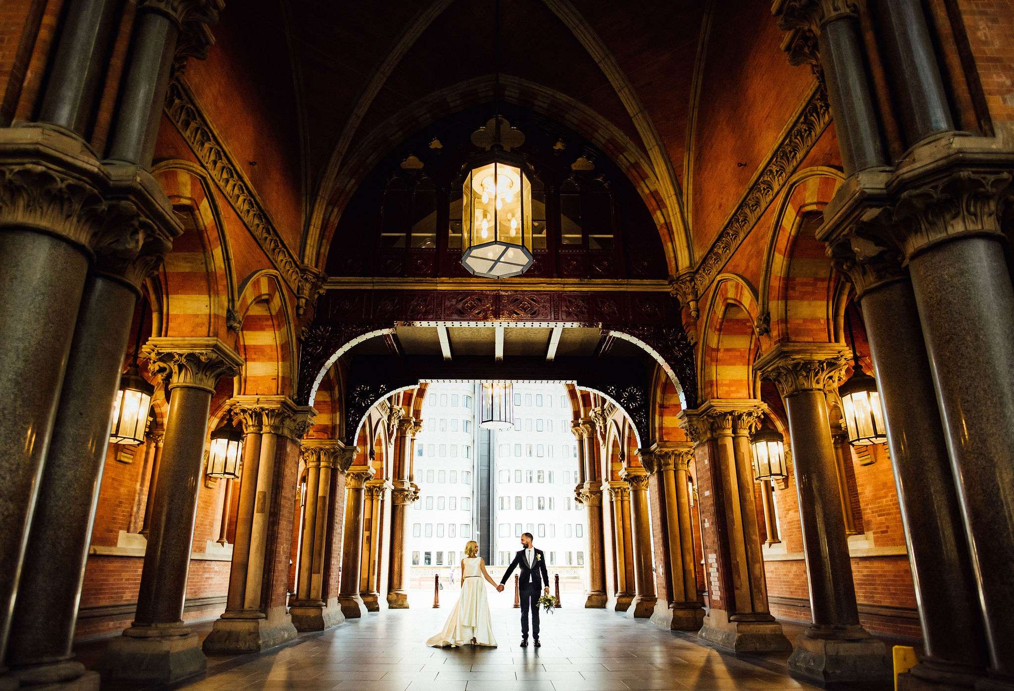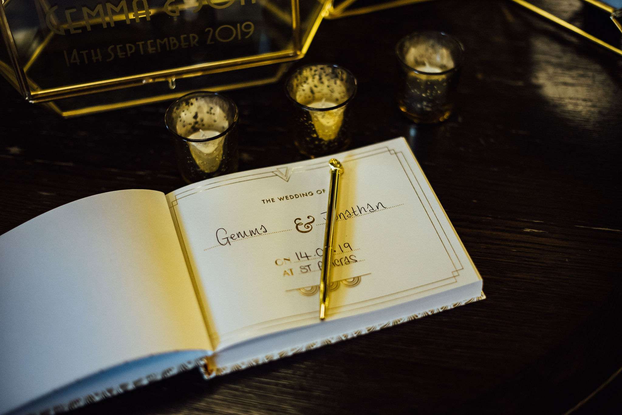 Gemma and Jon chose St Pancras Station as their unusual wedding location and were married at the exact spot where they first met for their first date! They were married on the concourse with the trains behind them, and had their reception at Searcys Champagne Bar. They were inspired by the art deco vibes of the location, but also their love of Bowie through their choice of music and the bride’s accessories (Bowie is also their son’s name!)