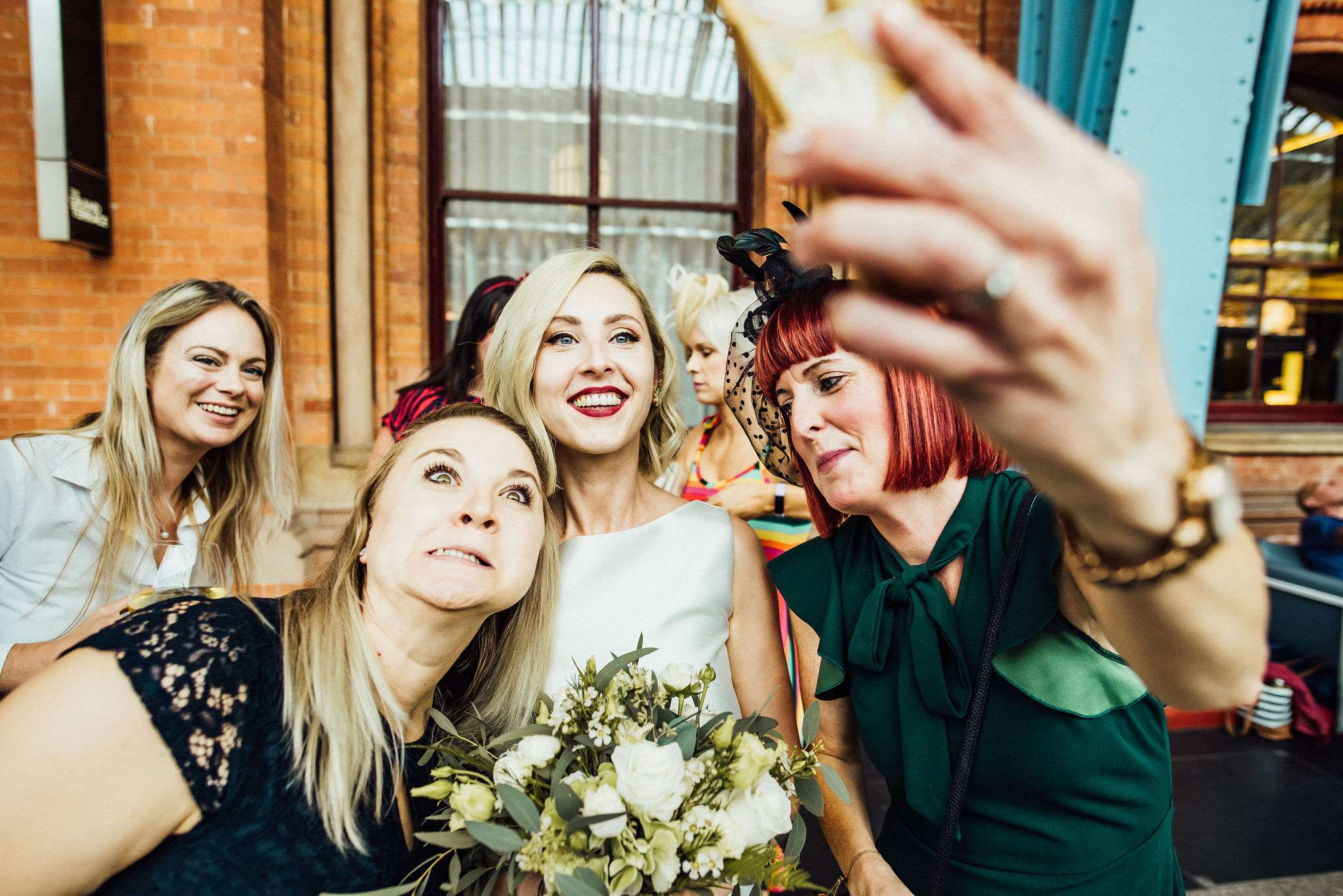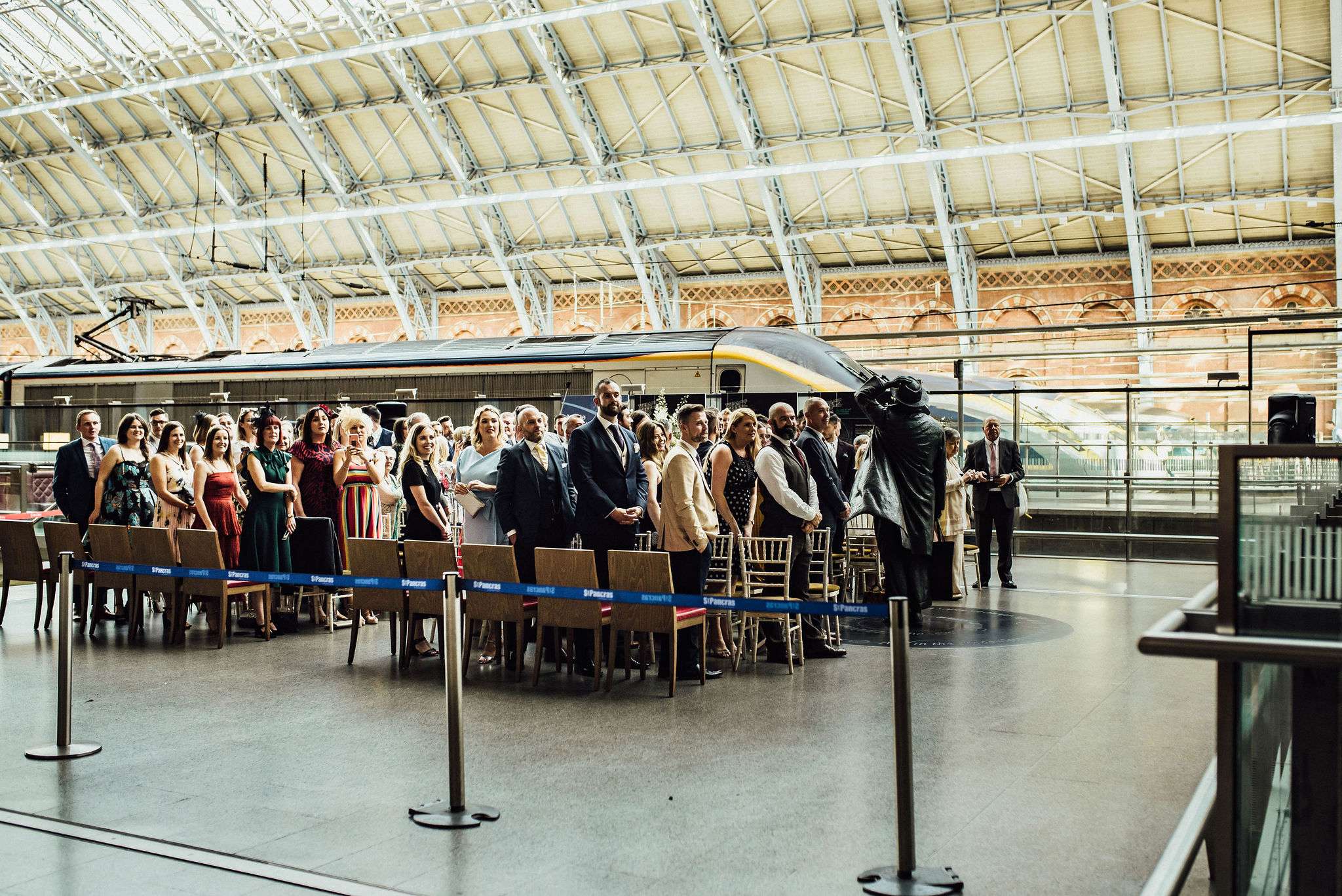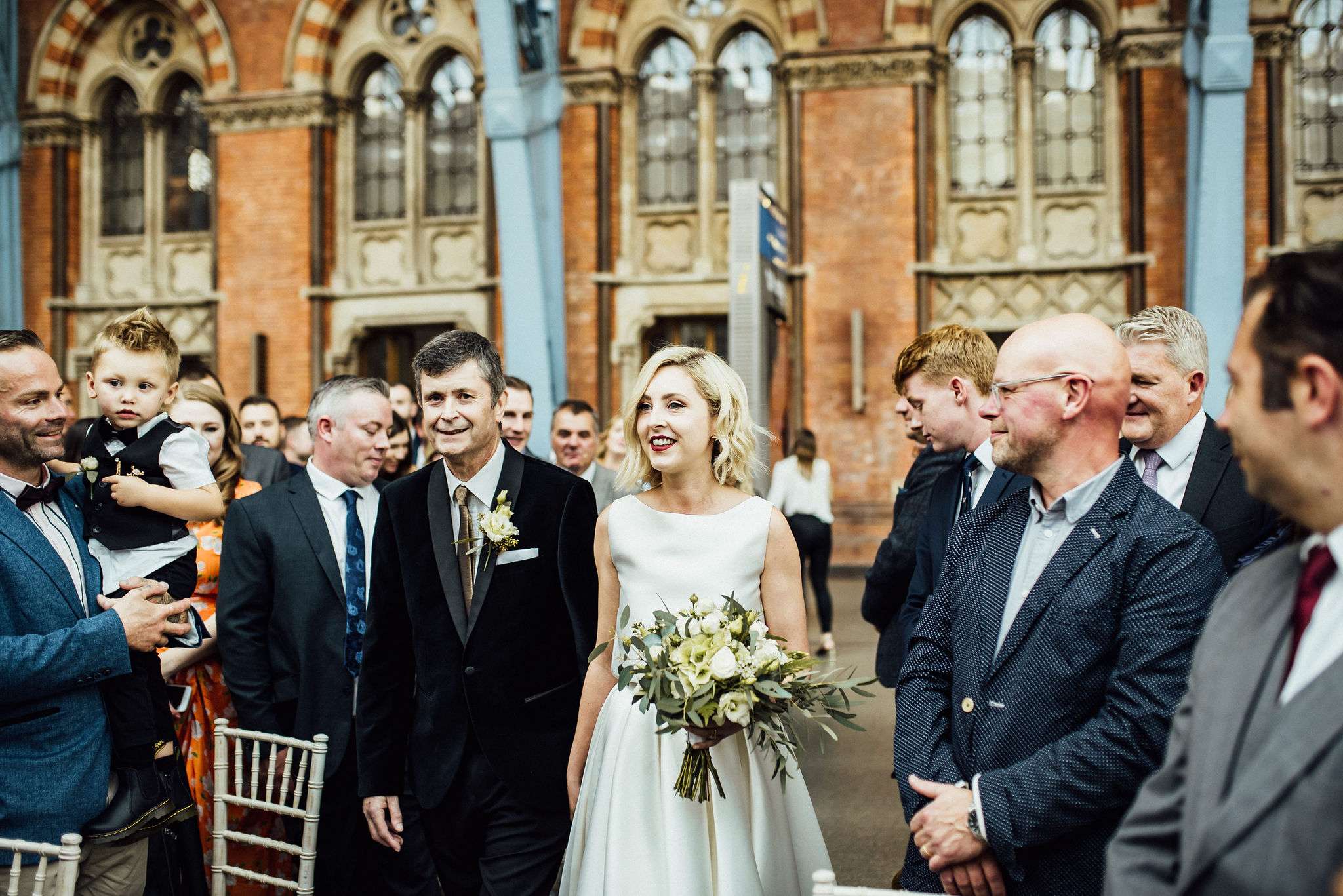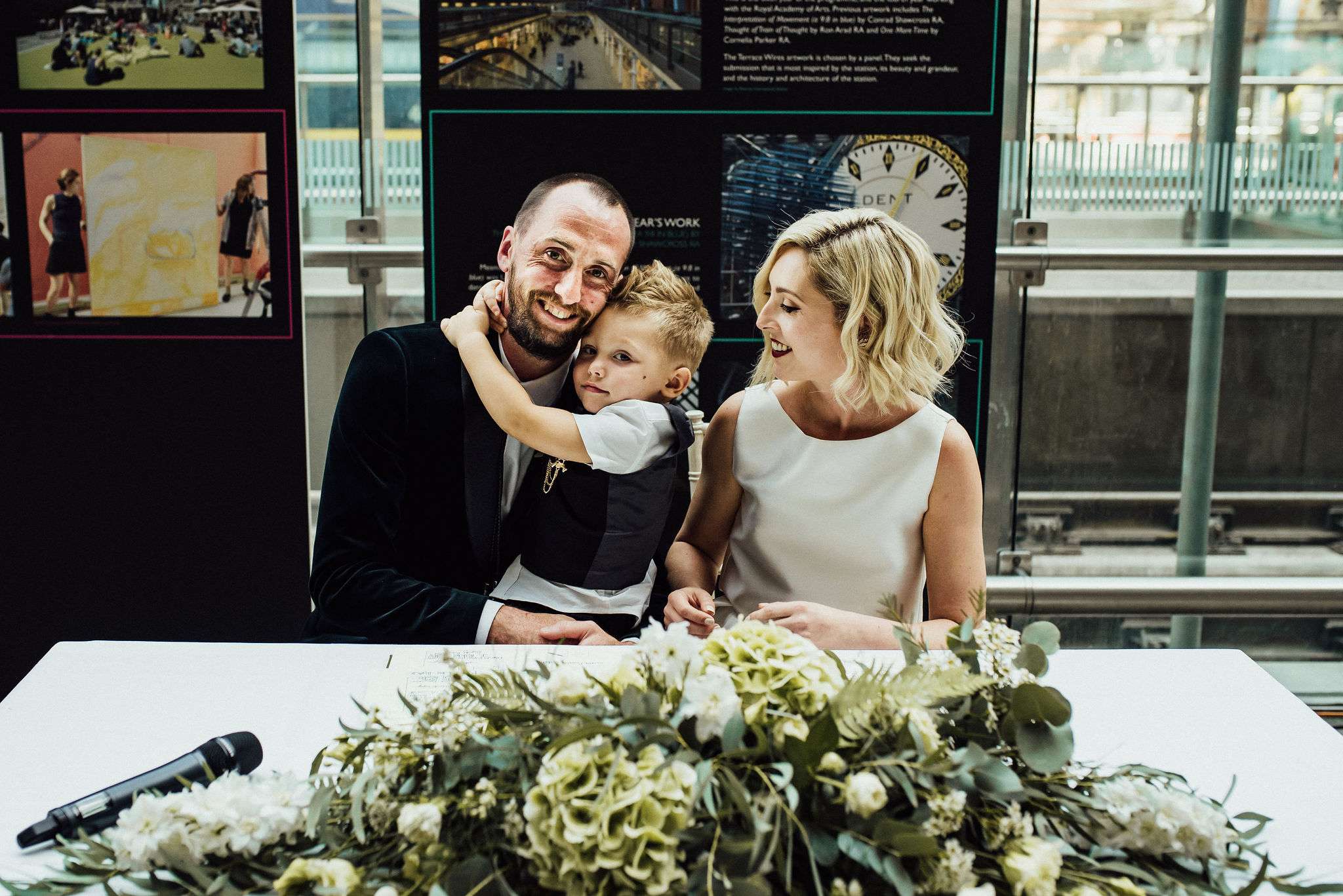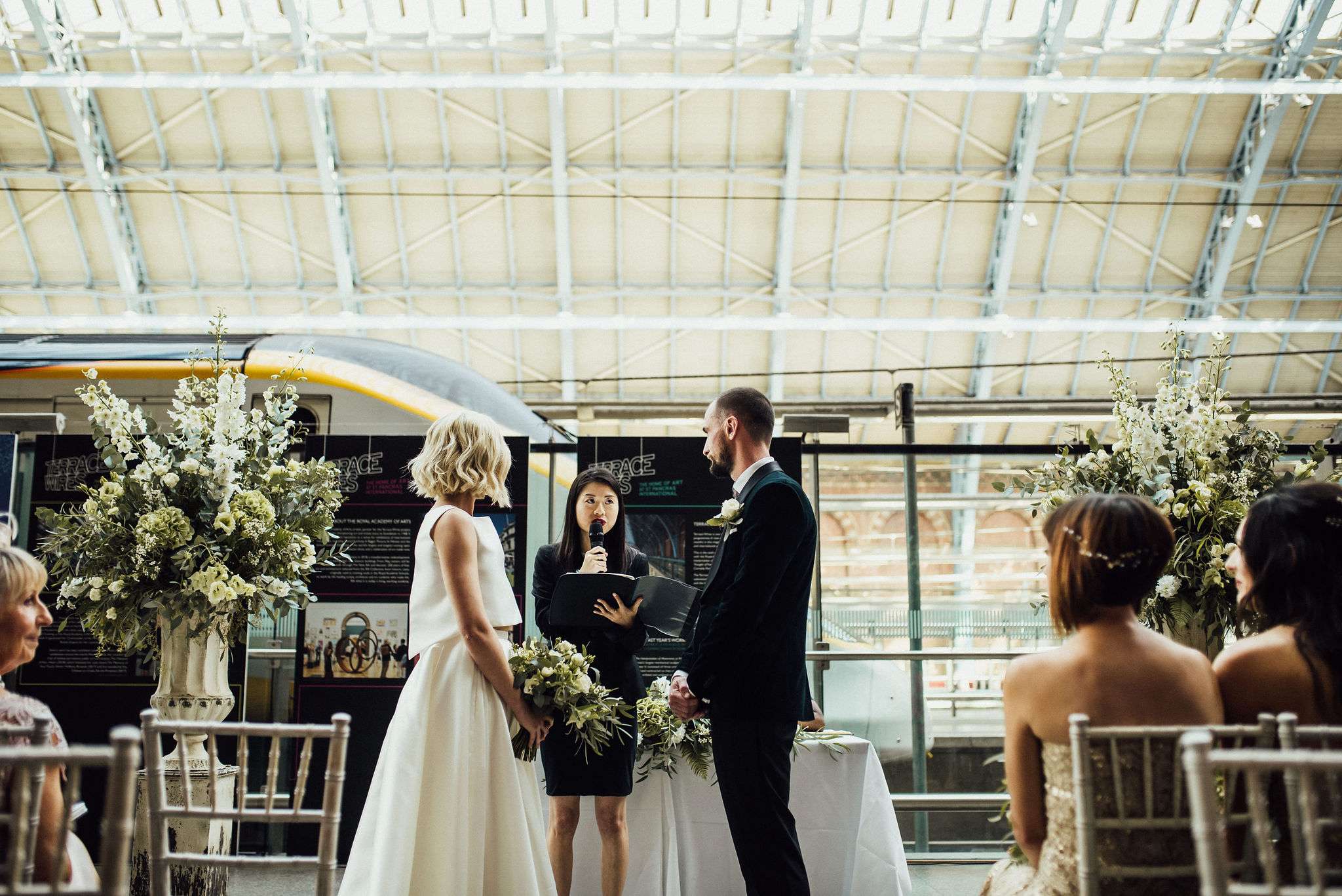 Their ceremony was short and sweet and there was a nice ice breaker midway through when an announcement over the tannoy reminded people not to leave their belongings unattended! It got big laugh and made them instantly feel more relaxed. “I walked down the aisle to one of my favourite songs, a piano version of New Order’s Ceremony“, Gemma said. “The ceremony was short and sweet and we shortened our vows as neither of us are great at public speaking. It was basically perfect and as we walked back up the aisle, the train behind us departed too.”