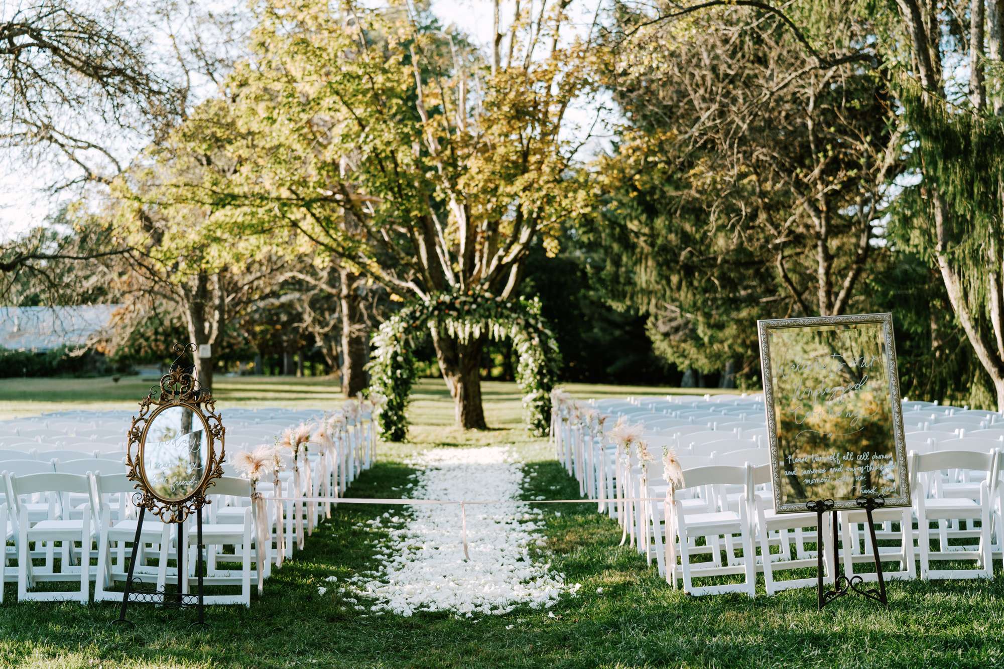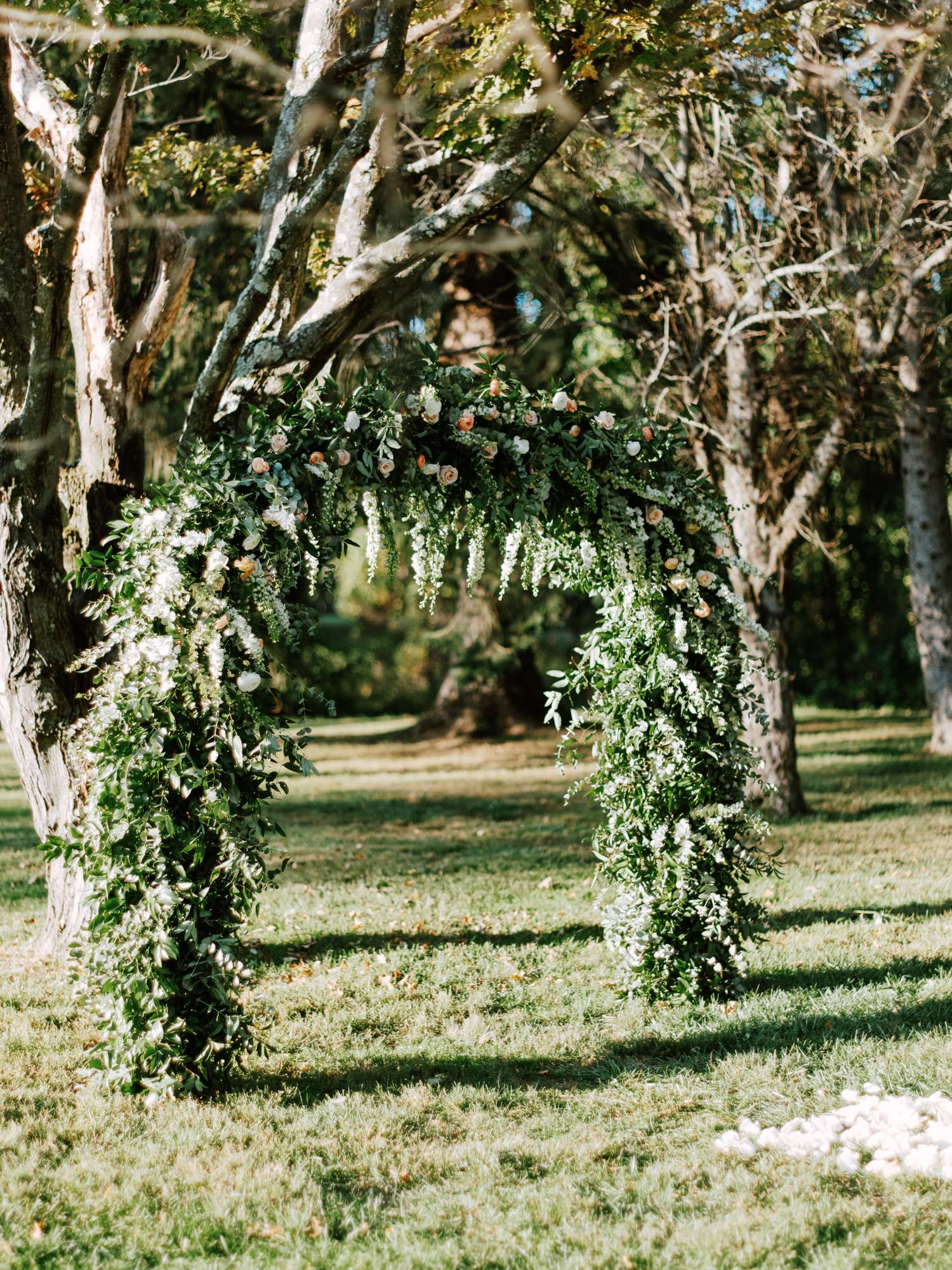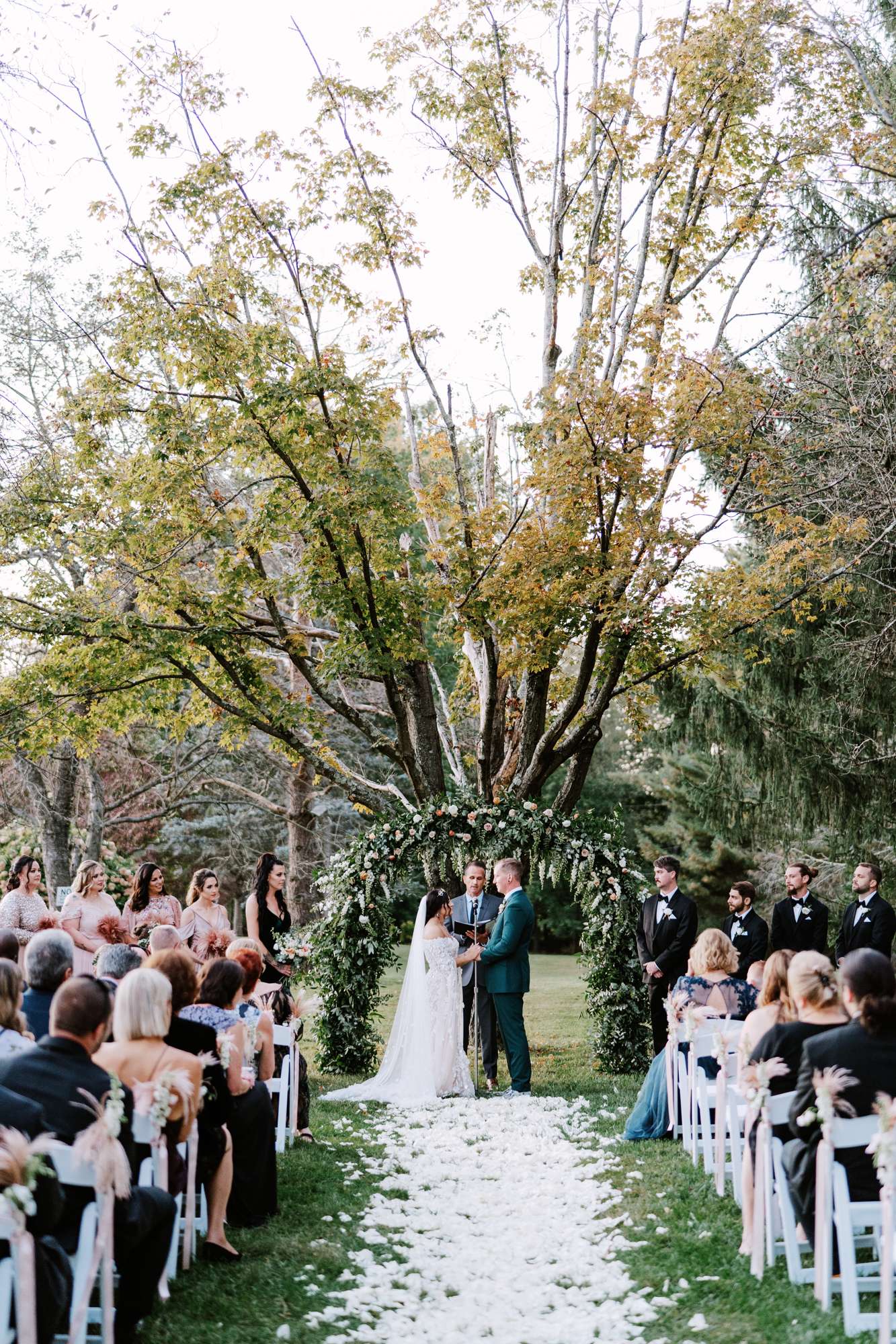 Their favourite part of the day was their outdoor ceremony. Their florist, Desiree Dean Designs, made them a beautiful arch to get married under and the aisle was strewn with white rose petals. Flowers were one of their biggest expenses but they wanted both the ceremony and reception spaces to feel very lush and green.