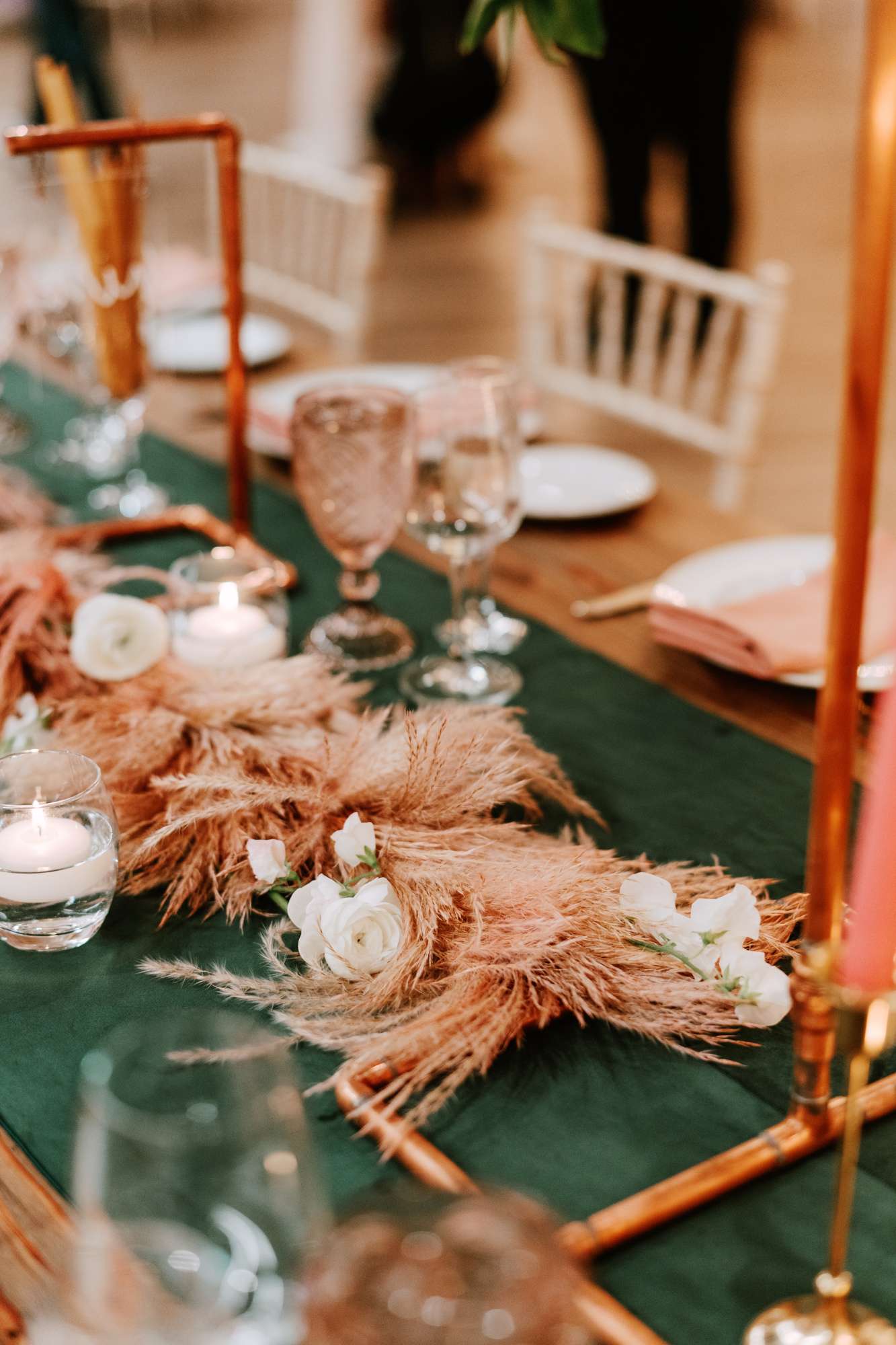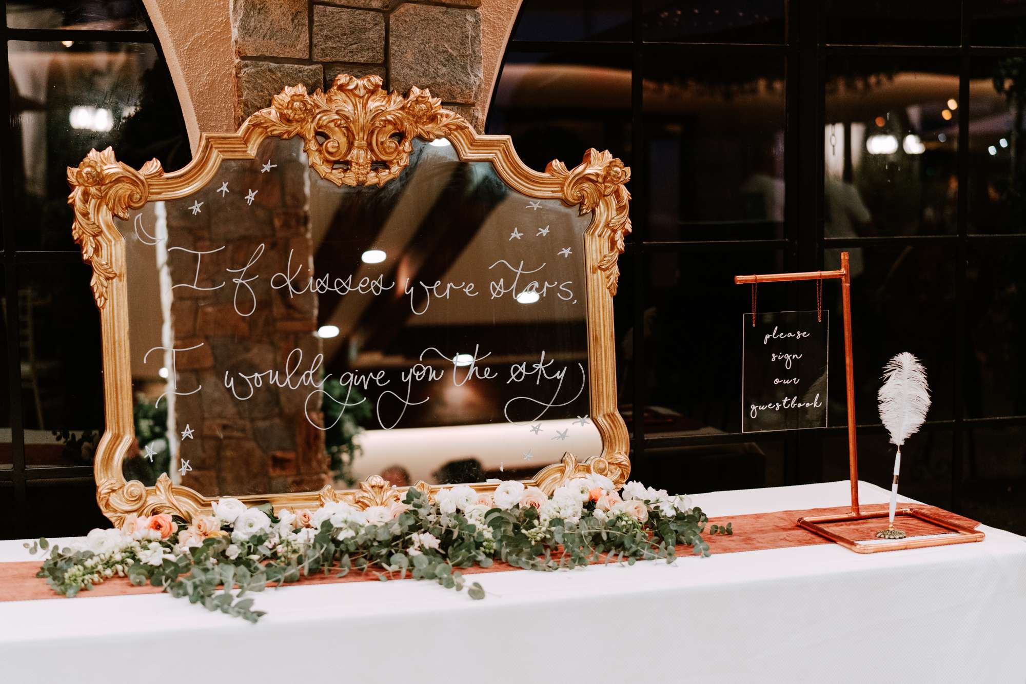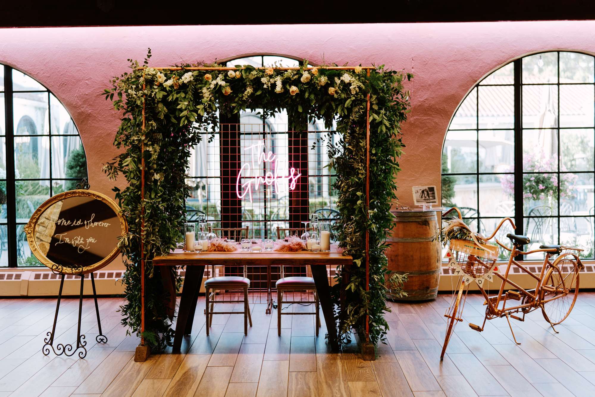 At the reception space they included yet more stunning florals, opting for high centrepieces and a sweetheart table for the two of them, surrounded by another floral arch. They also included copper elements with the copper piping table names (made by the groom) and the copper framed mirrors.