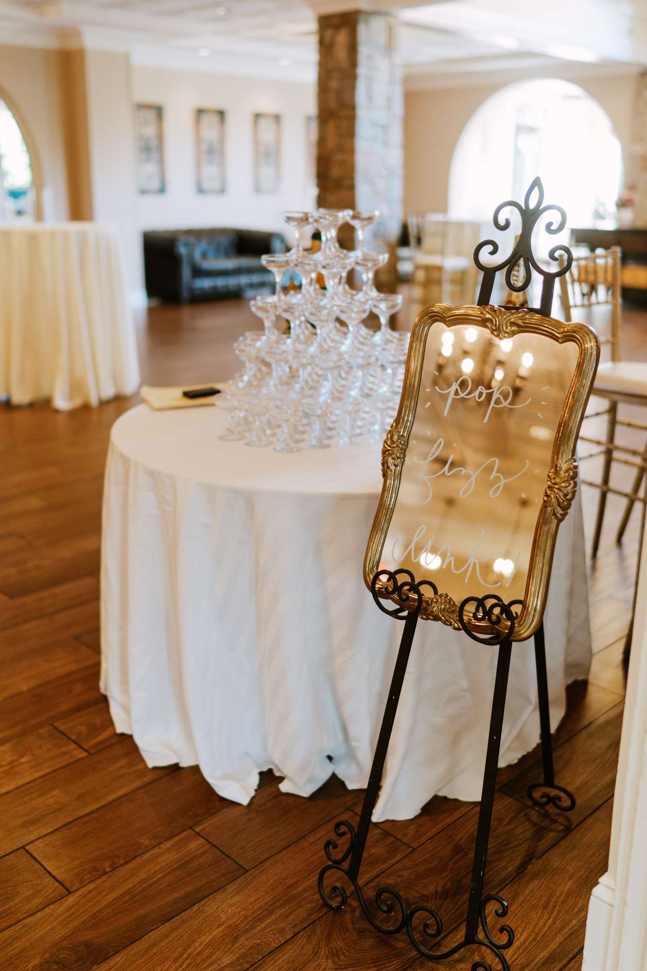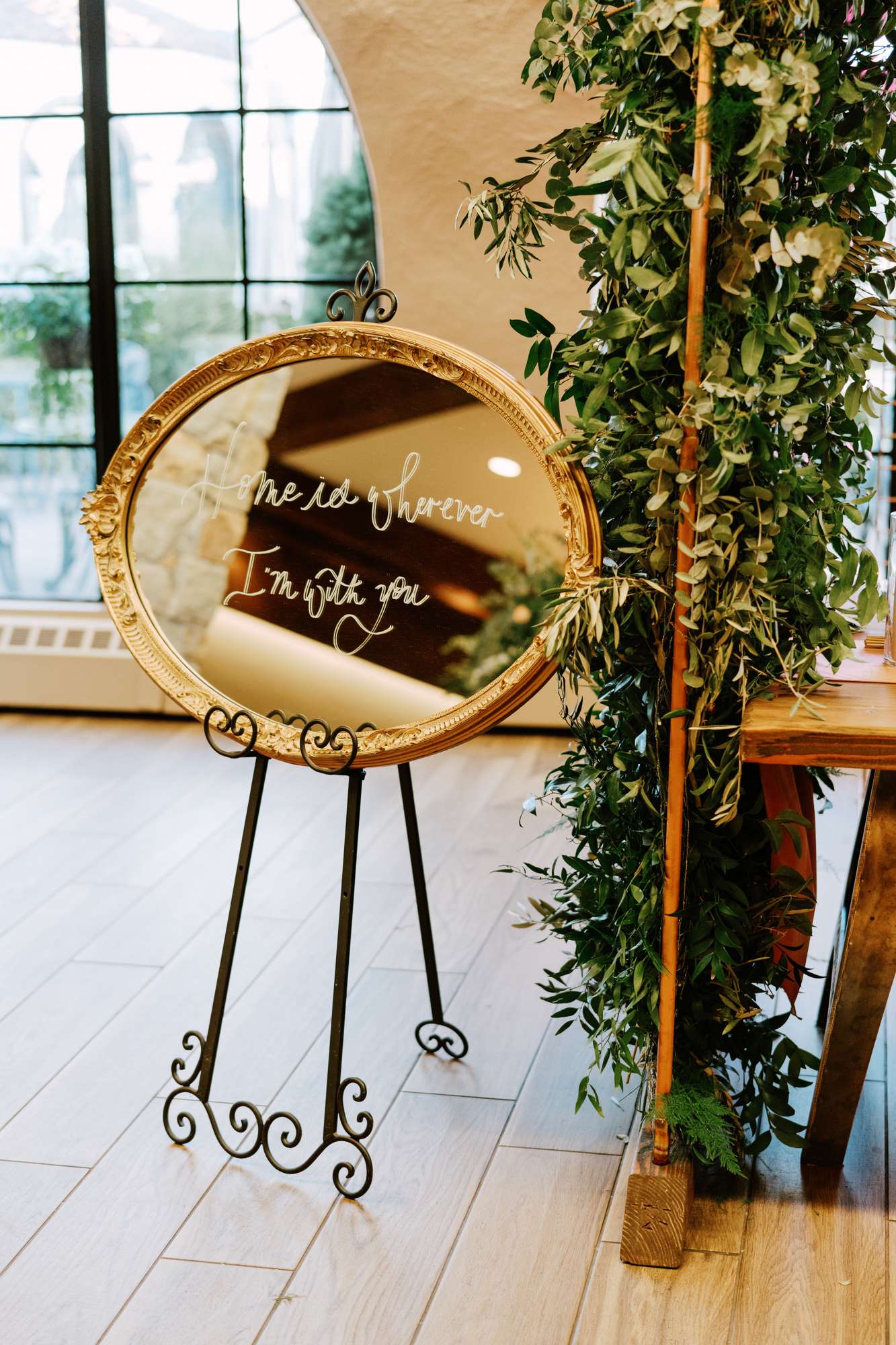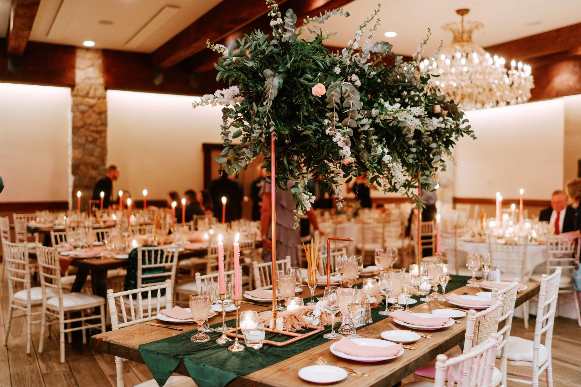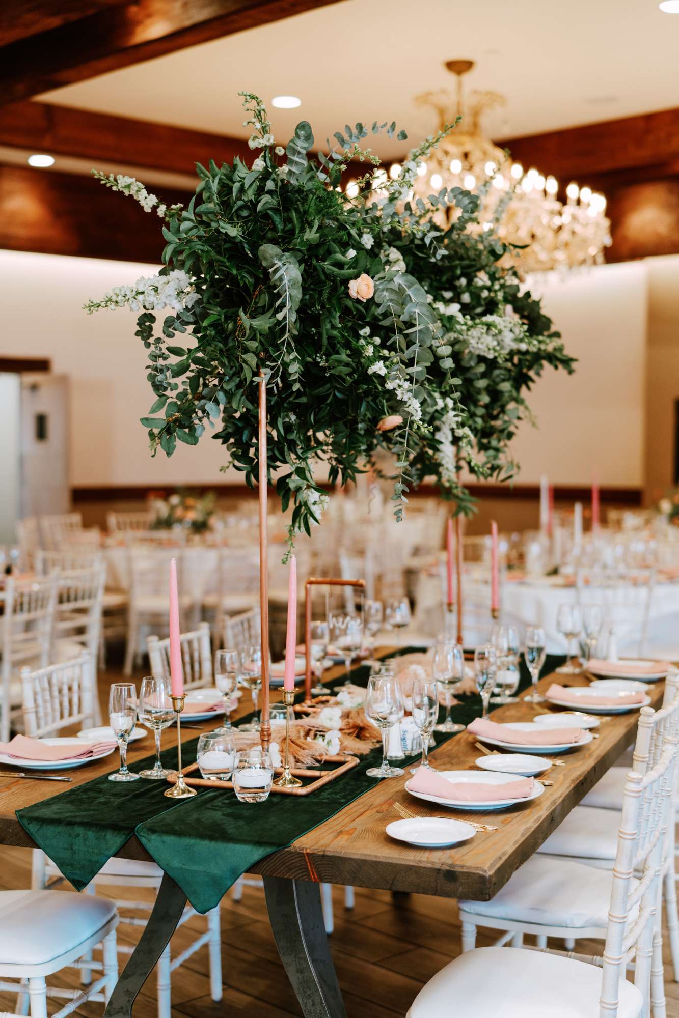At the reception space they included yet more stunning florals, opting for high centrepieces and a sweetheart table for the two of them, surrounded by another floral arch. They also included copper elements with the copper piping table names (made by the groom) and the copper framed mirrors.