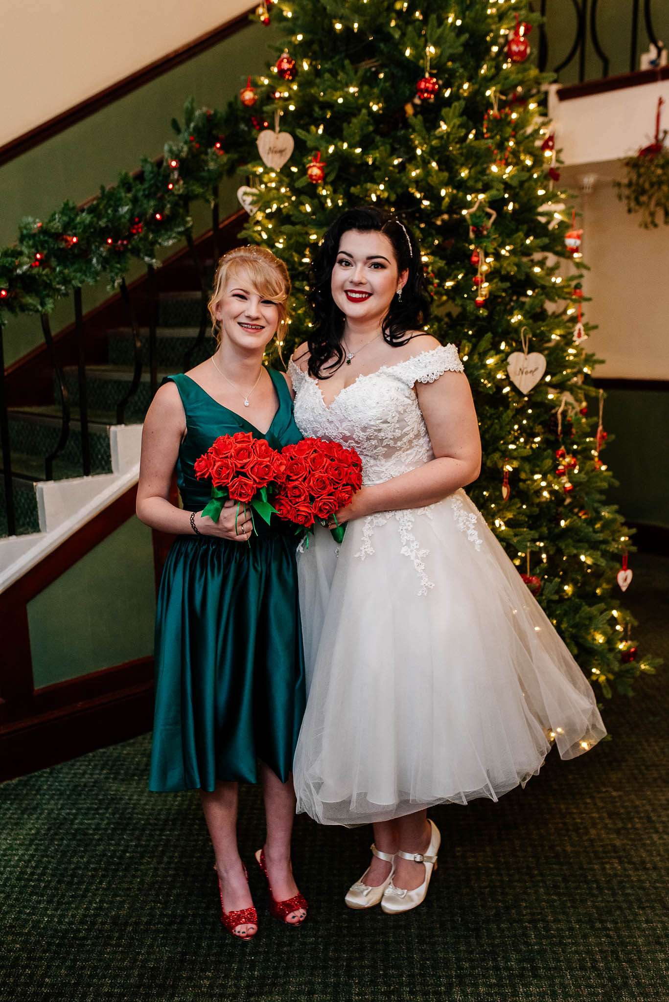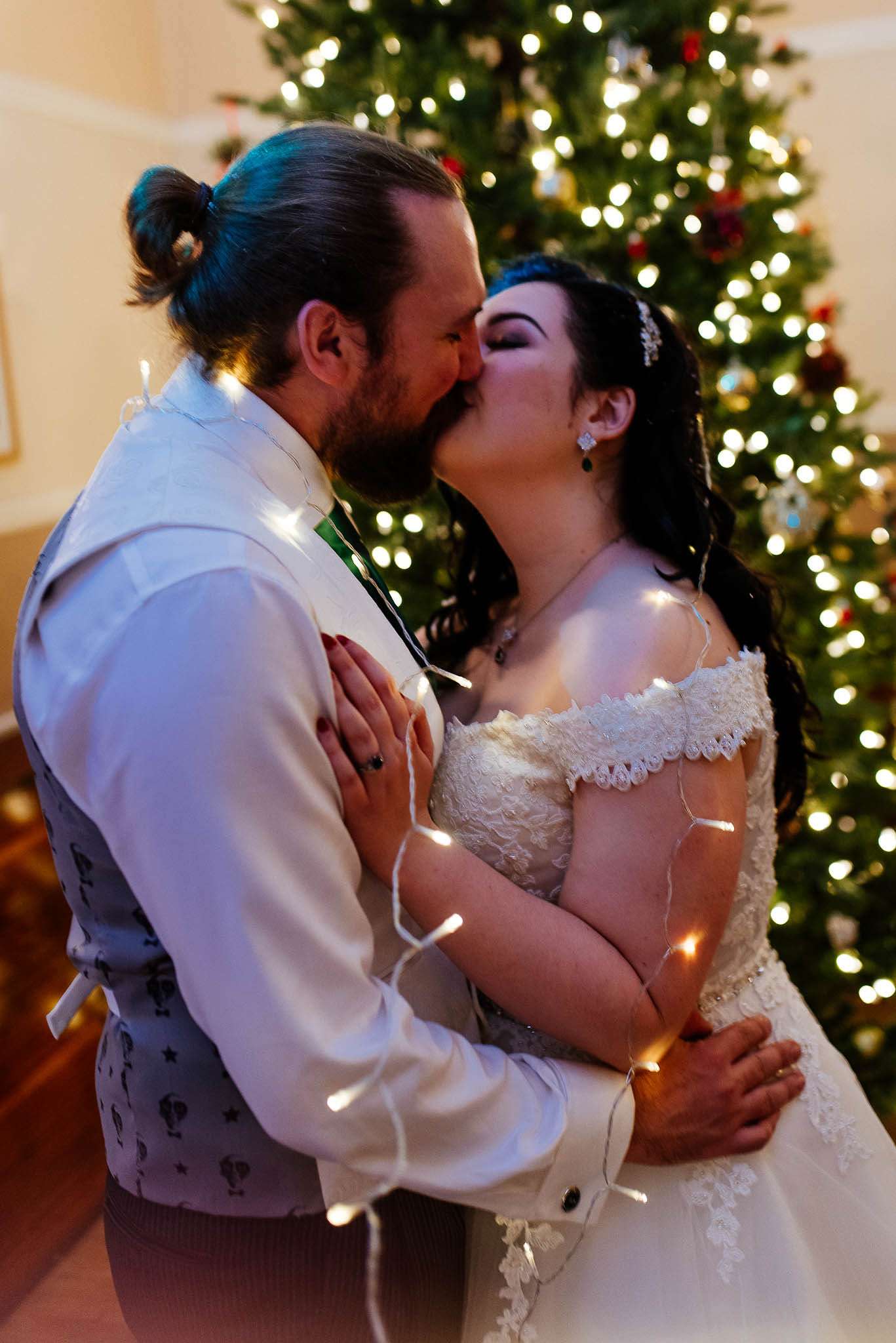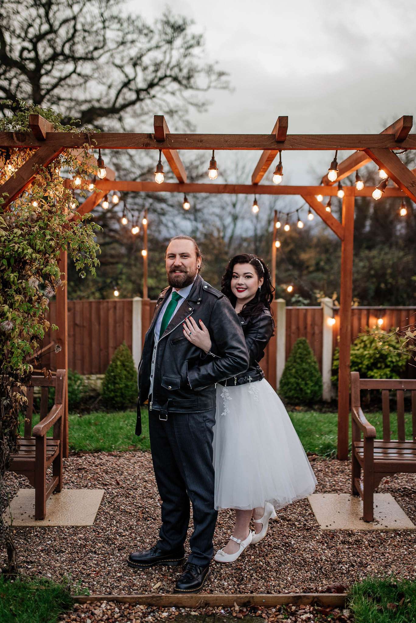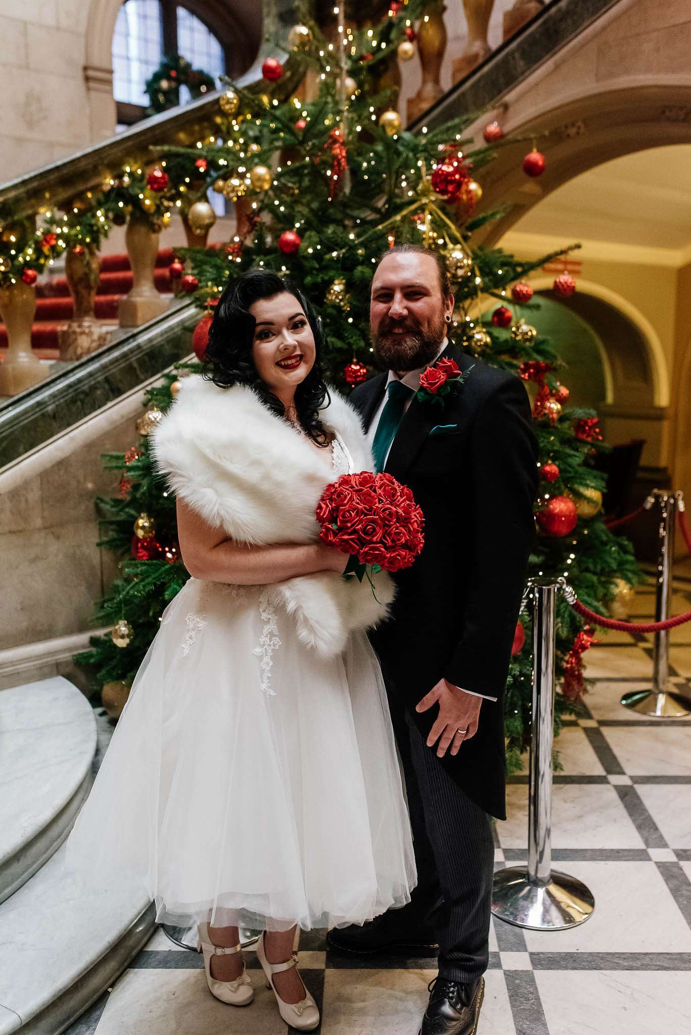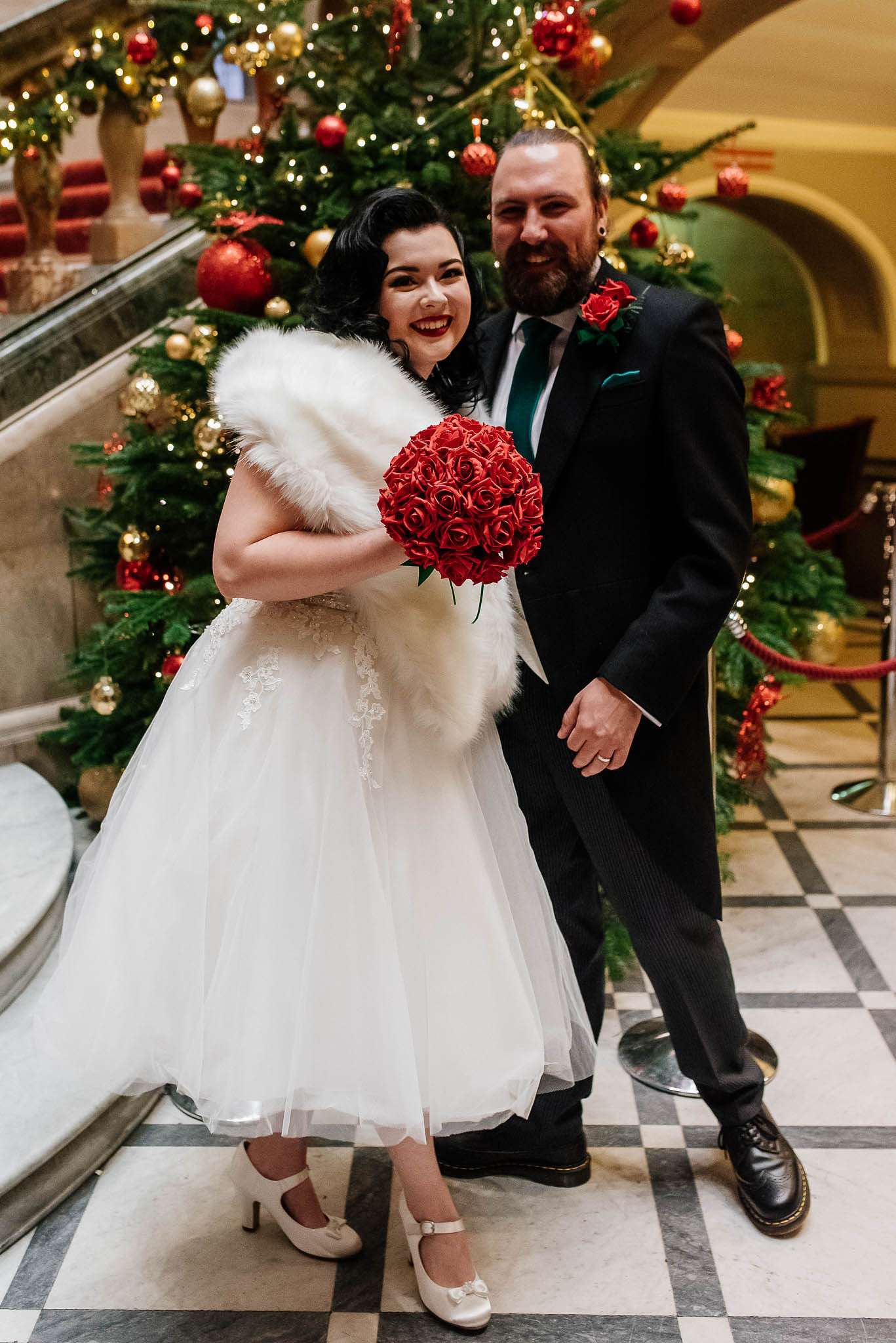 If you’ve had to postpone your summer wedding until the winter, you’re going to love the festive inspo from Jess and Tom’s December 2018 celebration. The couple had been dating since they were teenagers and ten years later Tom proposed to Jess with the most perfect 1920s emerald ring. This, and the fact that they desperately wanted to keep their early December anniversary as they’d been celebrating it so long together, inspired their festive theme, but they kept it true to their everyday style with plenty of rock n roll touches.