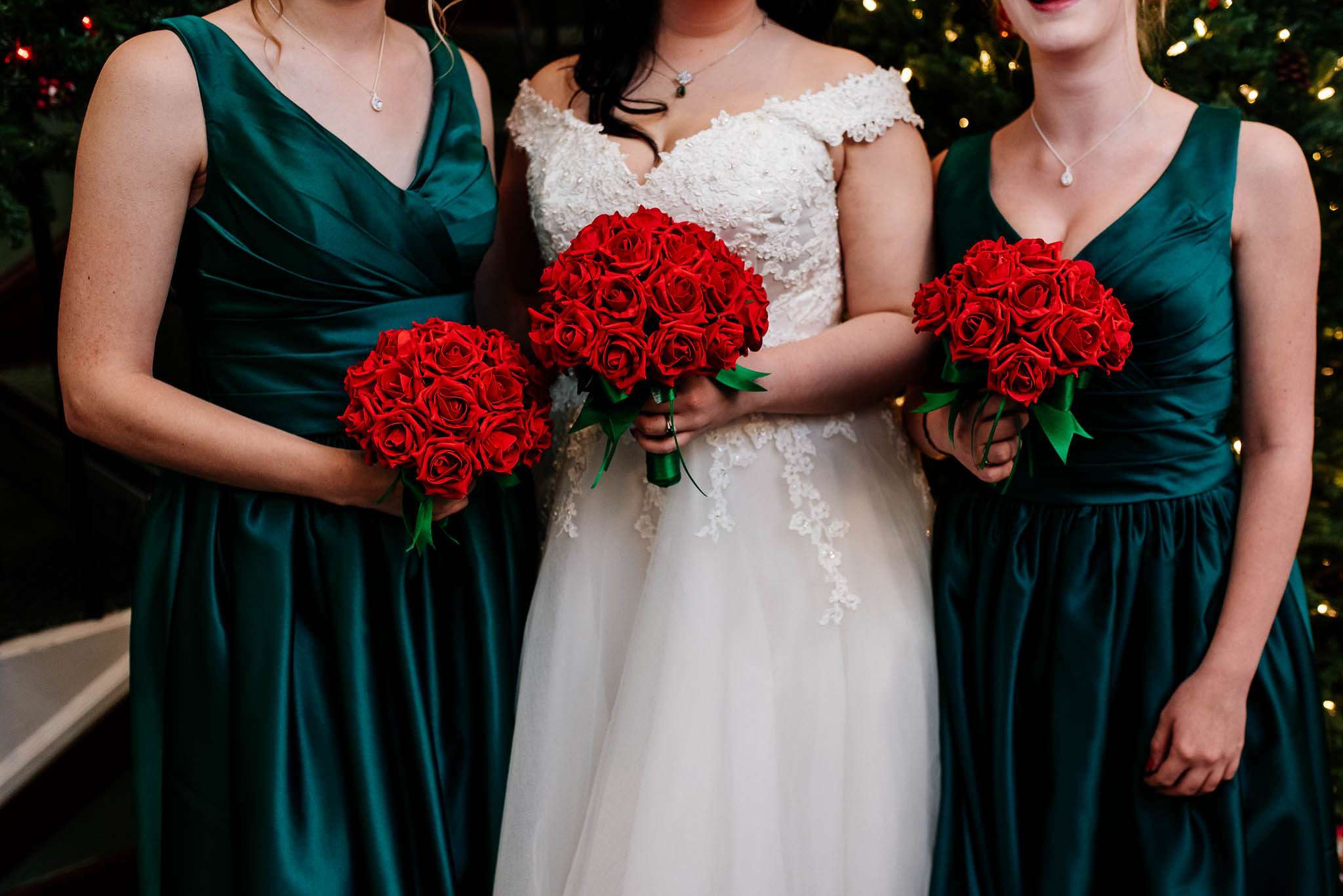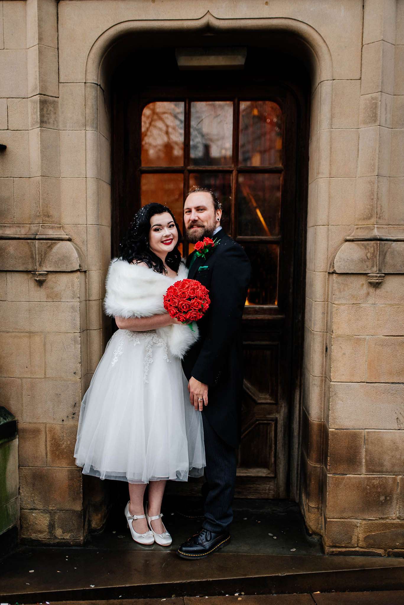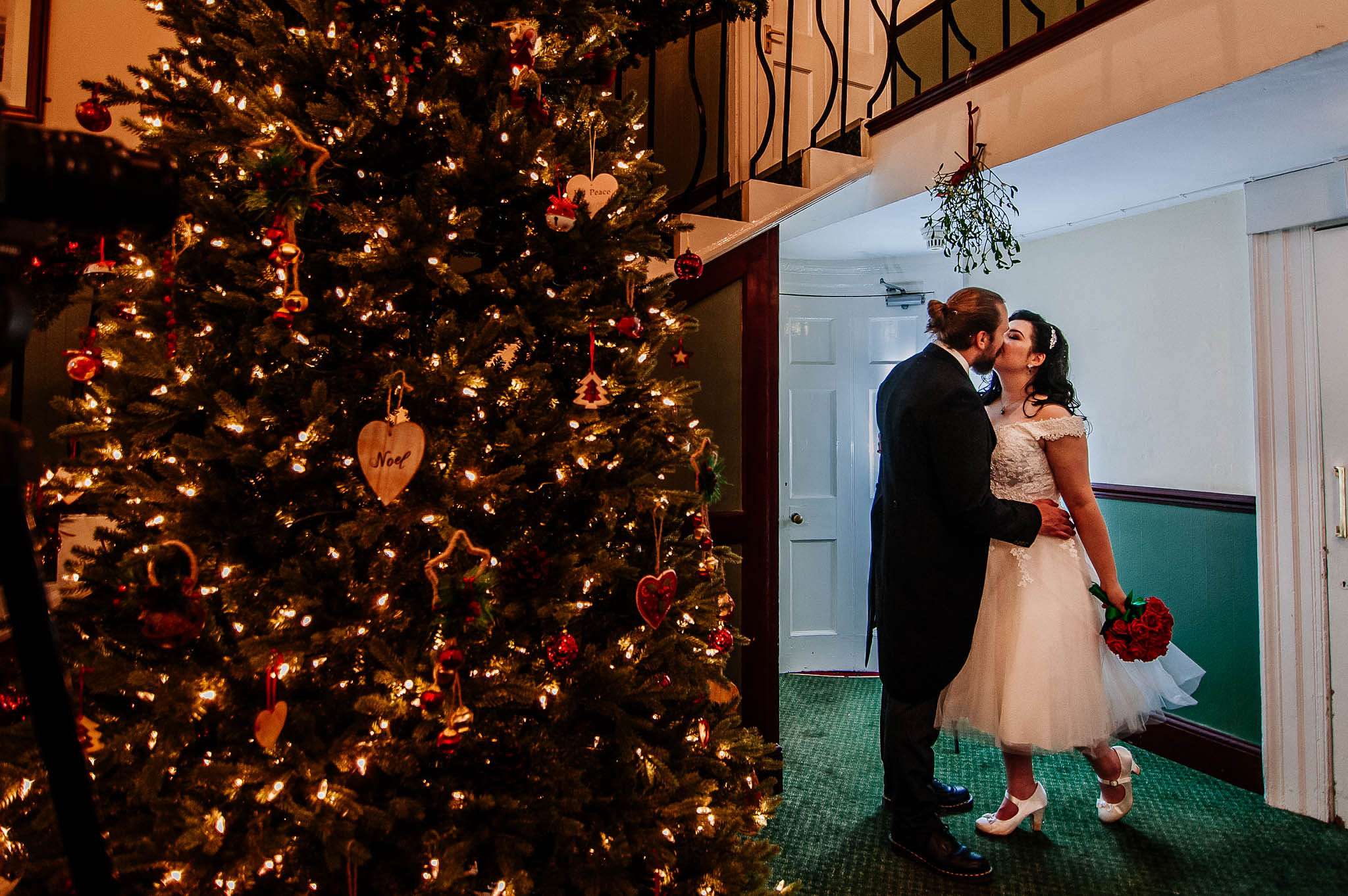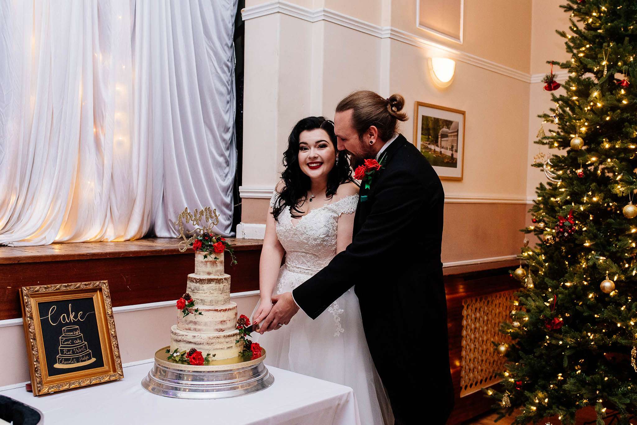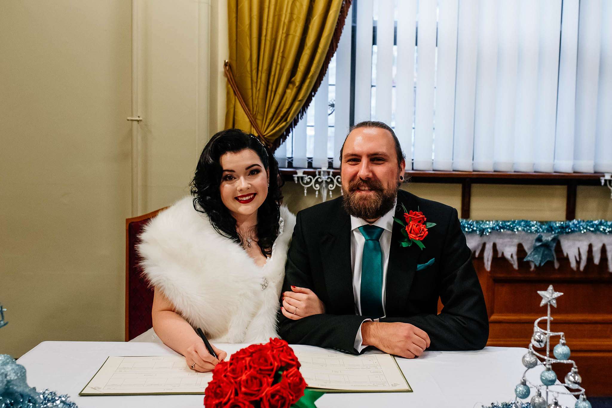 If you’ve had to postpone your summer wedding until the winter, you’re going to love the festive inspo from Jess and Tom’s December 2018 celebration. The couple had been dating since they were teenagers and ten years later Tom proposed to Jess with the most perfect 1920s emerald ring. This, and the fact that they desperately wanted to keep their early December anniversary as they’d been celebrating it so long together, inspired their festive theme, but they kept it true to their everyday style with plenty of rock n roll touches.