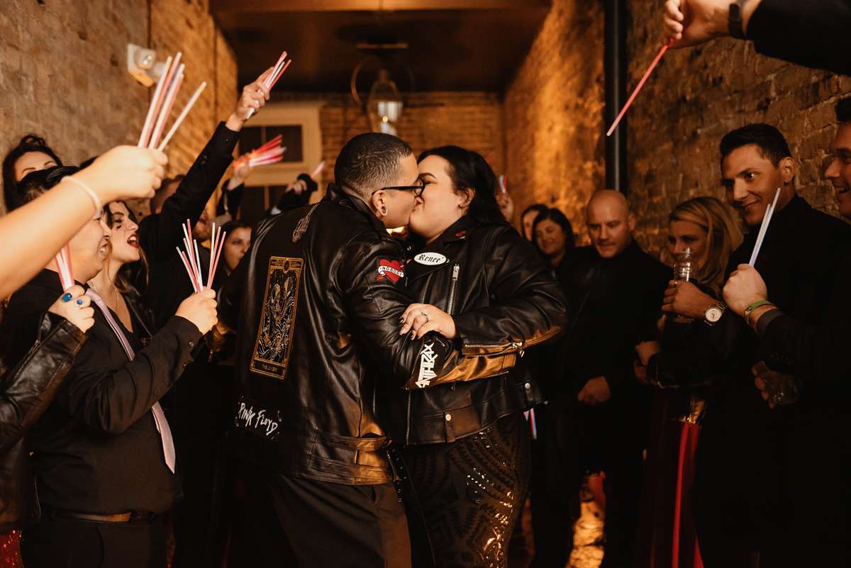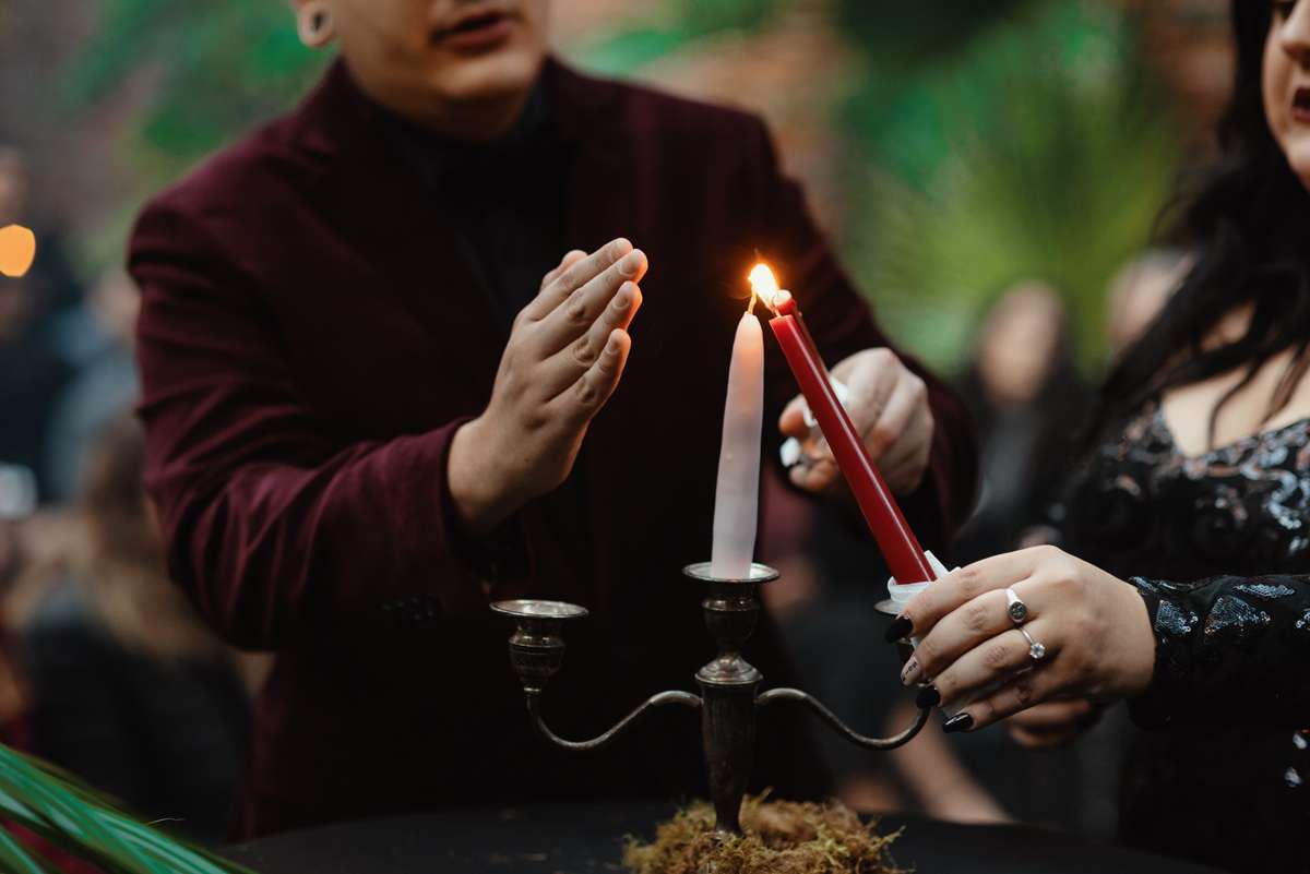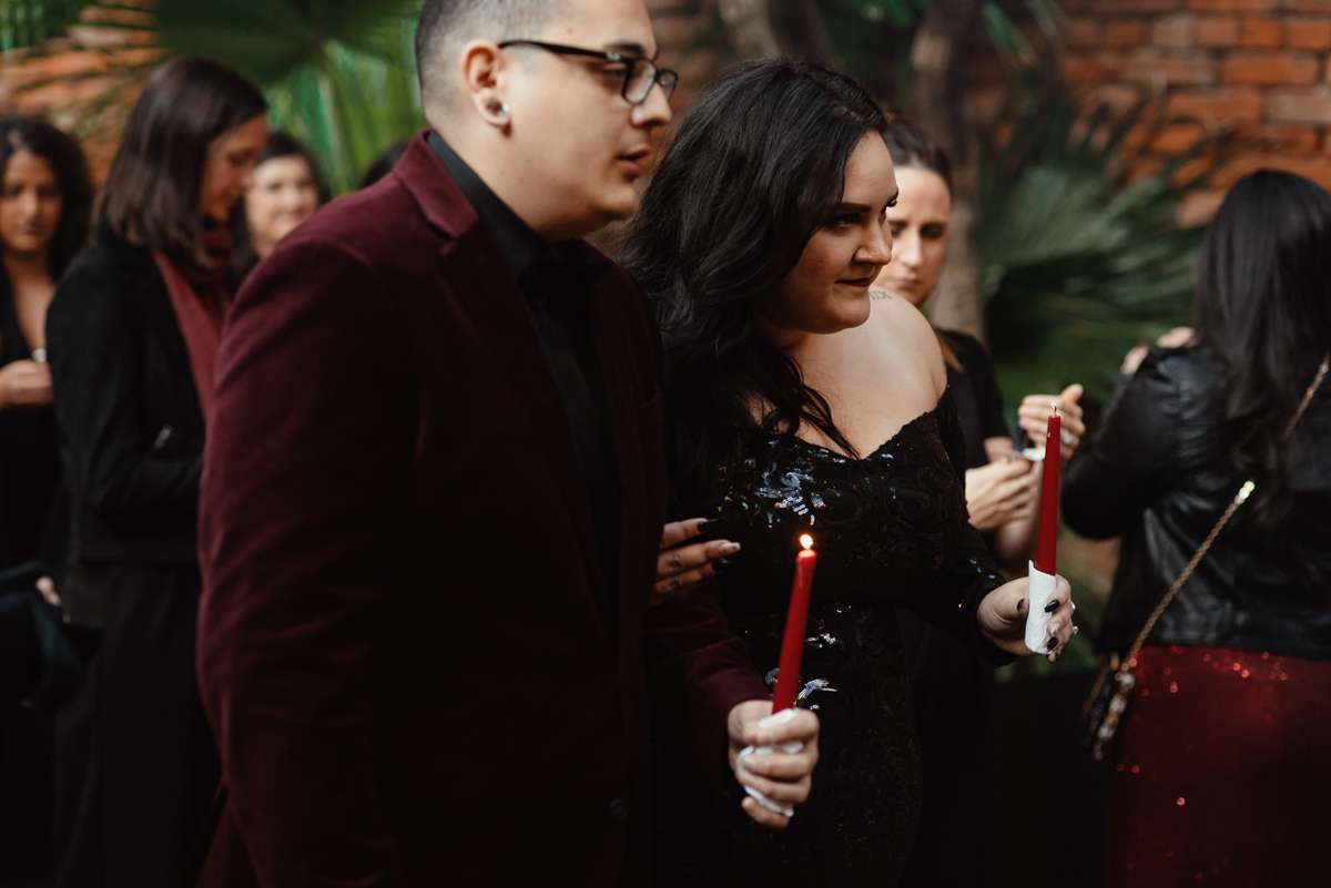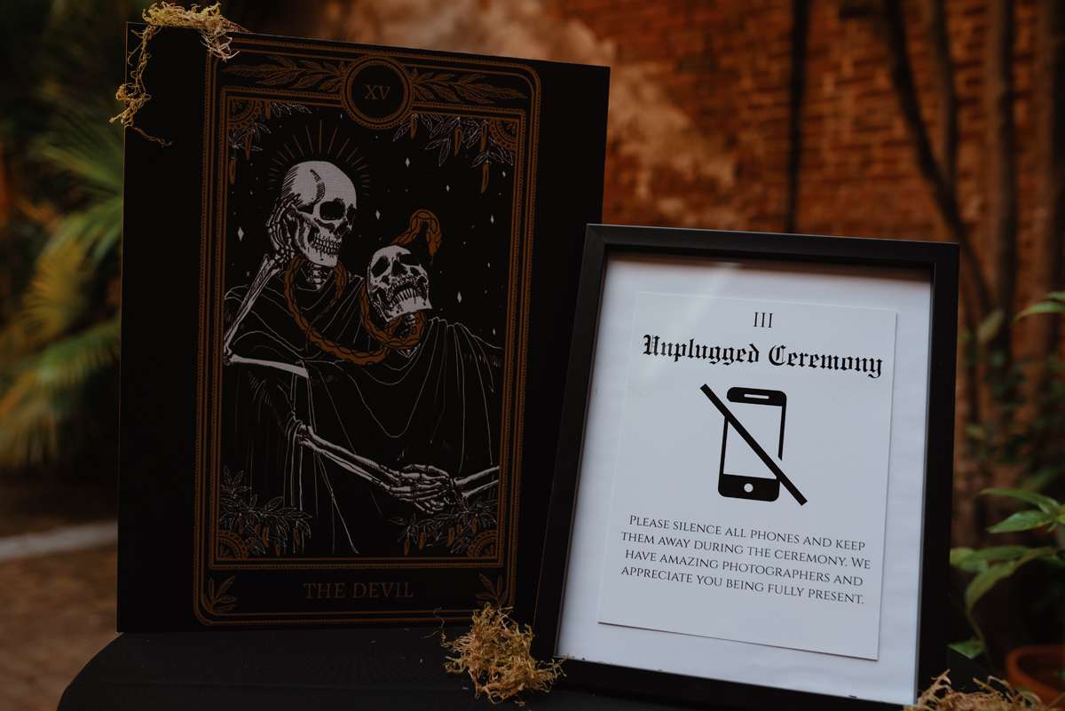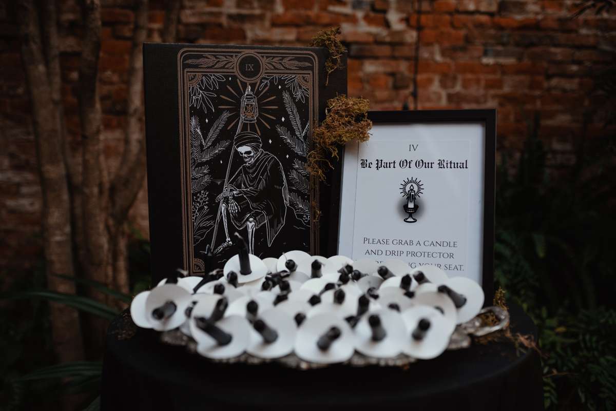 Renee and Richie love candles but aren’t big fans of flowers, so they decided to not have any at their November wedding. Instead they incorporated fog machines, smoke bombs and candles to create a spooky ambience on the day. The bridesmaids carried incense burners, and as the couple walked up the aisle to be wed, they lit candles held by their guests to guide them. They were also heavily inspired tarot cards, incorporating them in the invitations, signs and centrepieces at the reception.