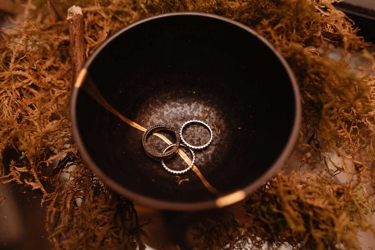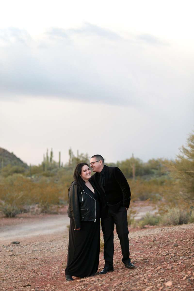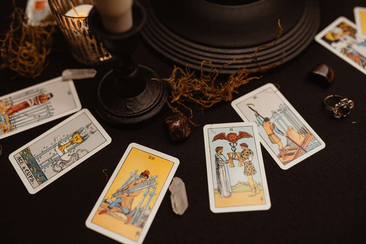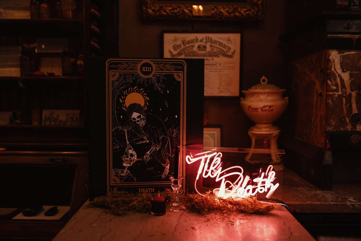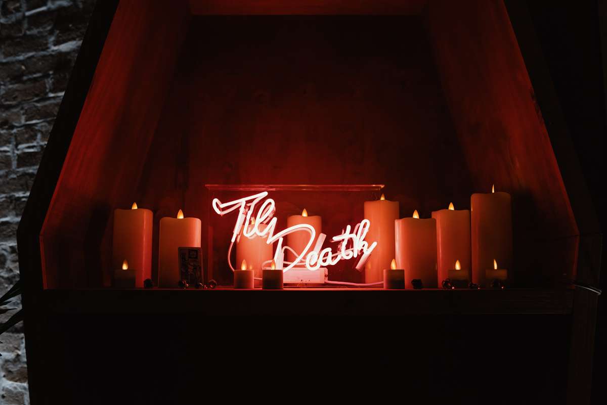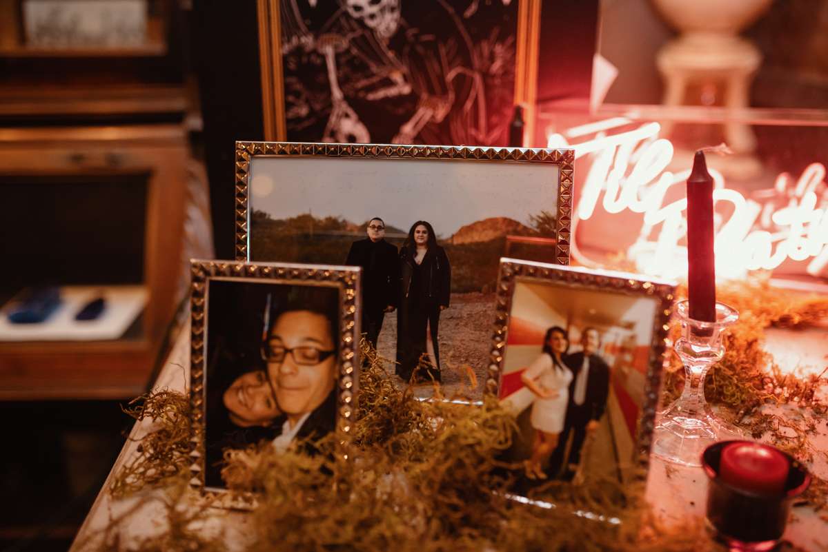 Renee and Richie love candles but aren’t big fans of flowers, so they decided to not have any at their November wedding. Instead they incorporated fog machines, smoke bombs and candles to create a spooky ambience on the day. The bridesmaids carried incense burners, and as the couple walked up the aisle to be wed, they lit candles held by their guests to guide them. They were also heavily inspired tarot cards, incorporating them in the invitations, signs and centrepieces at the reception.