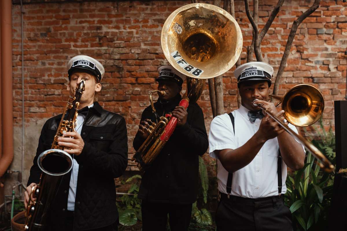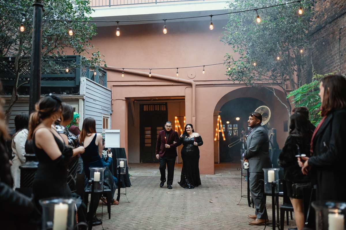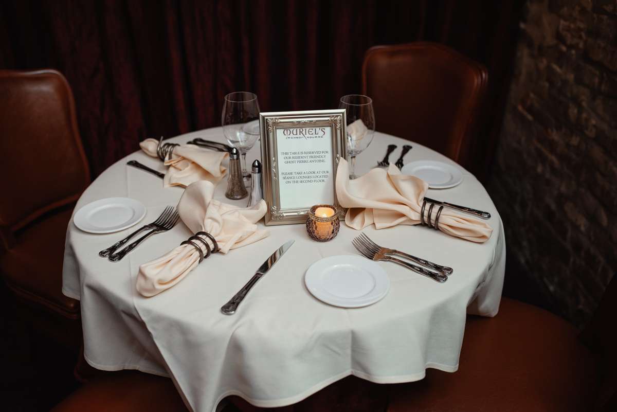 The ceremony featured a local brass band playing New Orleans classics such as A Kiss To Build A Dream On by Louis Armstrong and following their pronouncement as husband and wife, the band paraded them to their reception, right through New Orleans famous Jackson Square and into Muriel’s where a table is always kept set for their in-house ghost.