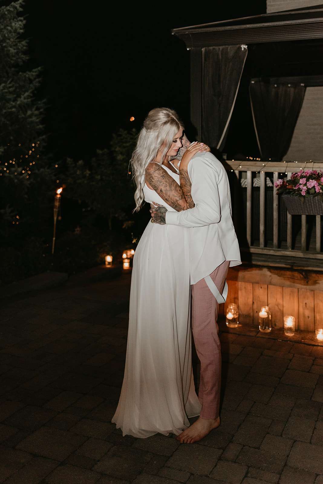 “We cut costs by cooking our own buffet style dinner for our guests”, she continued, “and the most expensive part was the photographer, and they were worth every penny! The only ‘bad’ part of the wedding was because we planned it so quickly, not all of Myles’ friends and family could fly over from England and attend. That being said, our wedding day was absolutely perfect and we wouldn’t do anything differently.”
