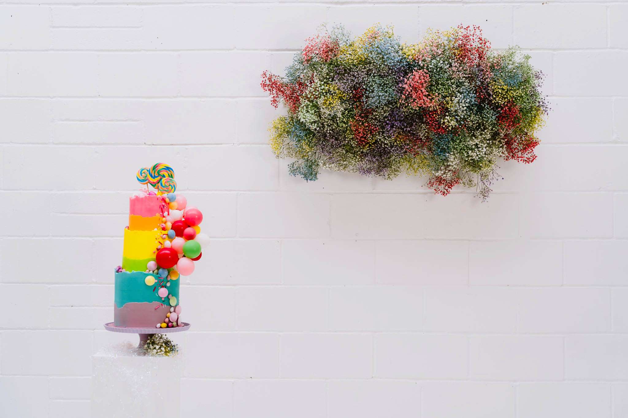 We worked with a couple of new team members this time too. Cat of Cat Food Cakes made us the most awesome rainbow cake, while Katherine of Katherine Bly Floral Design took the brief and ran with it, creating us these stunning cloud-like installations made from dyed gypsophila.